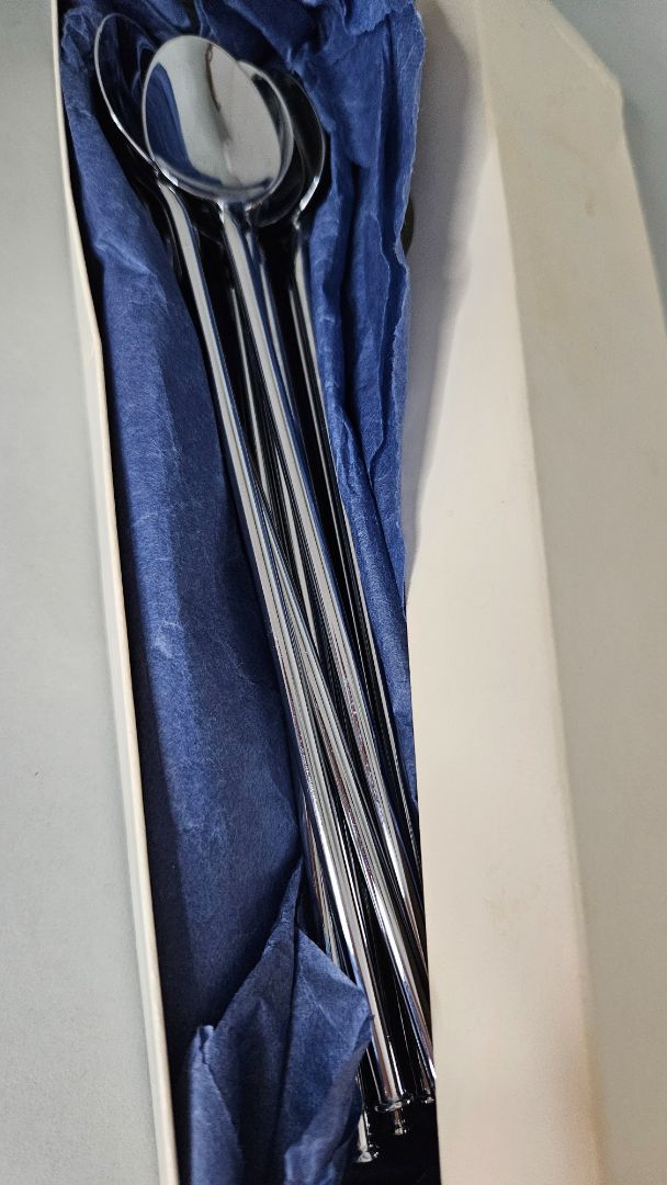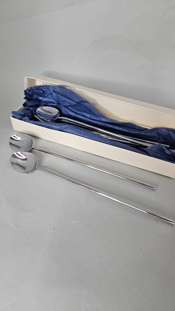 9 pcs steel cocktail spoons / Irish Coffee spoons in original packaging. The spoons are long and have a tube shape. Sold all together.