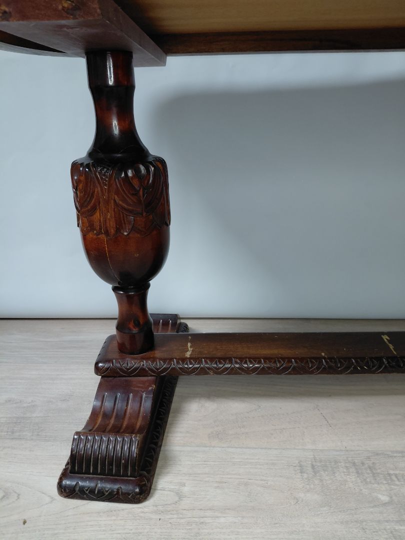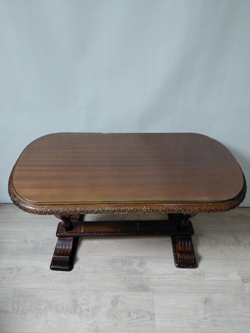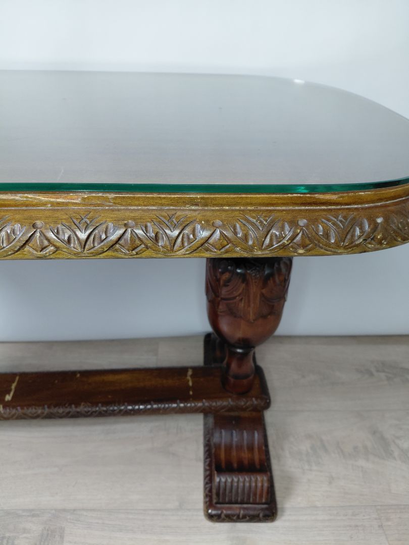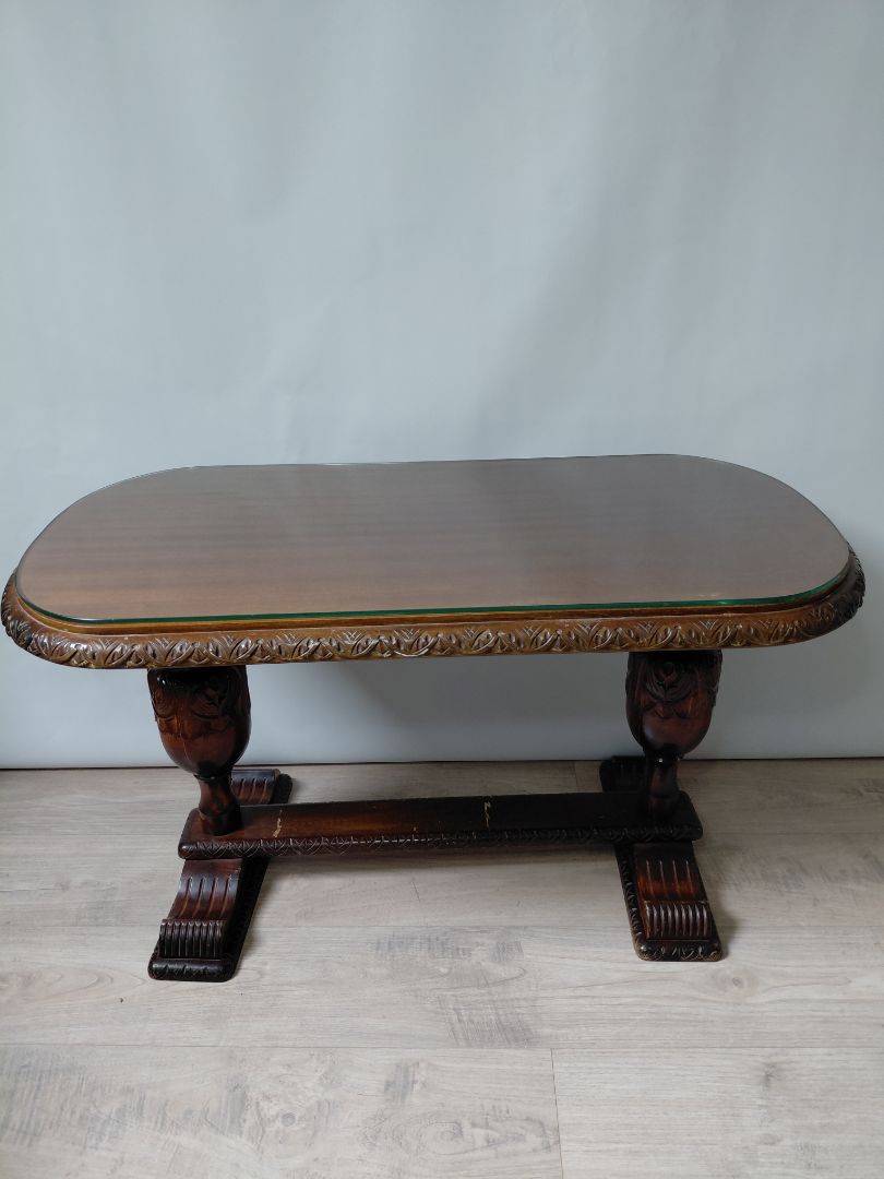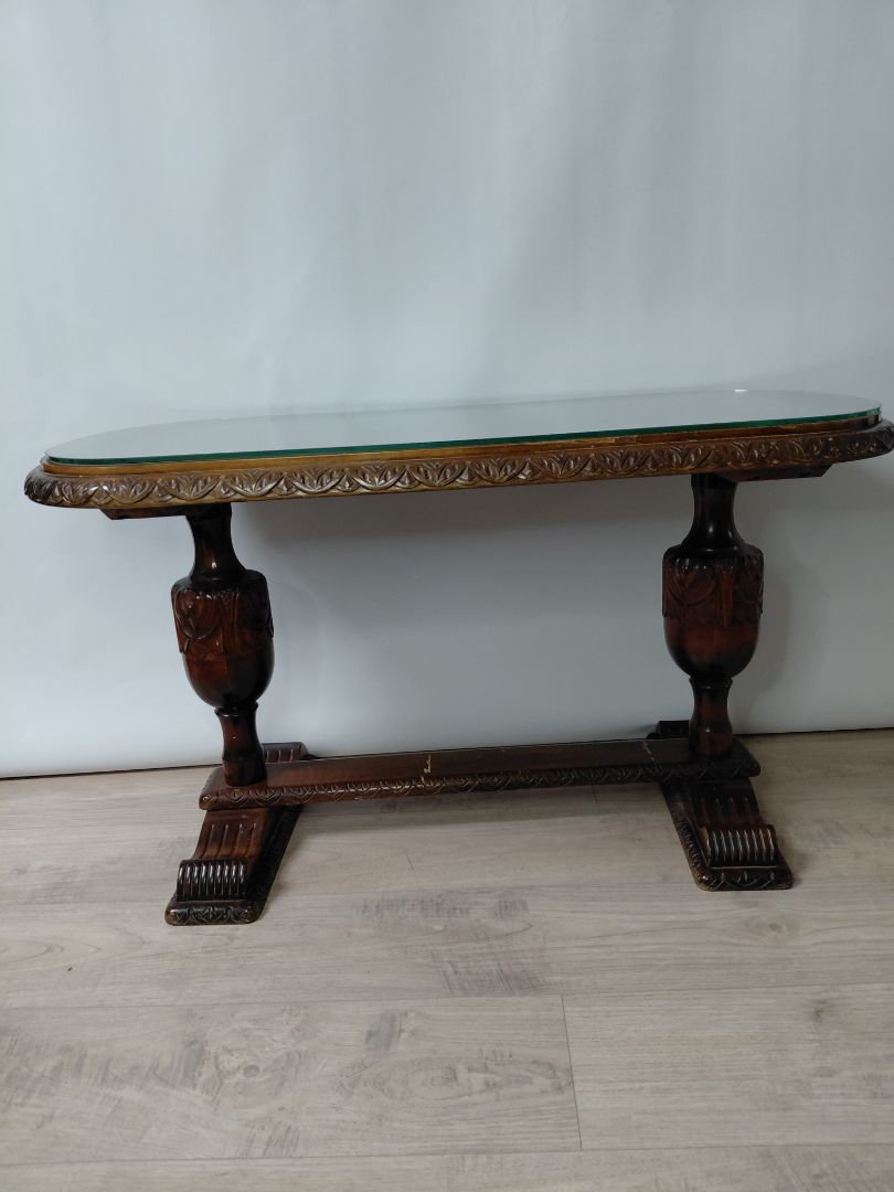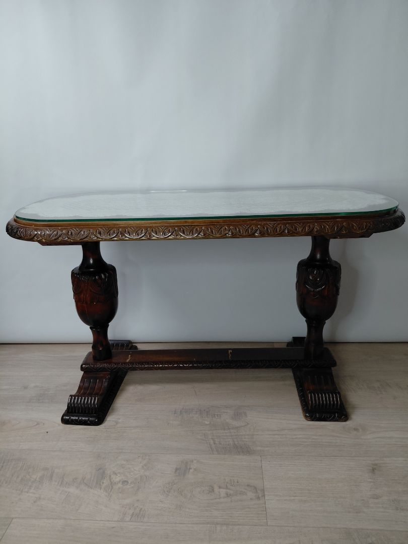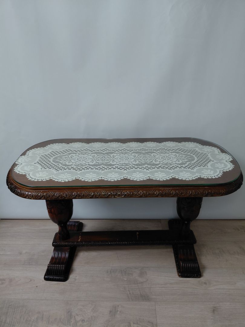 Ílangt antík (1930ish) stofu borð með glerplötu ofan sem er hægt að fjarlægja. Glerplatan liggur laus ofan á líklegast til þess að hlífa dúknum eins og tíðkaðist í gamla daga. Borðið er fallega úðtskorið á fótum og borðkanti, líklega úr eik, hnotu, eða rósarvið. Eitthvað af rispum er á fótum, sjá myndir. Heklaði dúkurinn fylgir með.