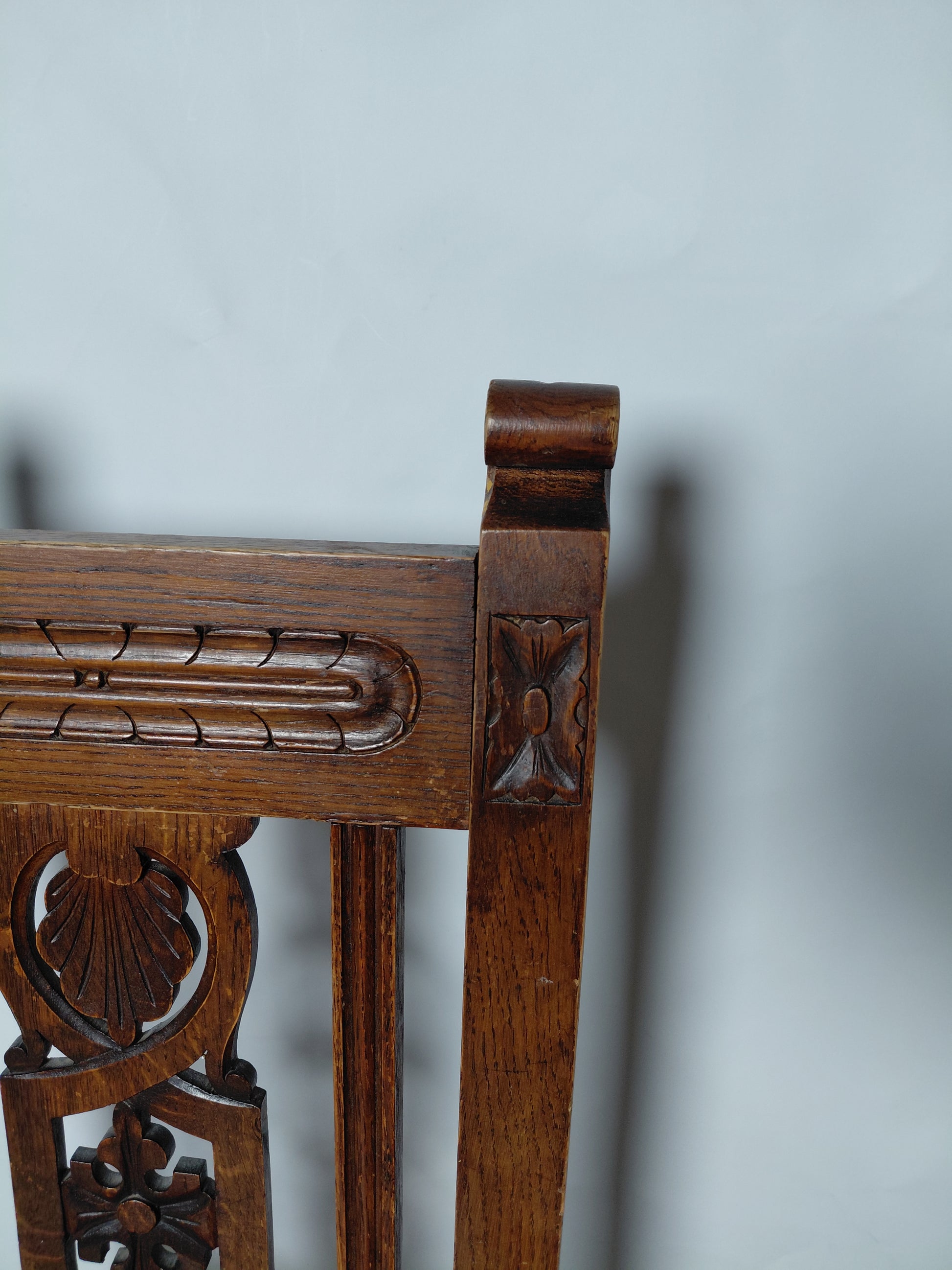 Fallegur útskorin stóll í Jacobean stíl og líklegast frá árunum 1900-1920. Aftari fætur stólsins koma í boga. Sessan er klædd að öllum líkindum ekta leðri. Þessi stóll var keyptur í antík verslum kringum árið 2000.