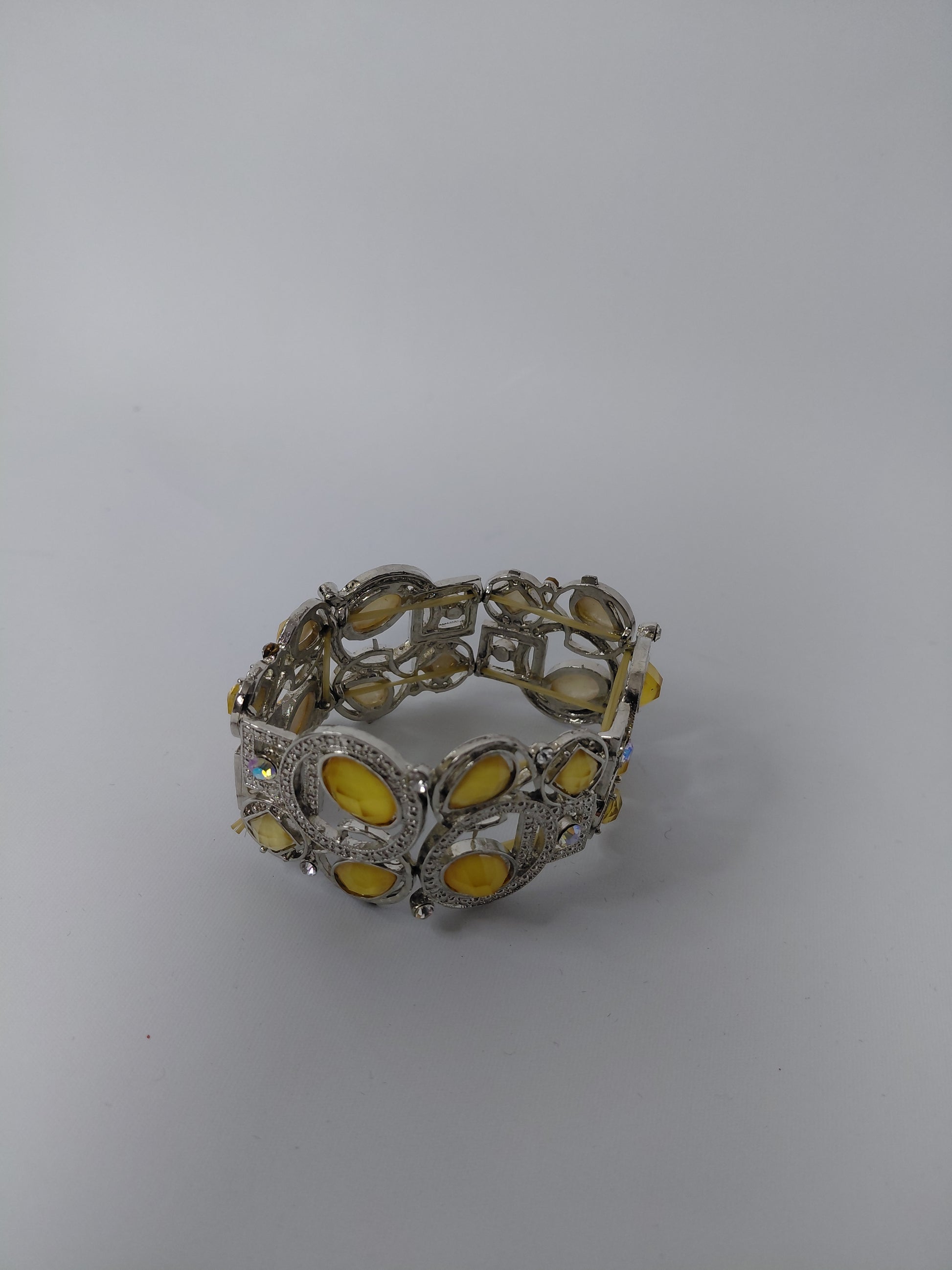 Fallegt armband skreytt gulum og hvítum steinum sem eru þræddir á teygju. Ekki er vitað um aldur og uppruna.