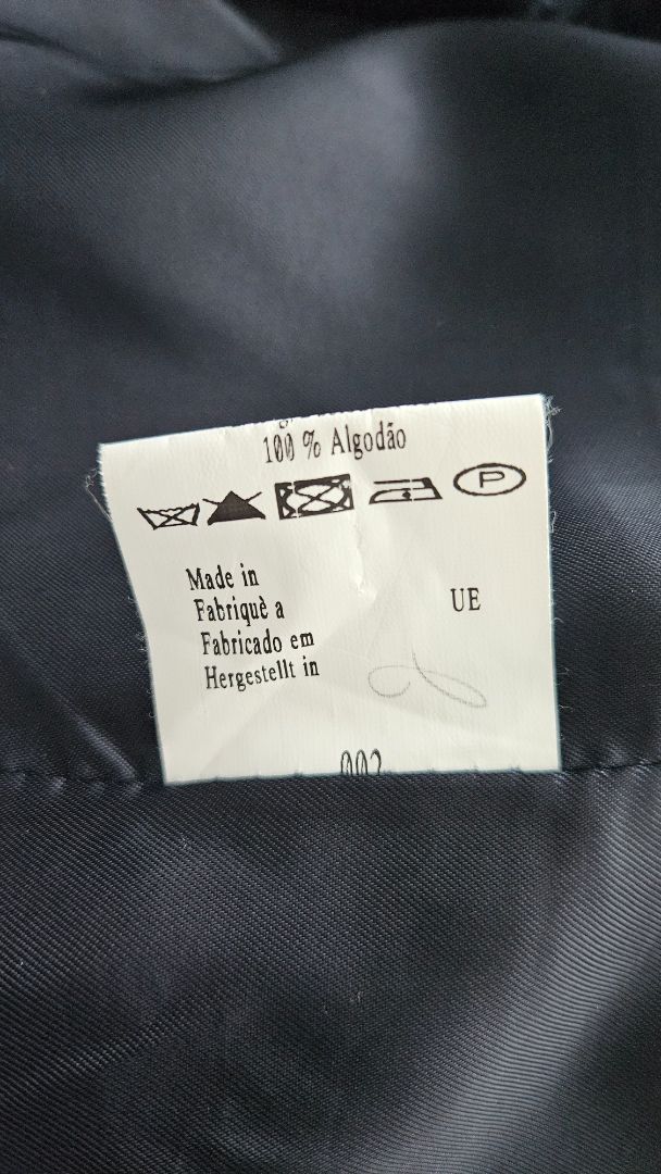 Dark blue blazer with a pattern on the chest, one side, and gold buttons.