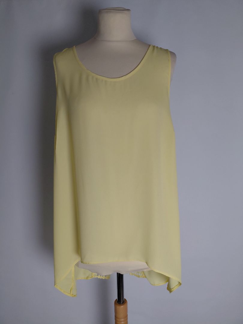 Yellow sleeveless blouse with lace and a 28.5 cm slit at the back. The blouse is shorter in the front than in the back.