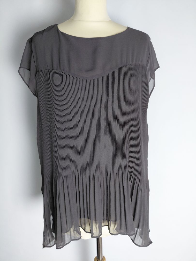 A stone gray blouse buttoned at the back at the neckline, lined on the inside with gray lining. Since the blouse is in a harmonic cut, its dimensions are very flexible.