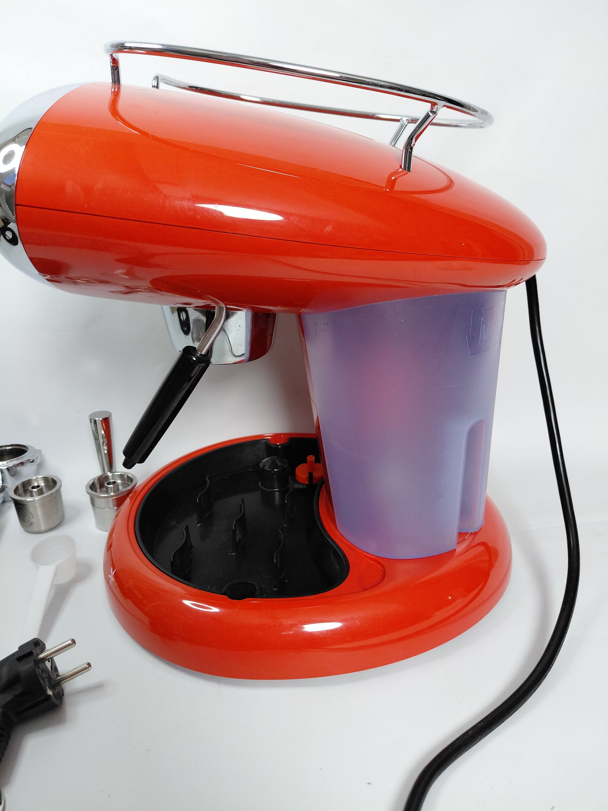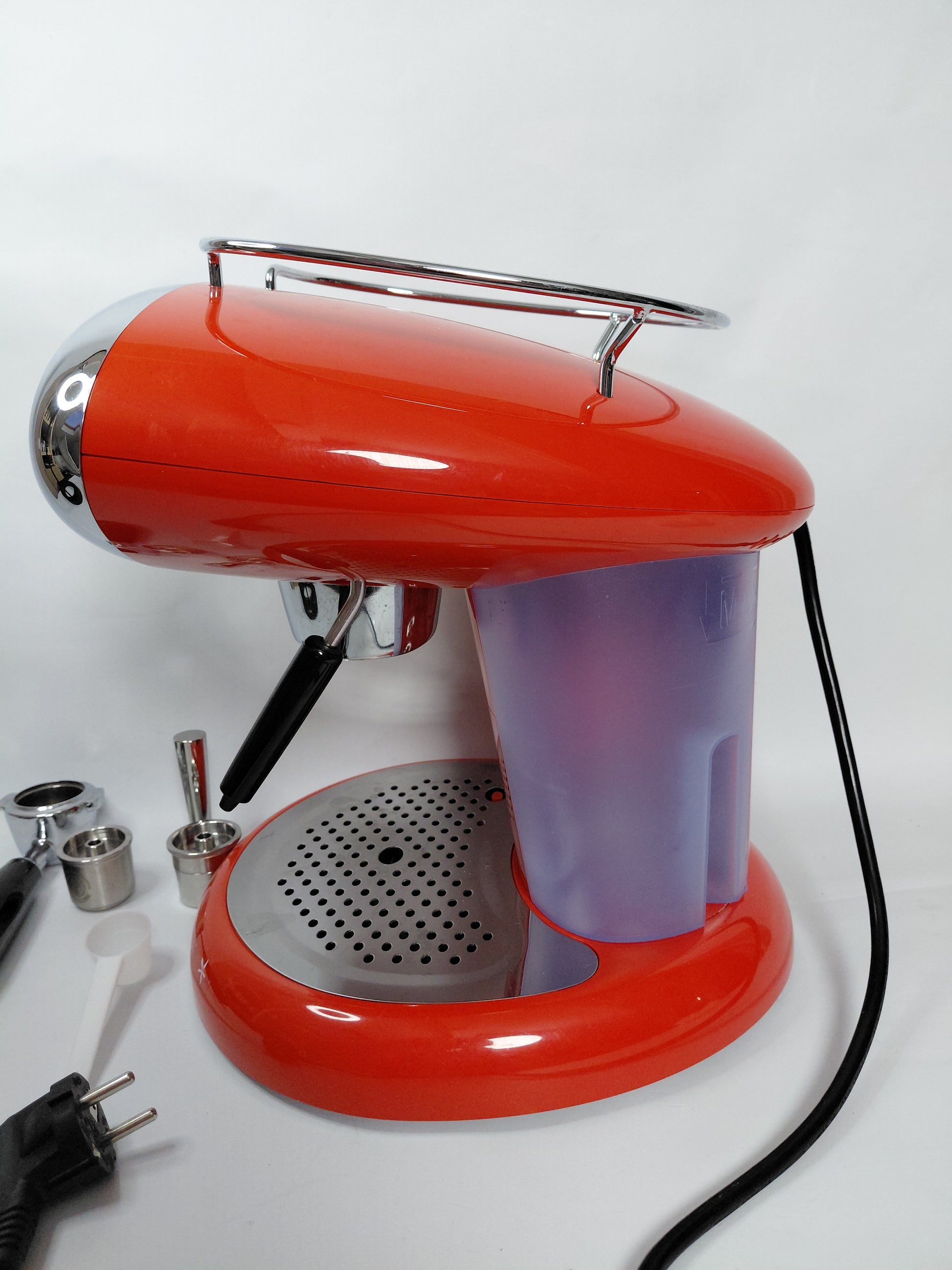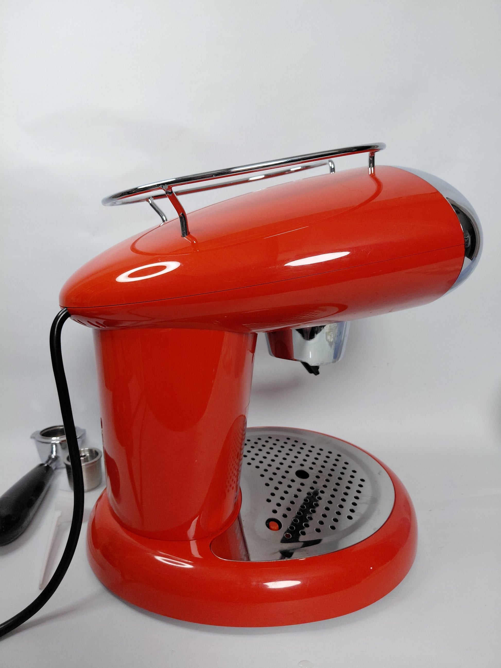 Fallega rauð og króm espresso kaffivél með mjólkurflóara frá Illy ásamt aukahlutum. Tvö kaffihylki fylgja með, eitt fyrir einnota hylki og annað fyrir fjölnota.