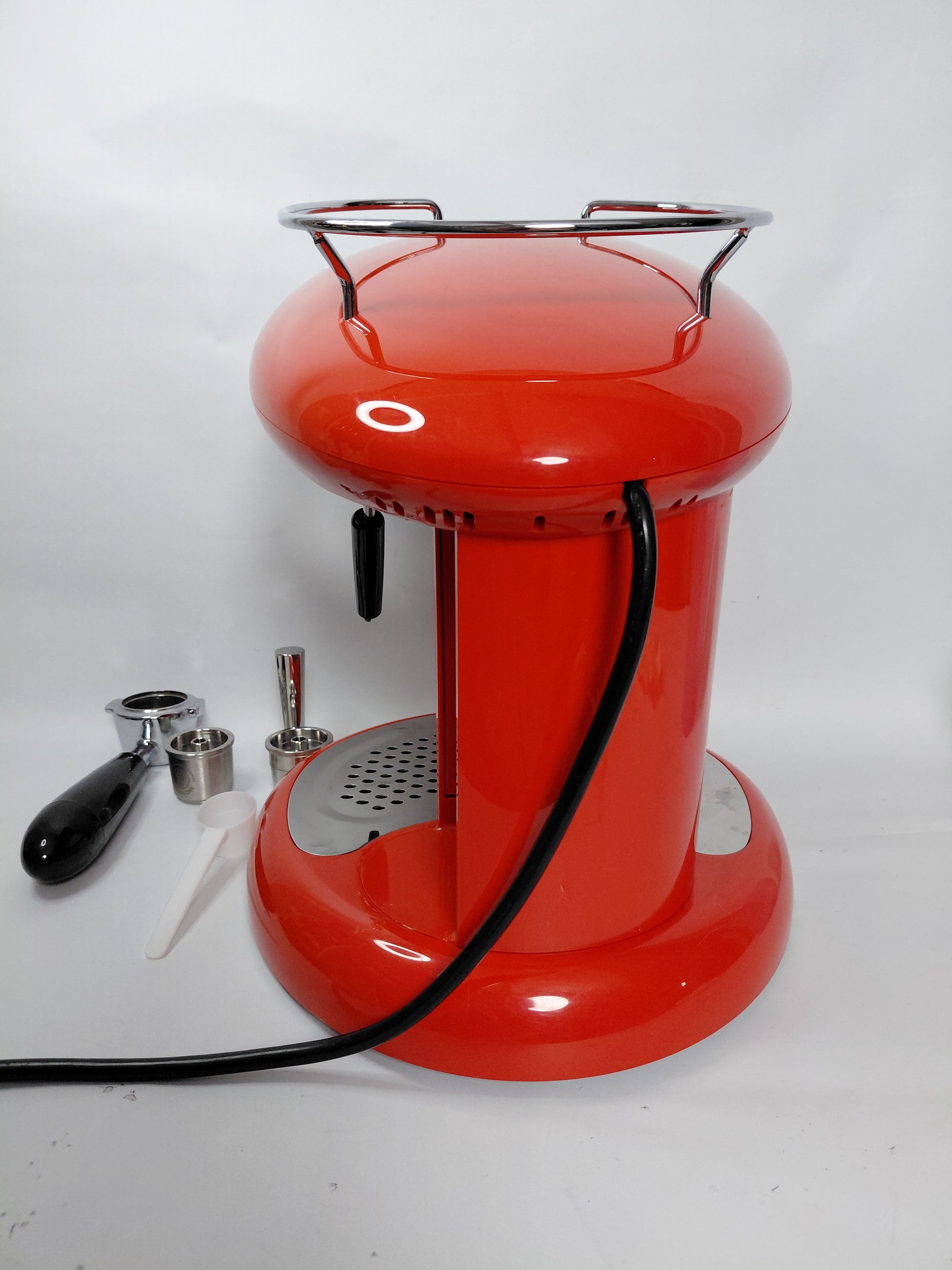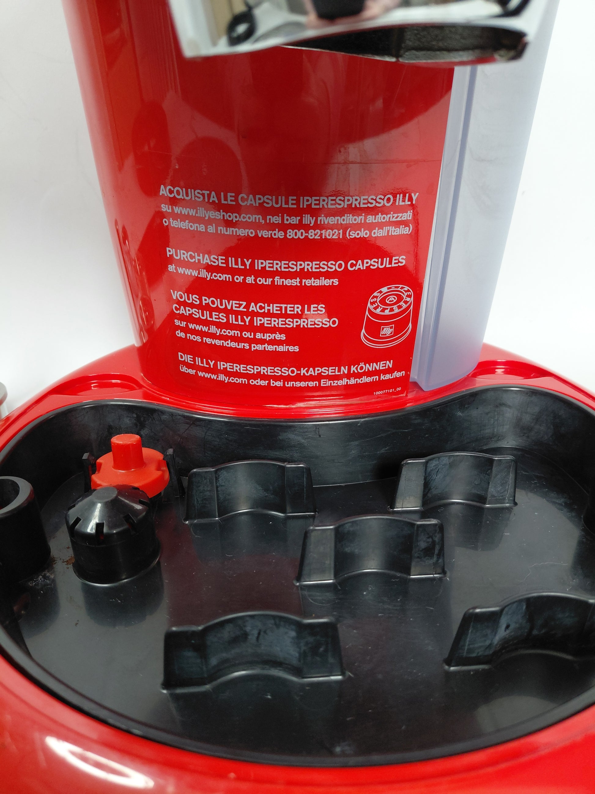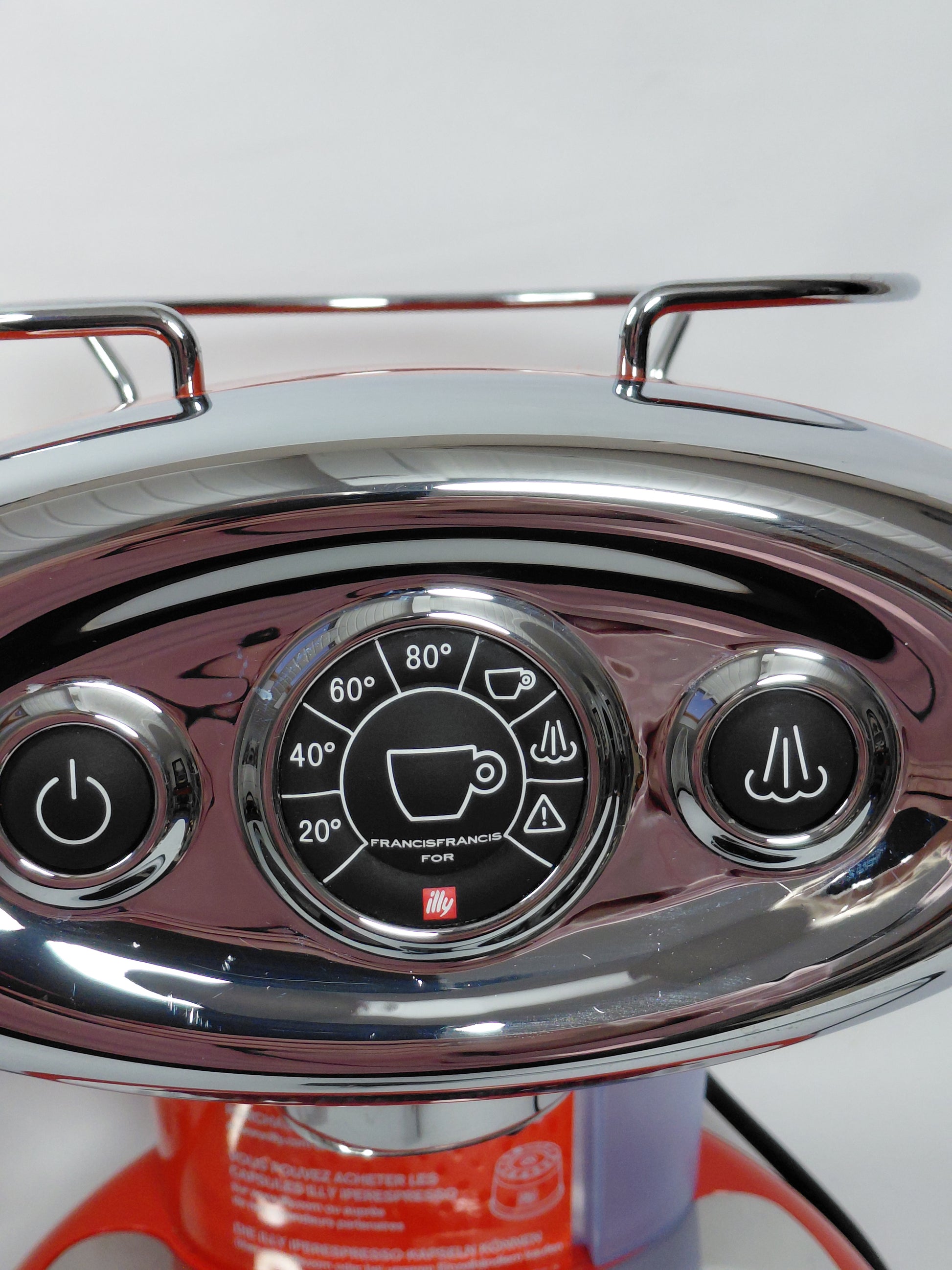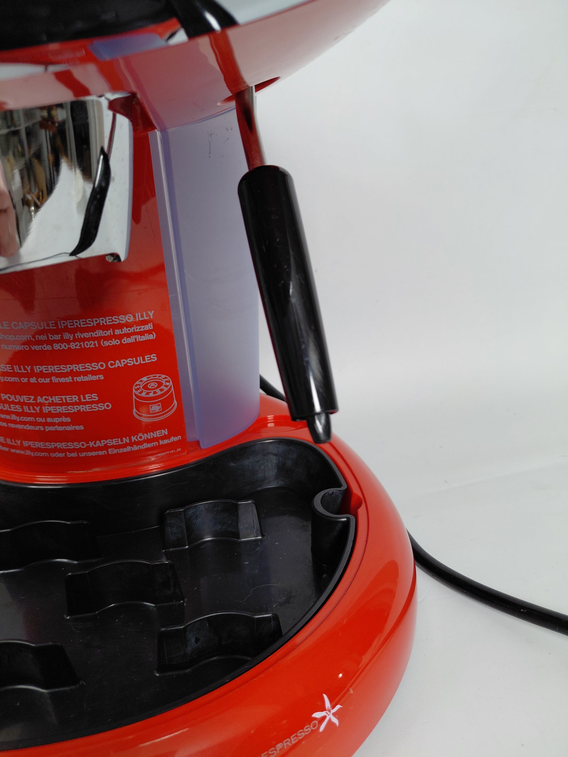 Fallega rauð og króm espresso kaffivél með mjólkurflóara frá Illy ásamt aukahlutum. Tvö kaffihylki fylgja með, eitt fyrir einnota hylki og annað fyrir fjölnota.