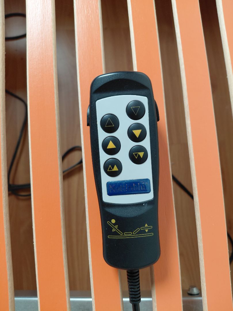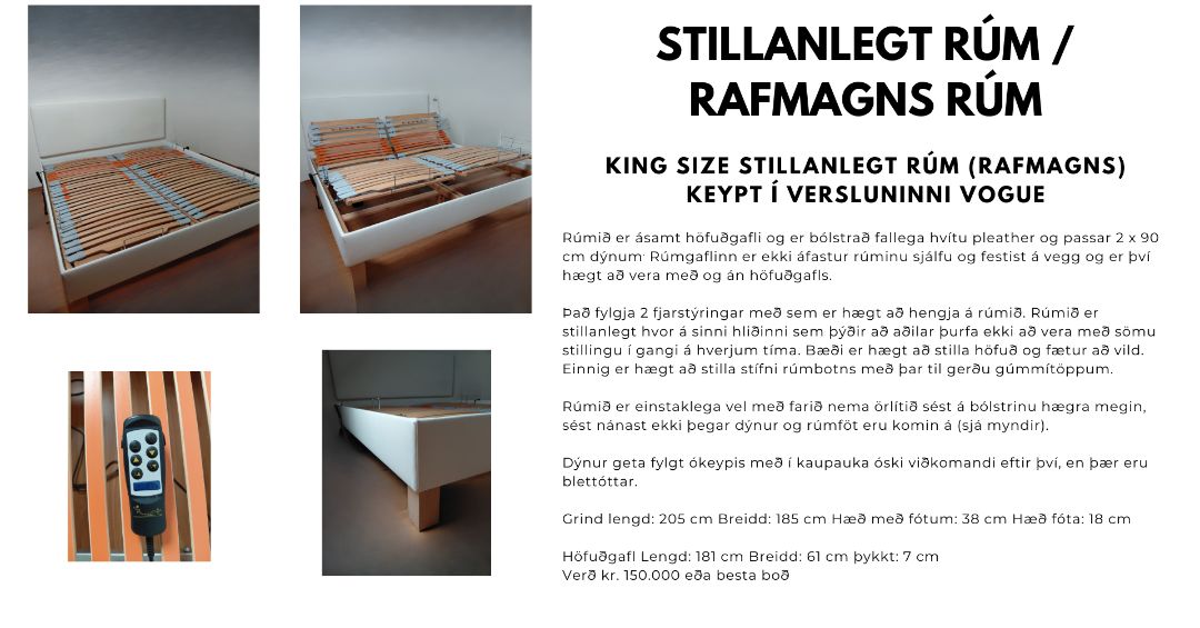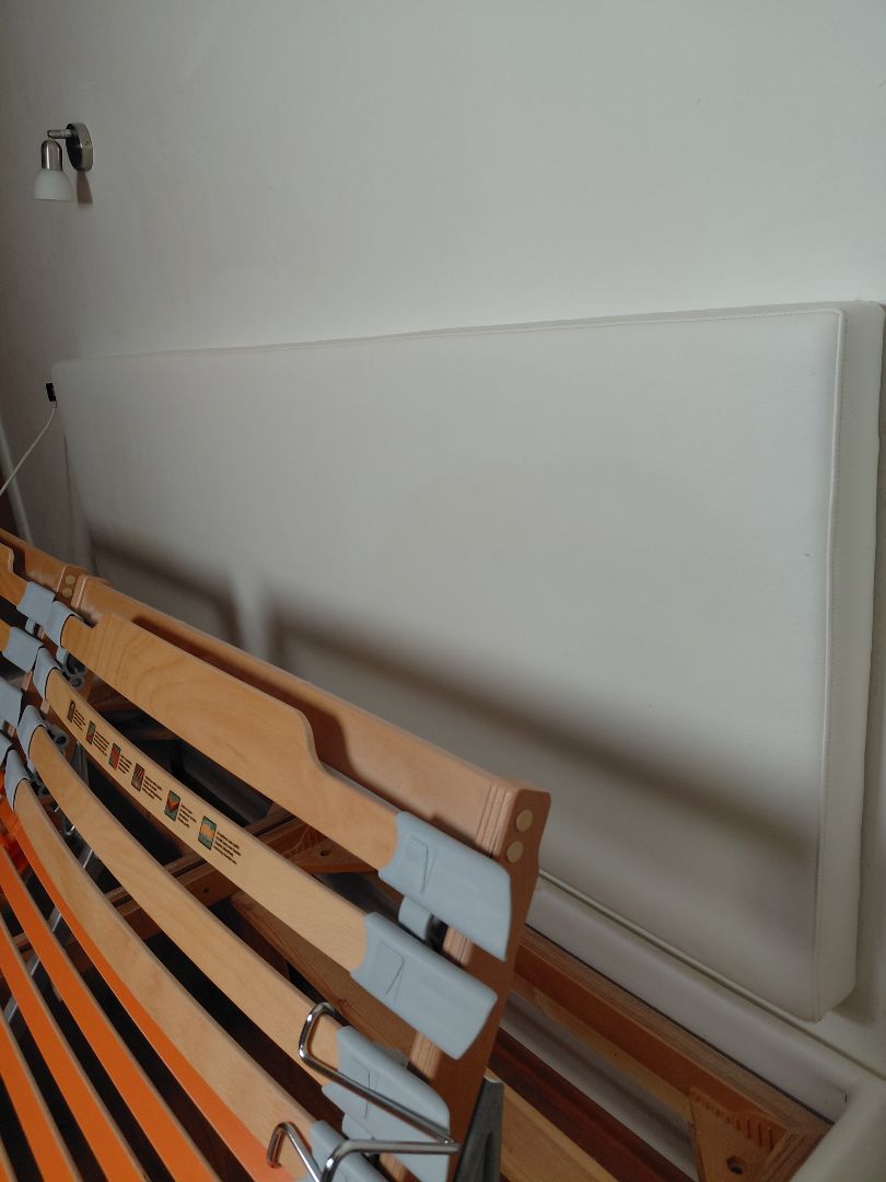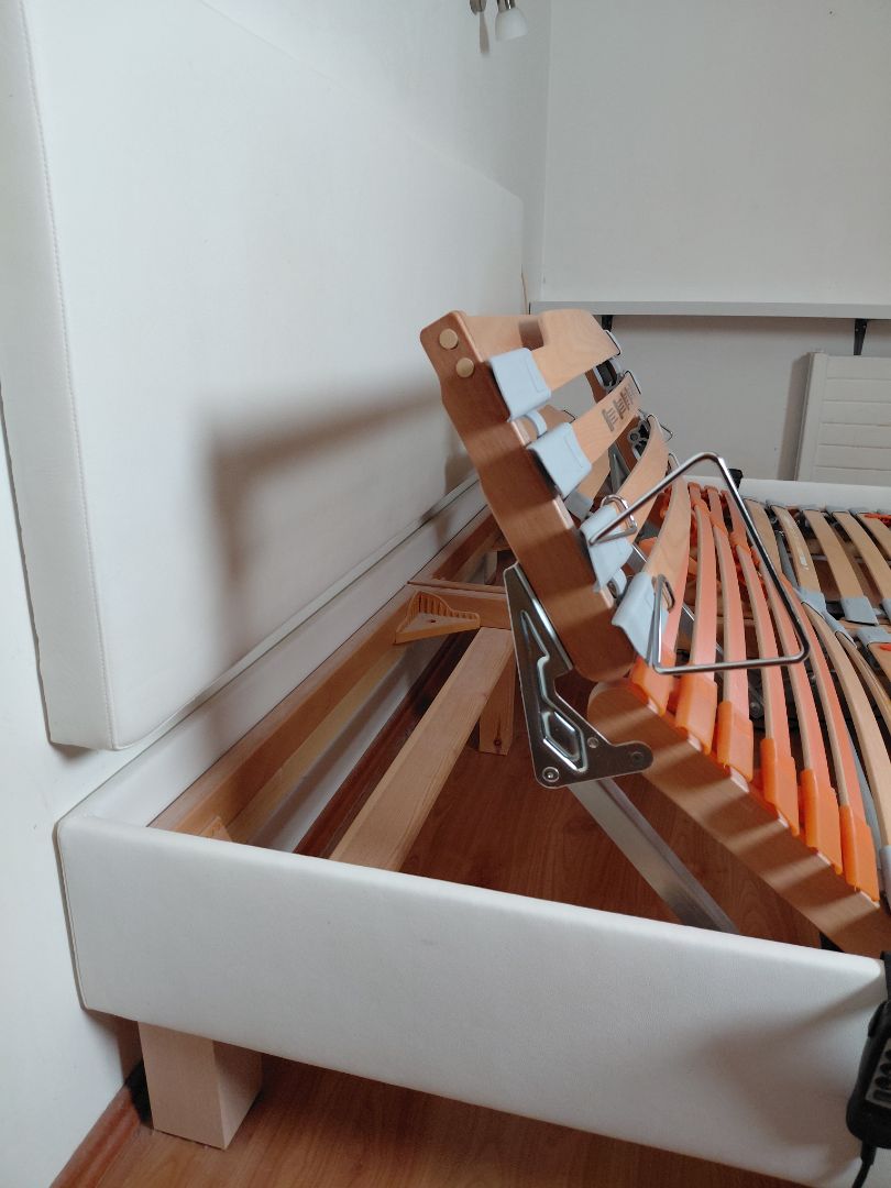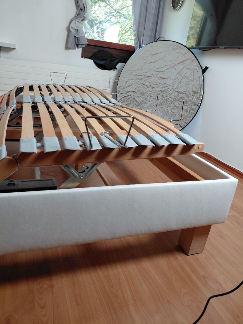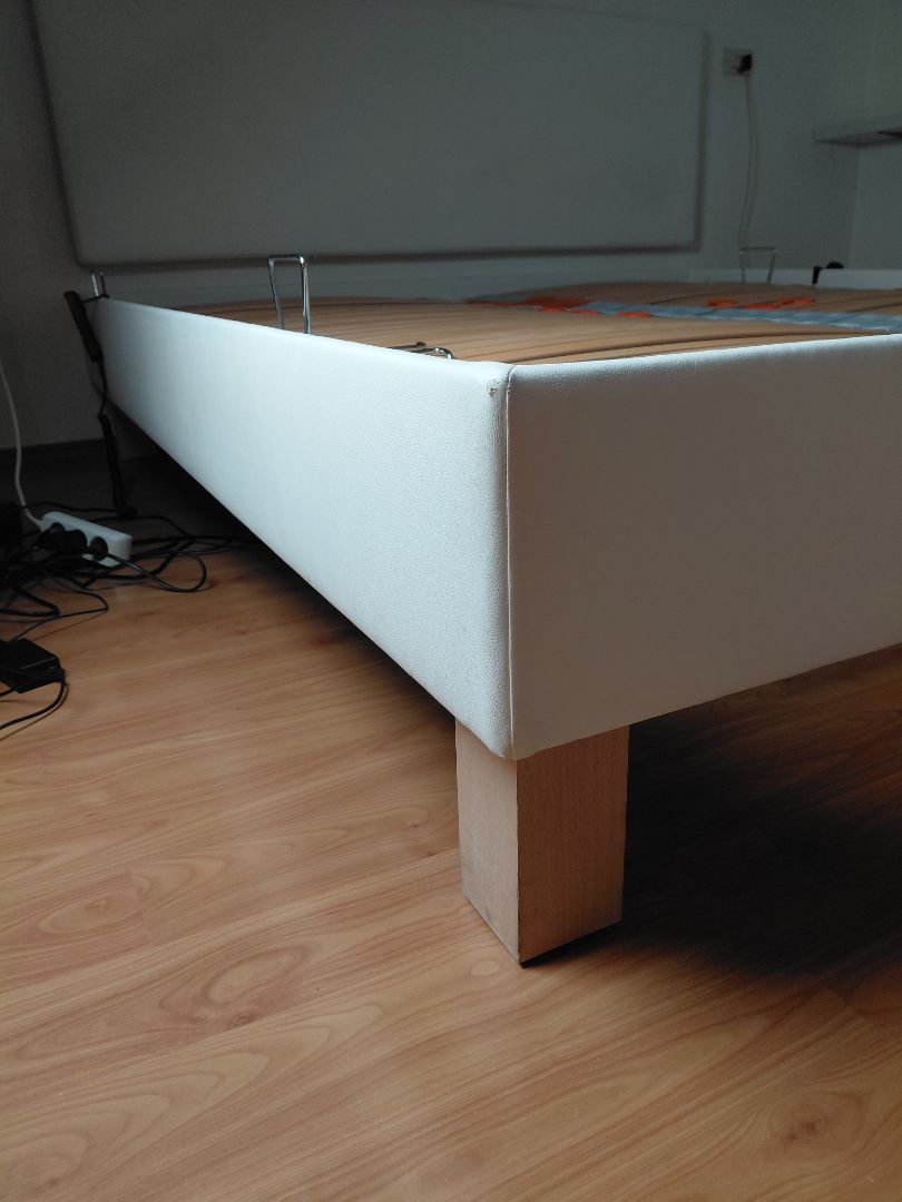 King size electric bed with a white pleather headboard and bleached oak legs purchased at Vogue. The headboard is not attached to the bed itself and is attached to the wall. The bed fits two 90 cm mattresses and is adjustable on each side so that the parties can have a different position each time. Both the head and feet can be adjusted as desired. The firmness of the bed can also be adjusted with a kind of rubber. Two remote controls are included and can be hung on the headboard.
