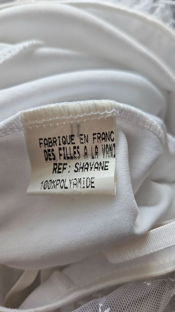 White lace dress with attached white petticoat. This dress is not marked in size but we rate it as XS.