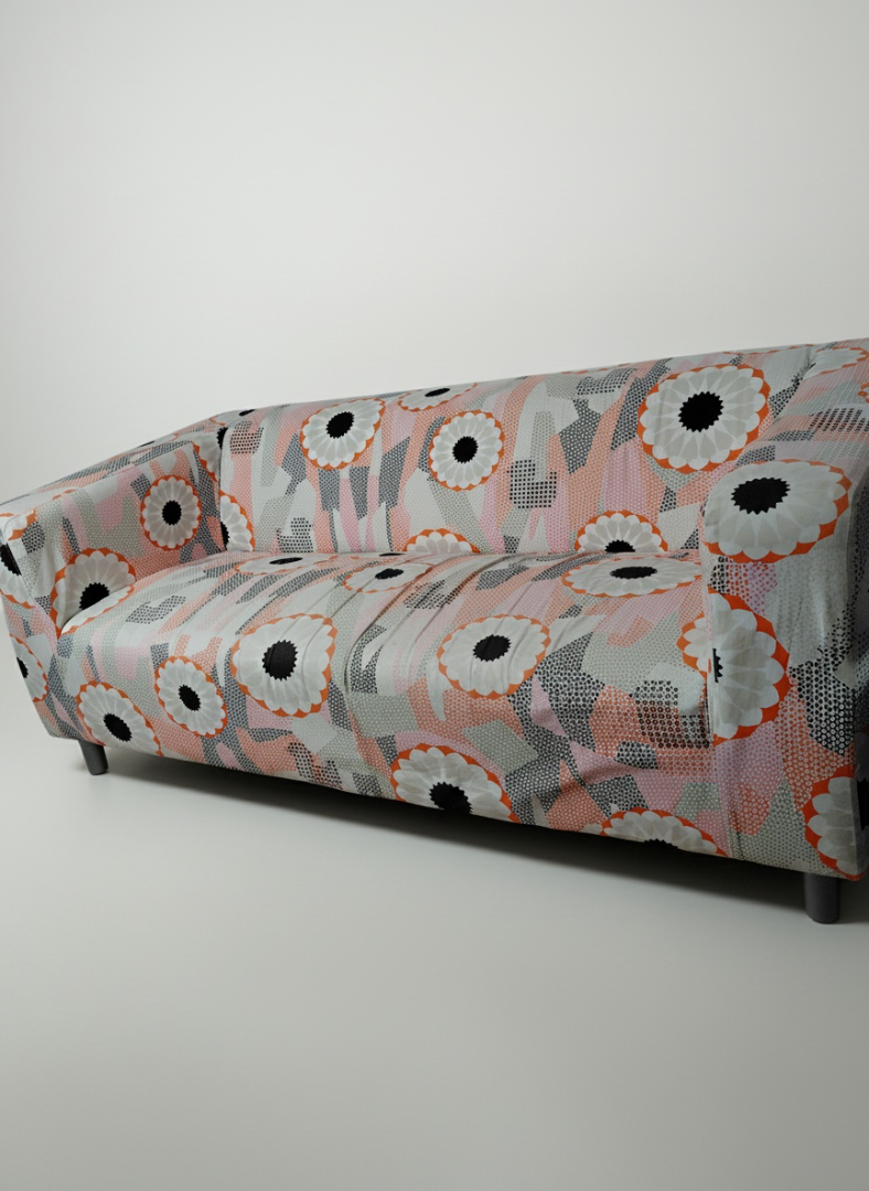 Tveggja manna Klippan sófi með áklæði sem var hannað í takmörkuðu