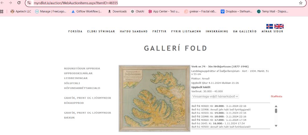 A landscape map of Ísafjarðarður counties drawn and published by Jón Hróbjartsson in 1931. The map is not framed. This is a historical artifact. The same map, but slightly smaller, was sold at auction at Gallerí Fold in 2024 for ISK 20,000.