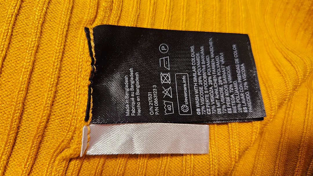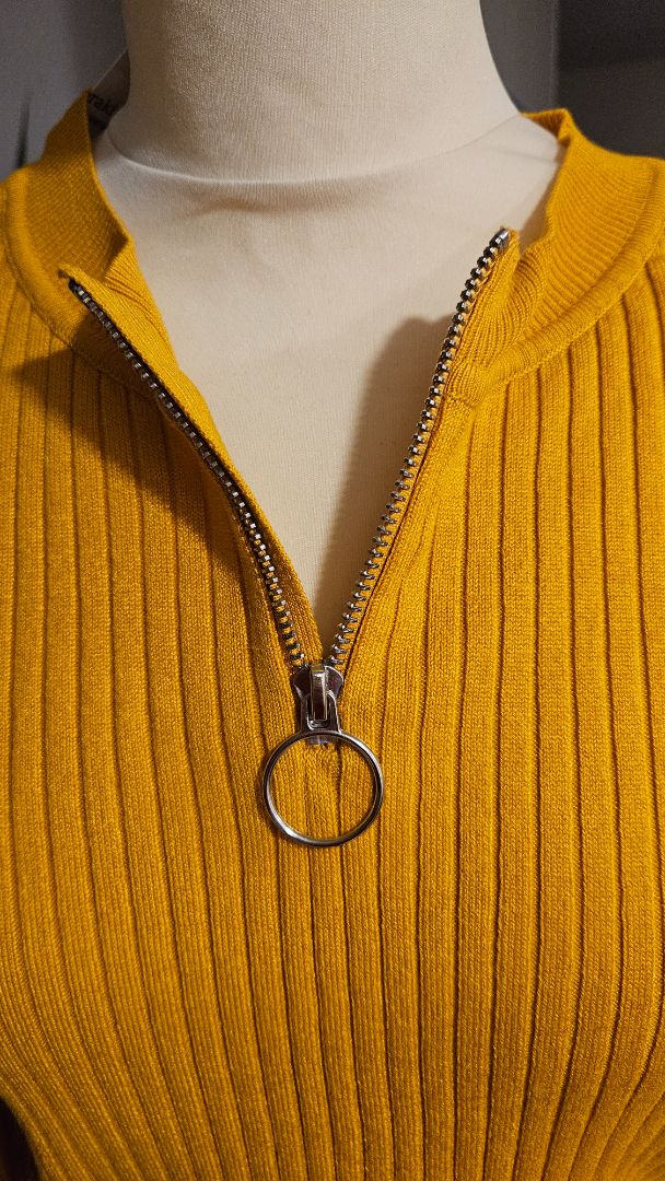 A curry yellow sweater, half-zipped at the neck.