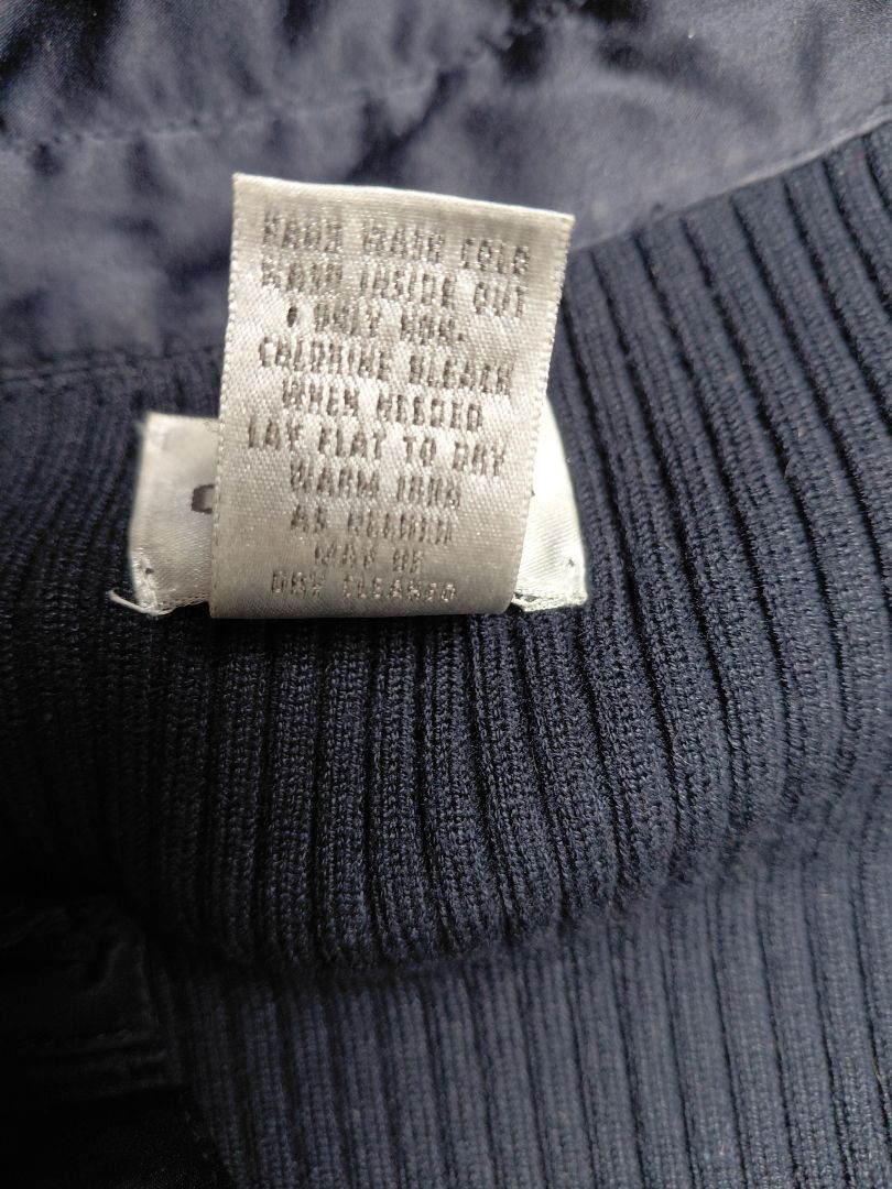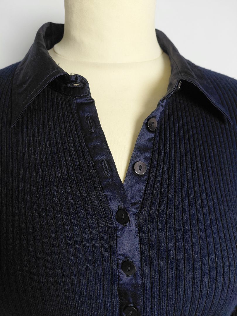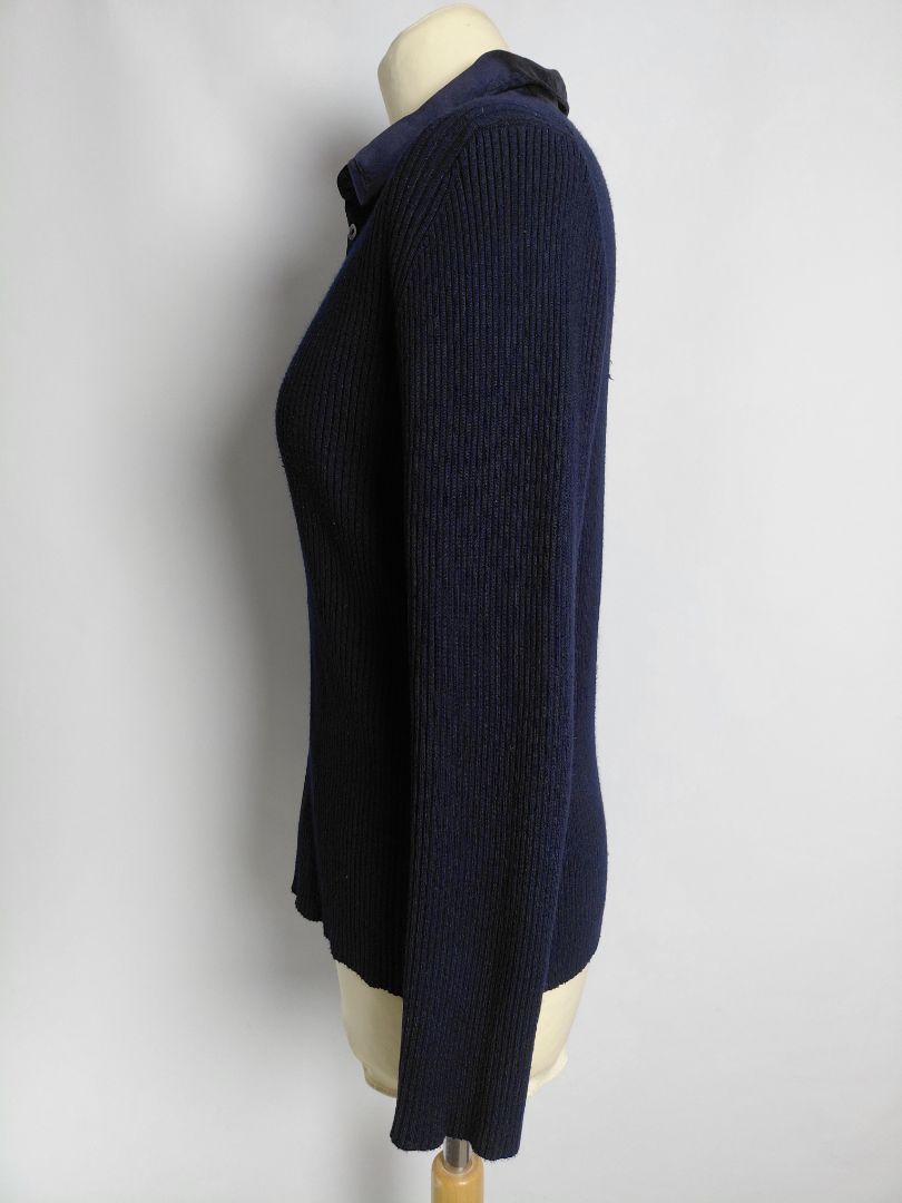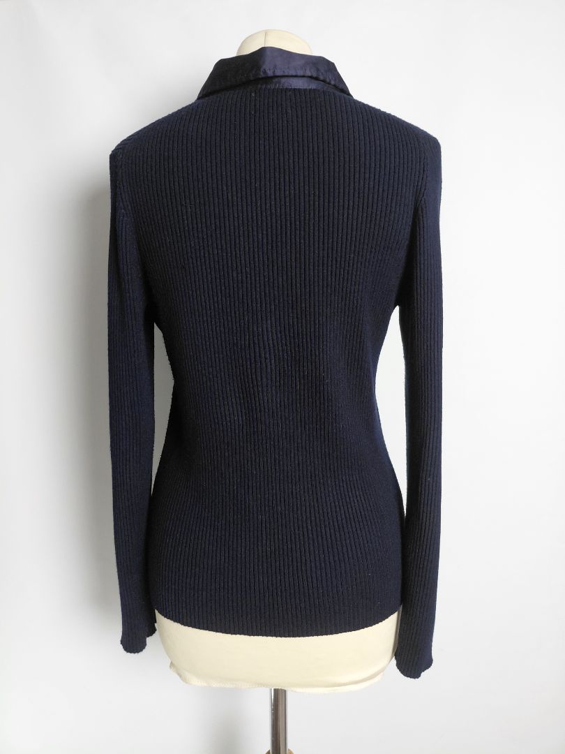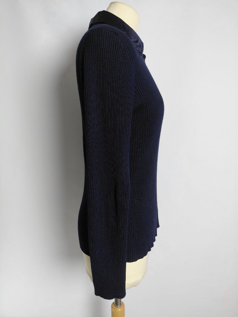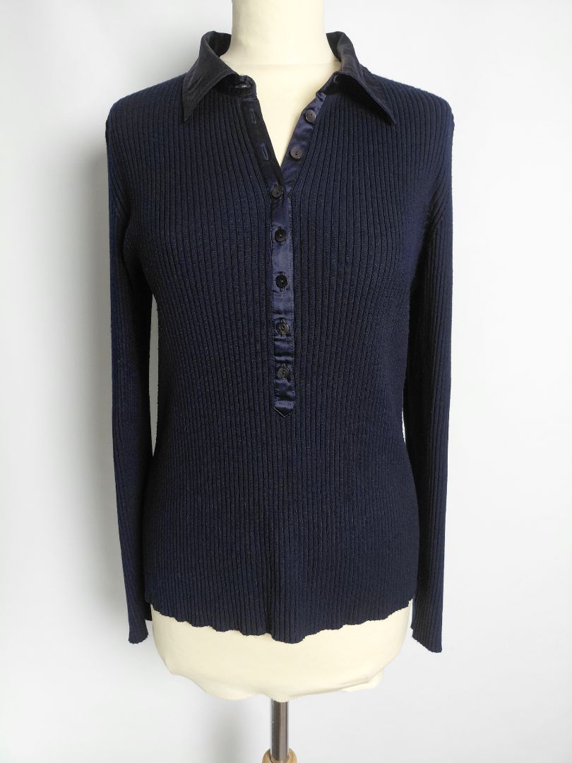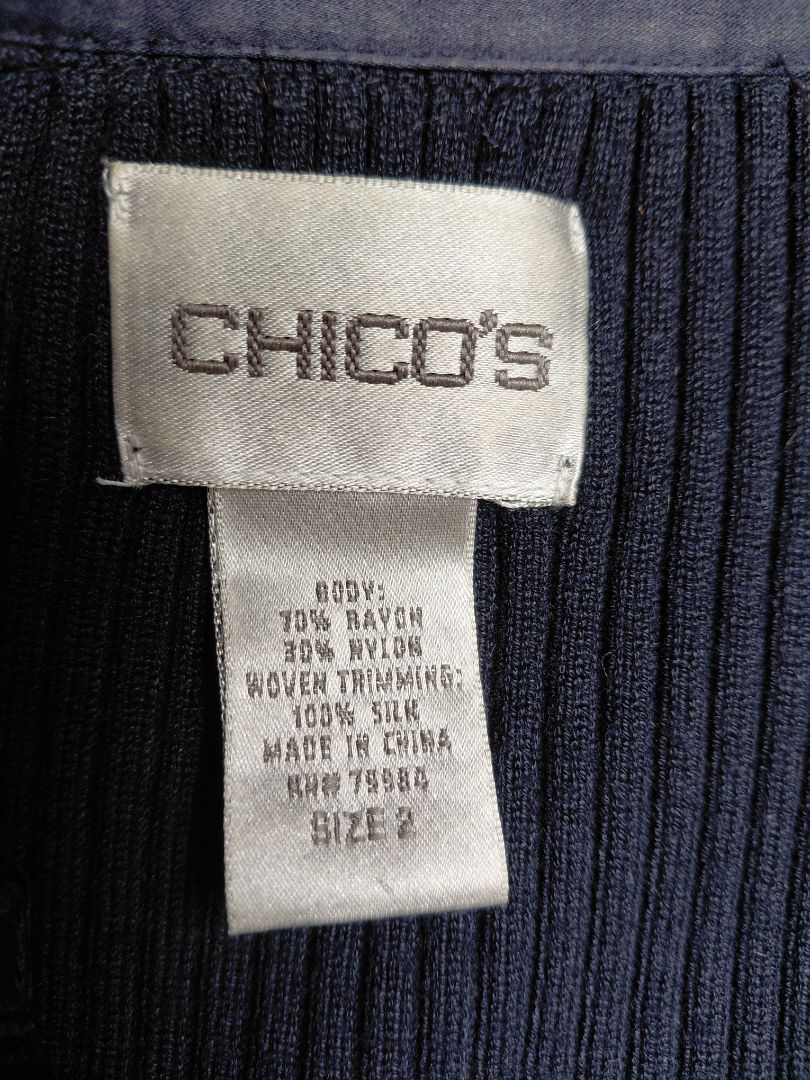 Dökkblá síðerma peysa hneppt frá bringu og upp í háls og með 100% siki kraga. Peysa er í beinu sniði og úr Rayon. Peysan er í stærð 2 sem jafngildir stærð L skv. stærðartöflu Chico´s.