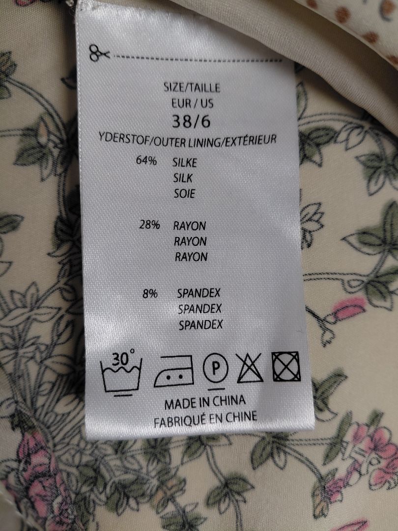 Cream silk (100%) shirt with a pink and green pattern.