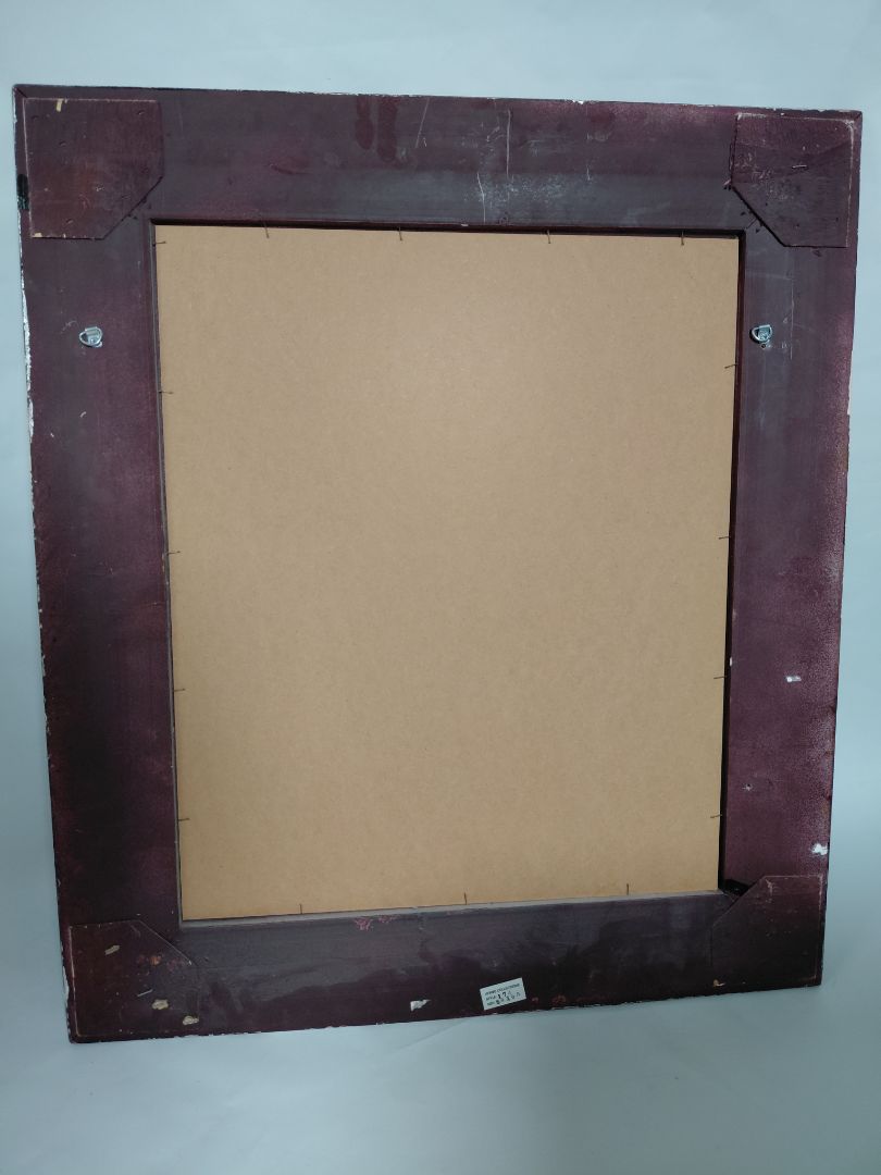 Stærð með ramma er skorið í upphækkun. Ramminn er gylltur skreyttur með útskornum laufblöðum.