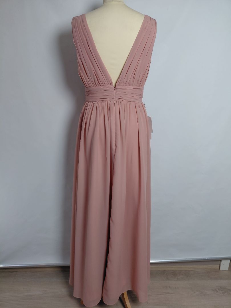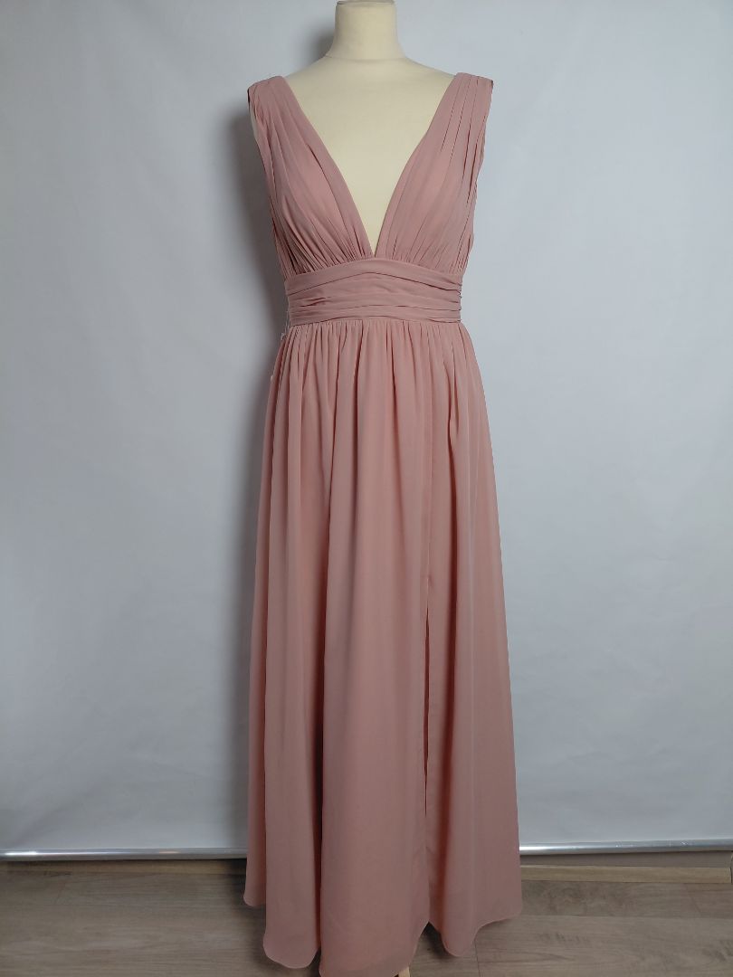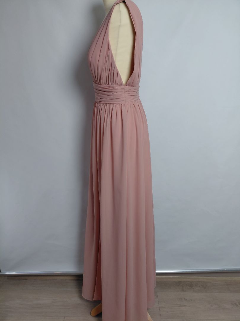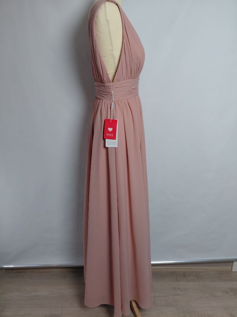 Fallega bleikur síður kjóll í A-sniði, renndur saman í bakið. Kjóllinn er fóðraður að innan í sama lit og með klauf á vinstri hlið að framan. Bringan er styrkt með þunnum brjóstapúðum til þess að tryggja fallega lögun. Þessi kjóll er ónotaður og enn með uppaflegum merkingum.