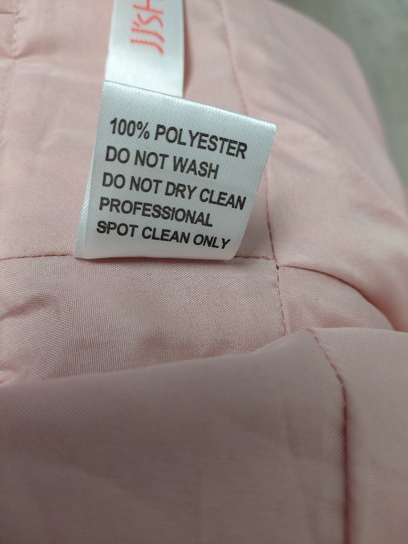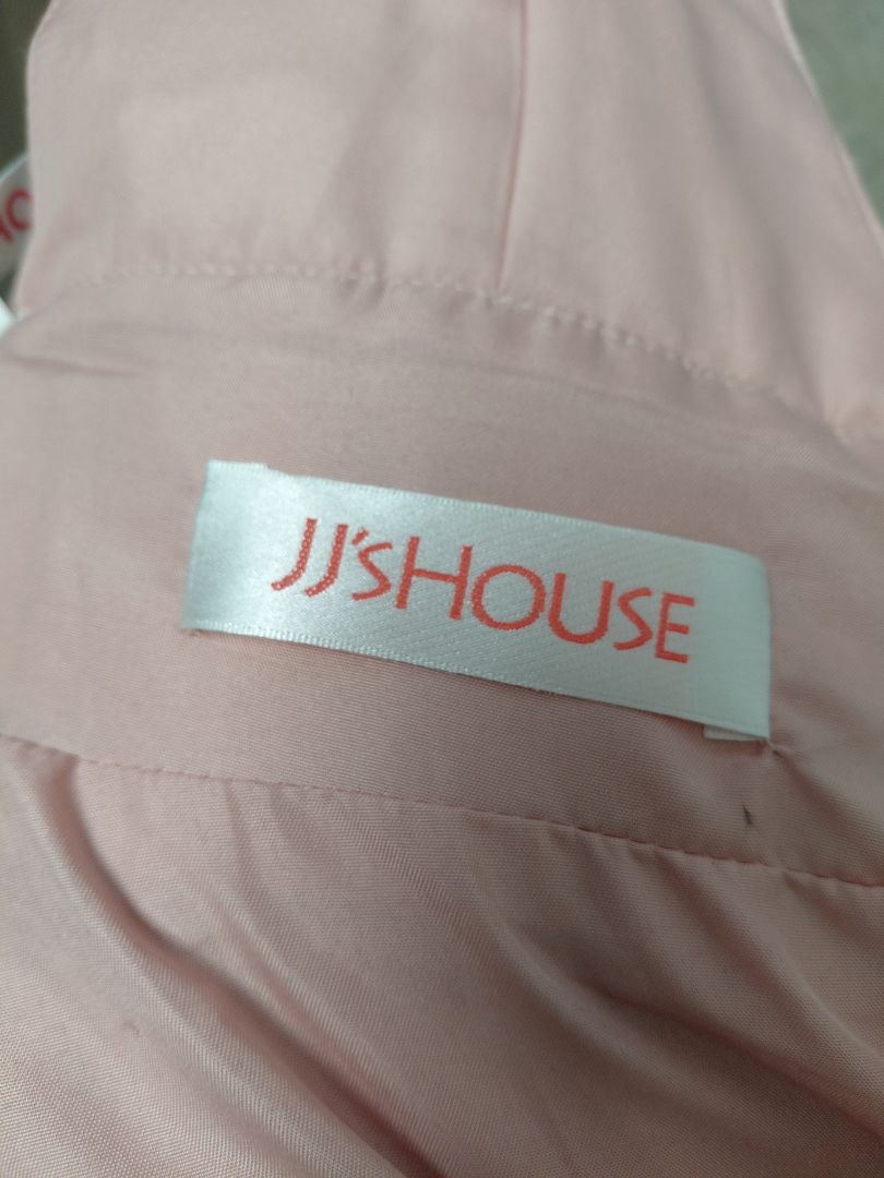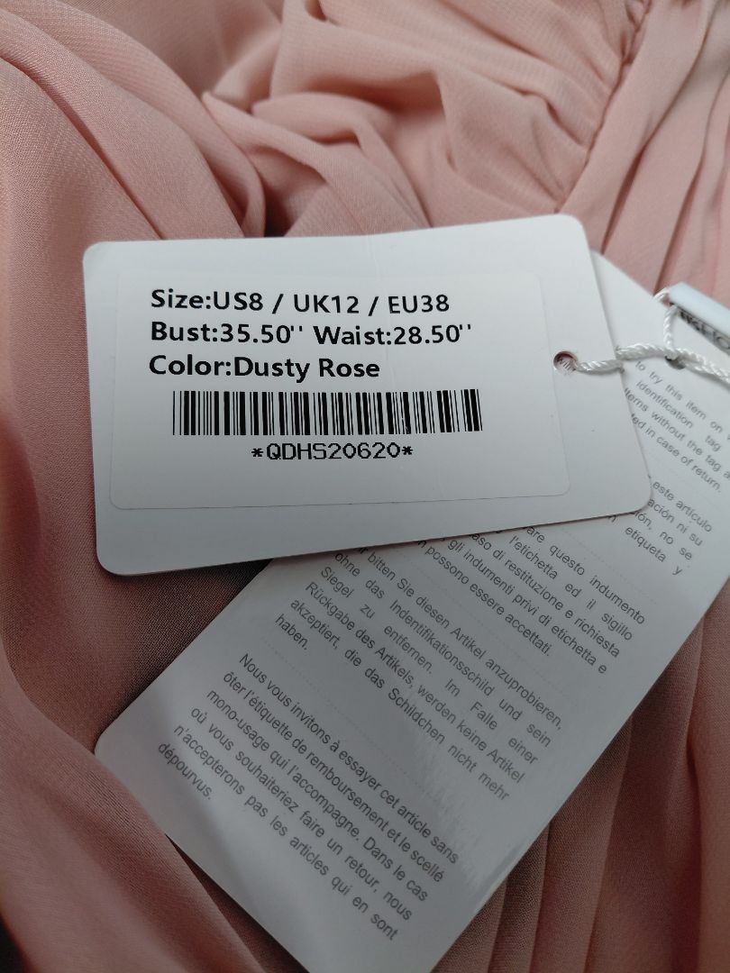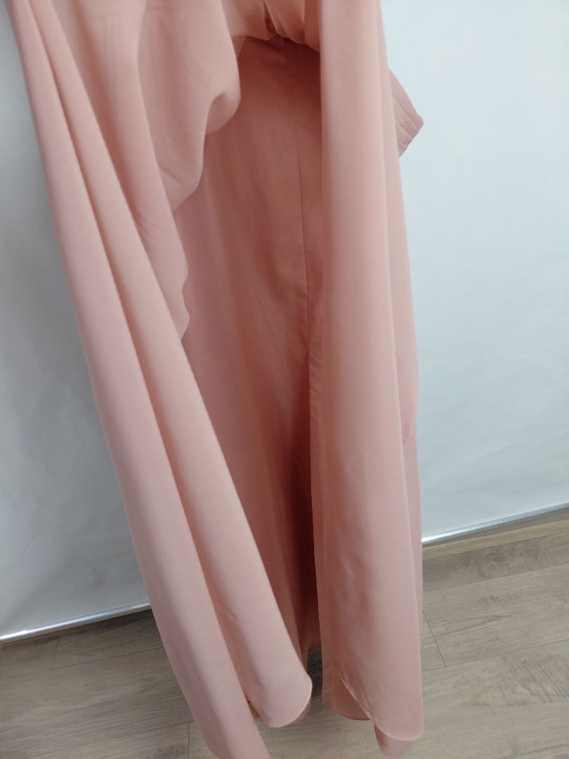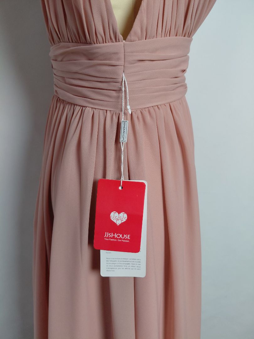 Fallega bleikur síður kjóll í A-sniði, renndur saman í bakið. Kjóllinn er fóðraður að innan í sama lit og með klauf á vinstri hlið að framan. Bringan er styrkt með þunnum brjóstapúðum til þess að tryggja fallega lögun. Þessi kjóll er ónotaður og enn með uppaflegum merkingum.