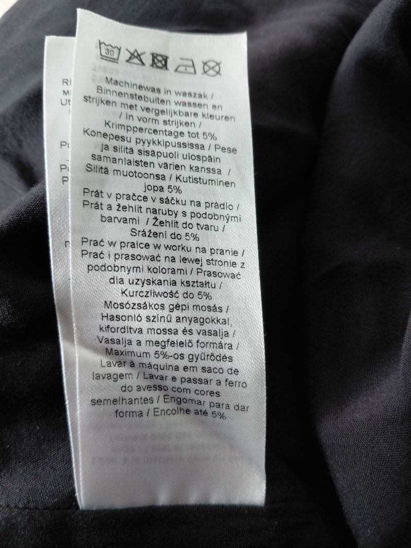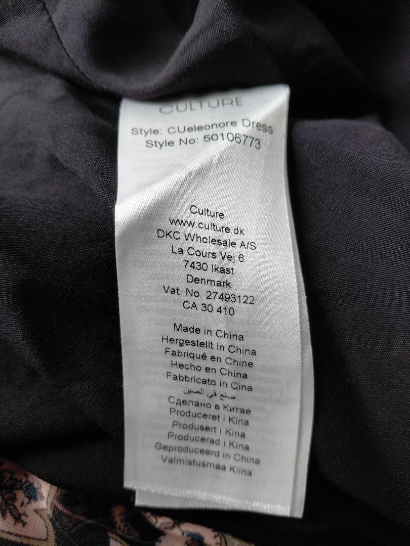 A dress lined on the inside with black lining. The dress is patterned in black, pink, navy blue and brown.