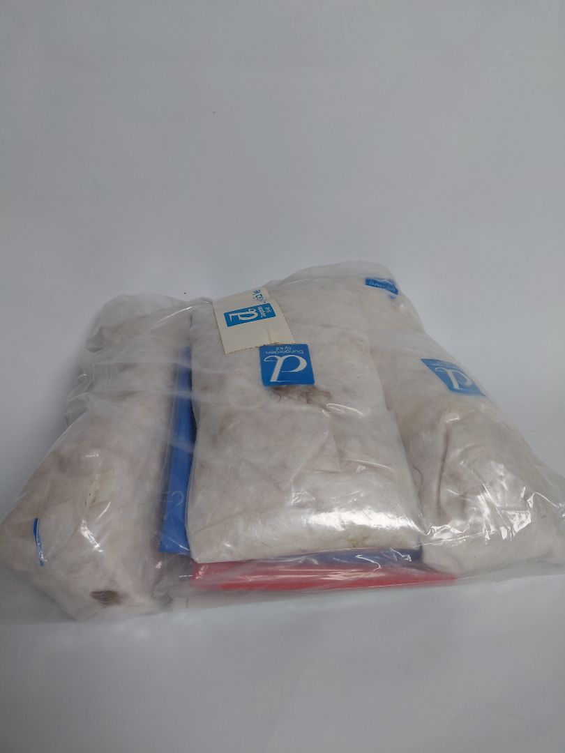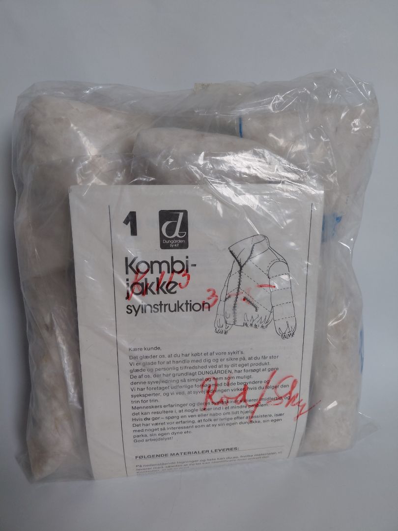Unopened sewing kit from around 1970 and contains a pattern for a down jacket, blue and red fabric and real down for filling. The kit has never been opened.