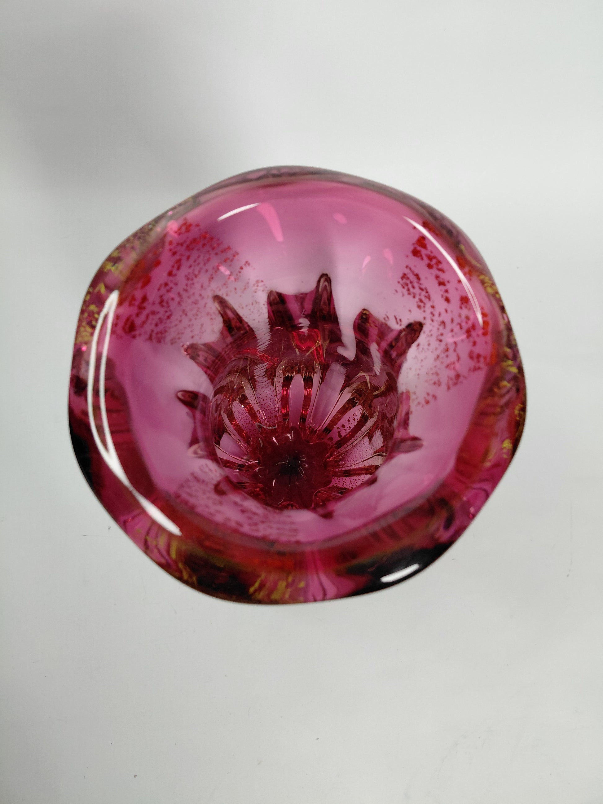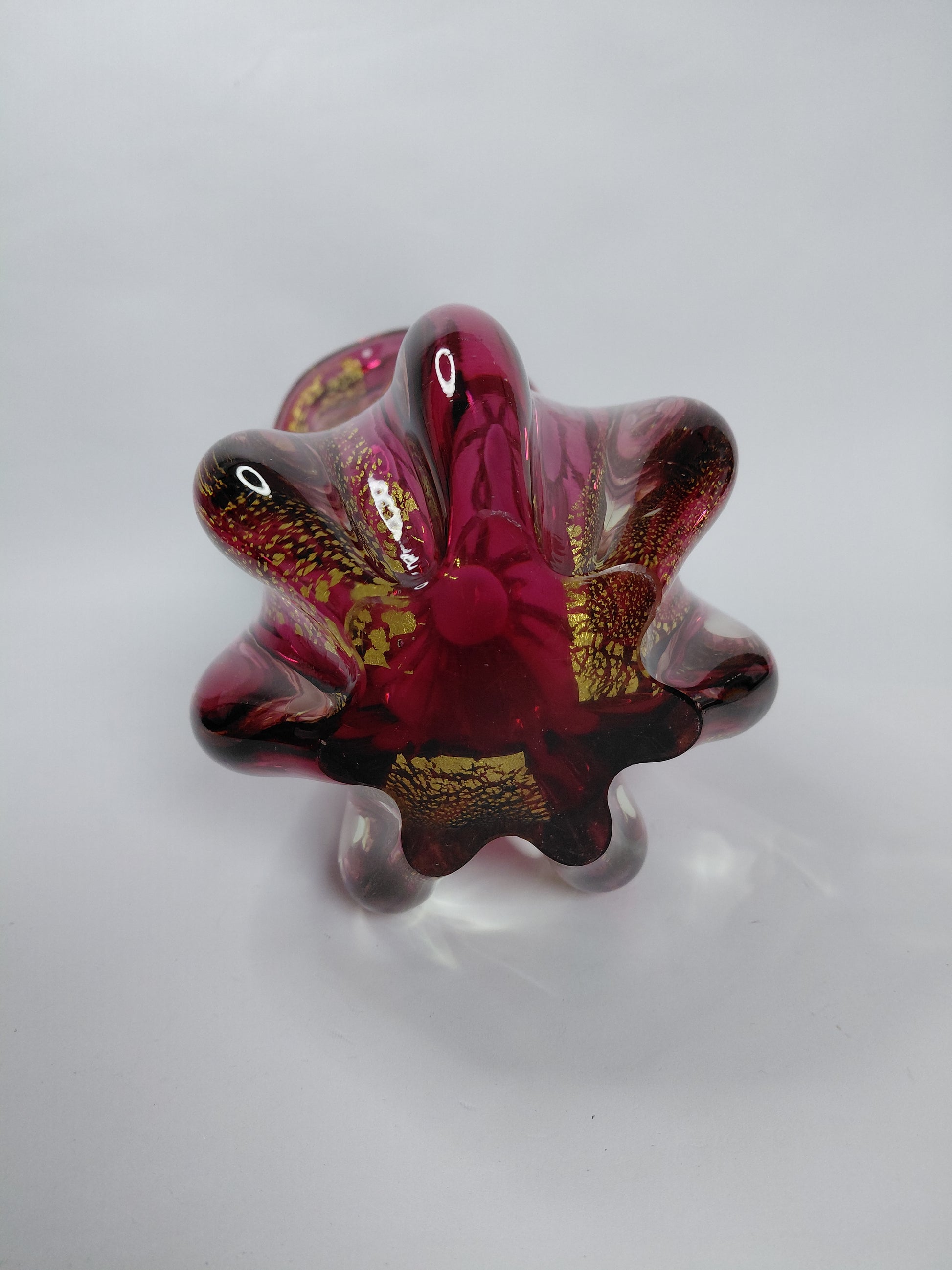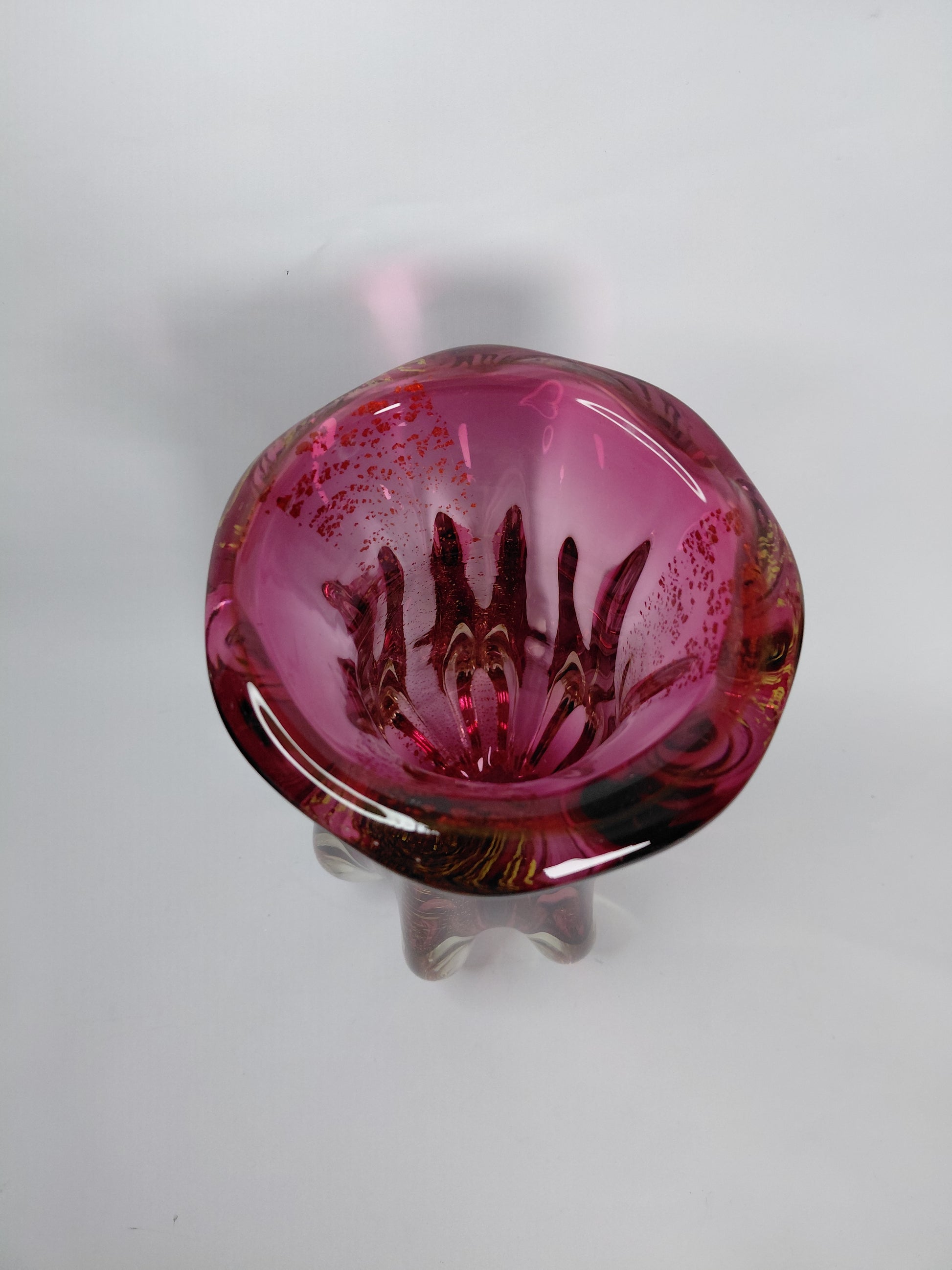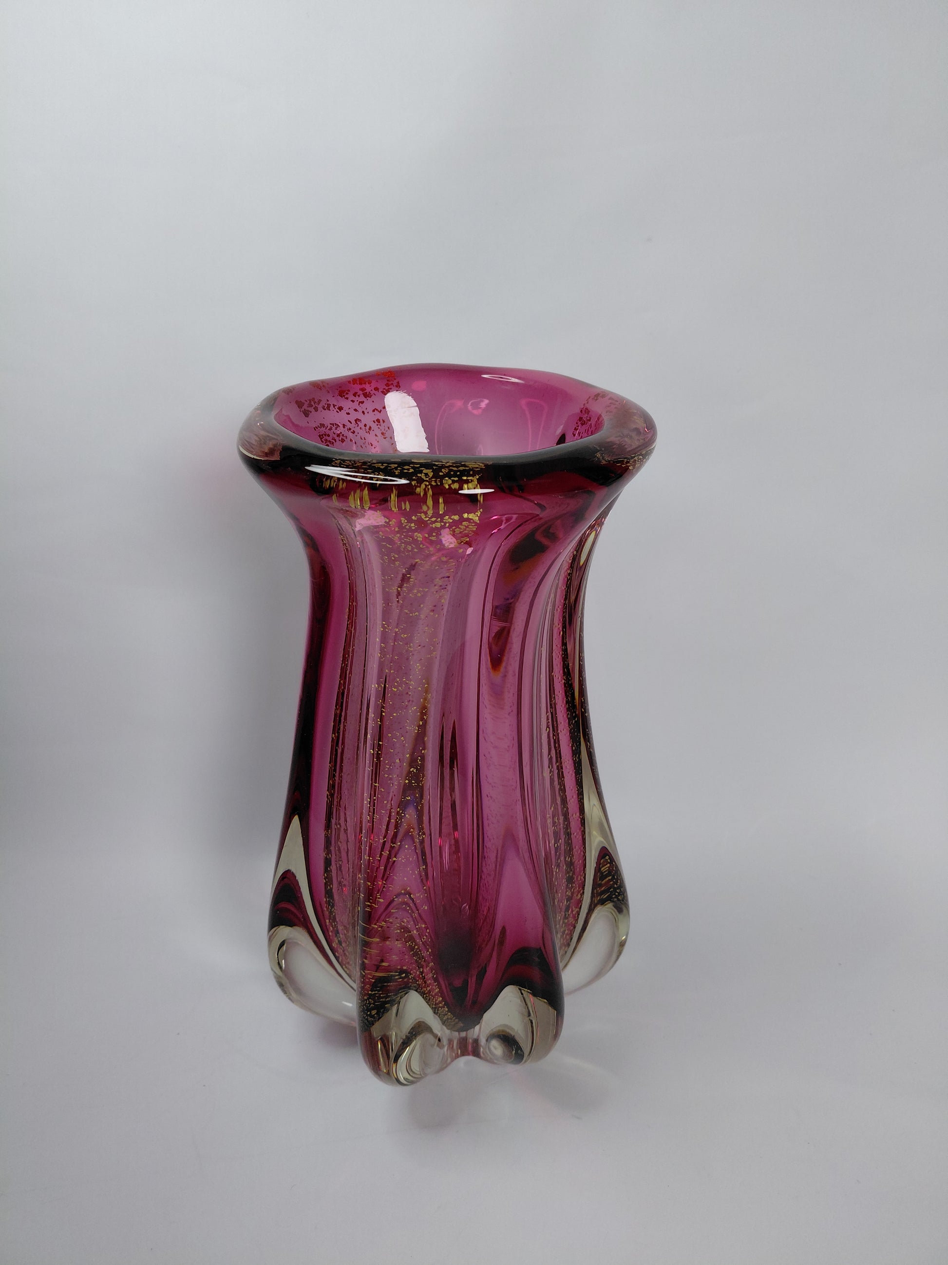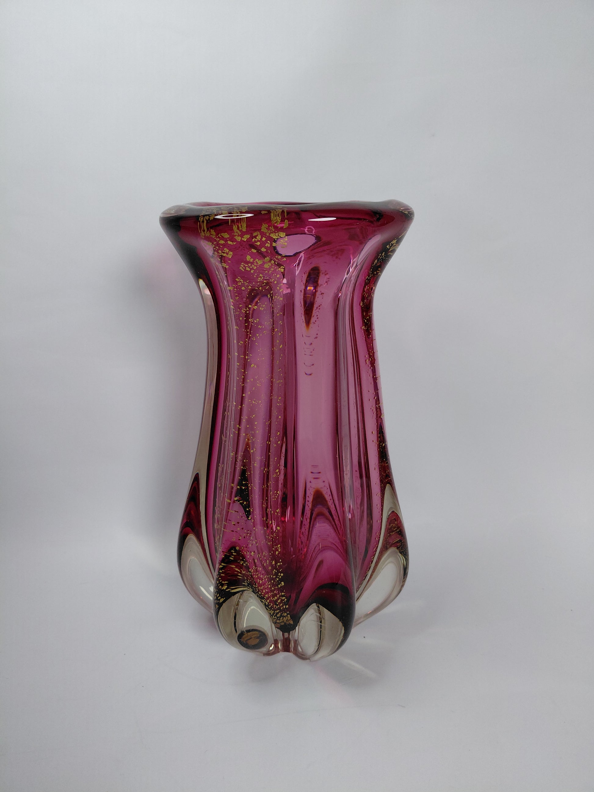 Fallegur og veglegur gler vasi í fjólubláum lit. Vasinn er með fallegri gyllingu inn í glerinu og einstaklega veglegur með þykku gleri. Vitað er að þessi vasi sé frá árunum 1960-1965 og er hann að öllum líkindum hannaður af tékkneska listamanninum Josef Hospodka með Sommerso aðferð. Vasar frá Hospodka þykja mjög verðmætir og eftirsóttir á endursölumarkaði.