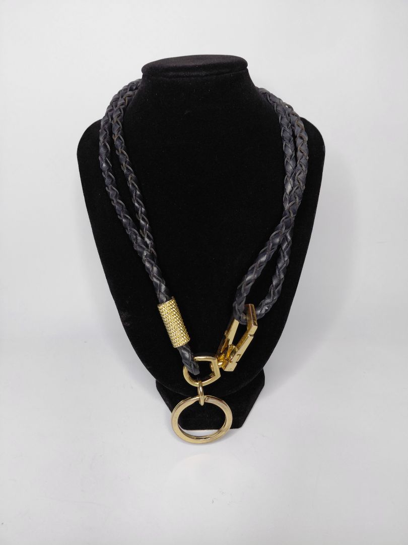 A necklace made of braided black leather that is also a bracelet. The necklace can be worn long or in a shorter version by hooking the charm. It can also be used as a bracelet by hooking the charm. A really fun design.