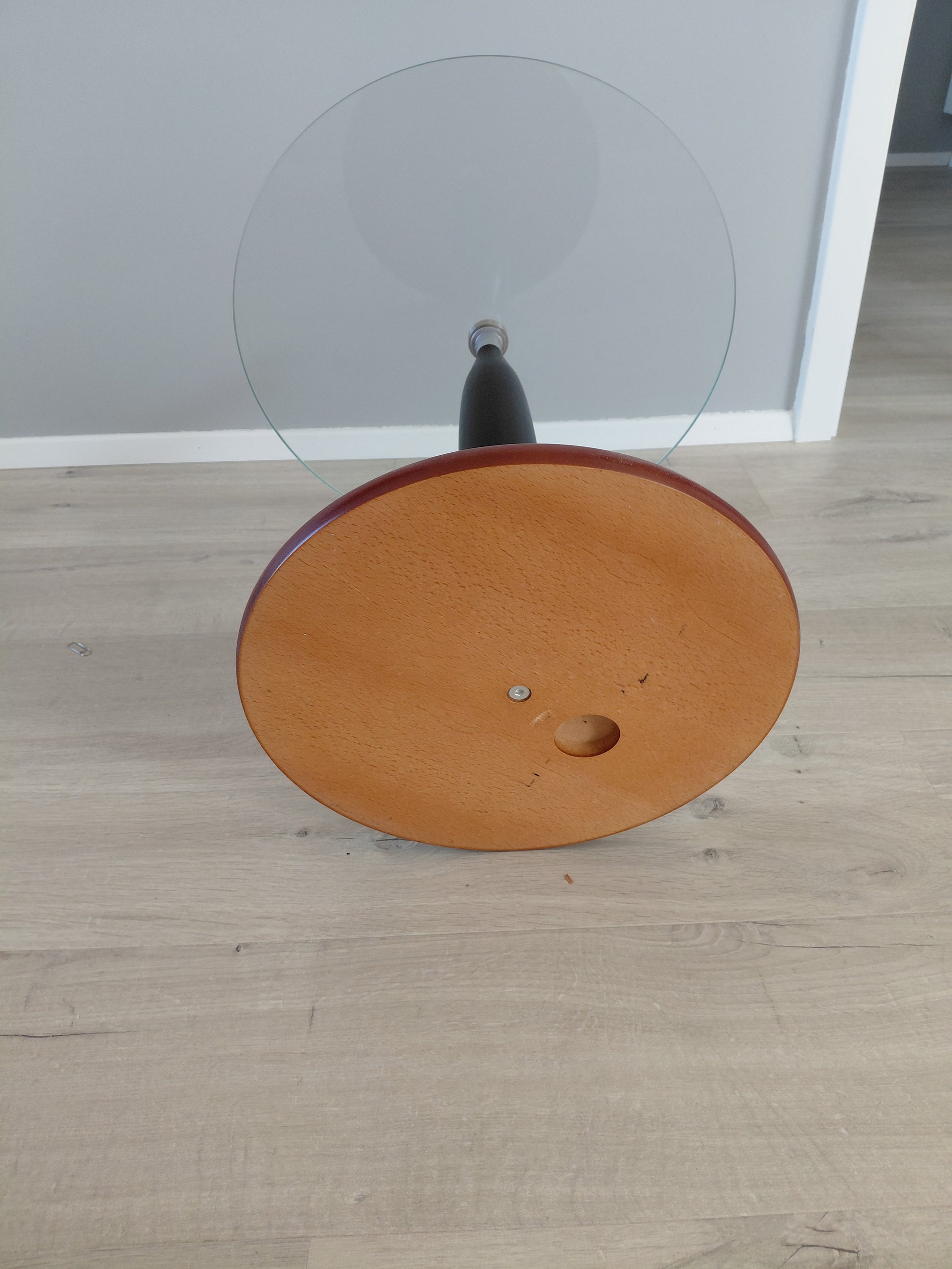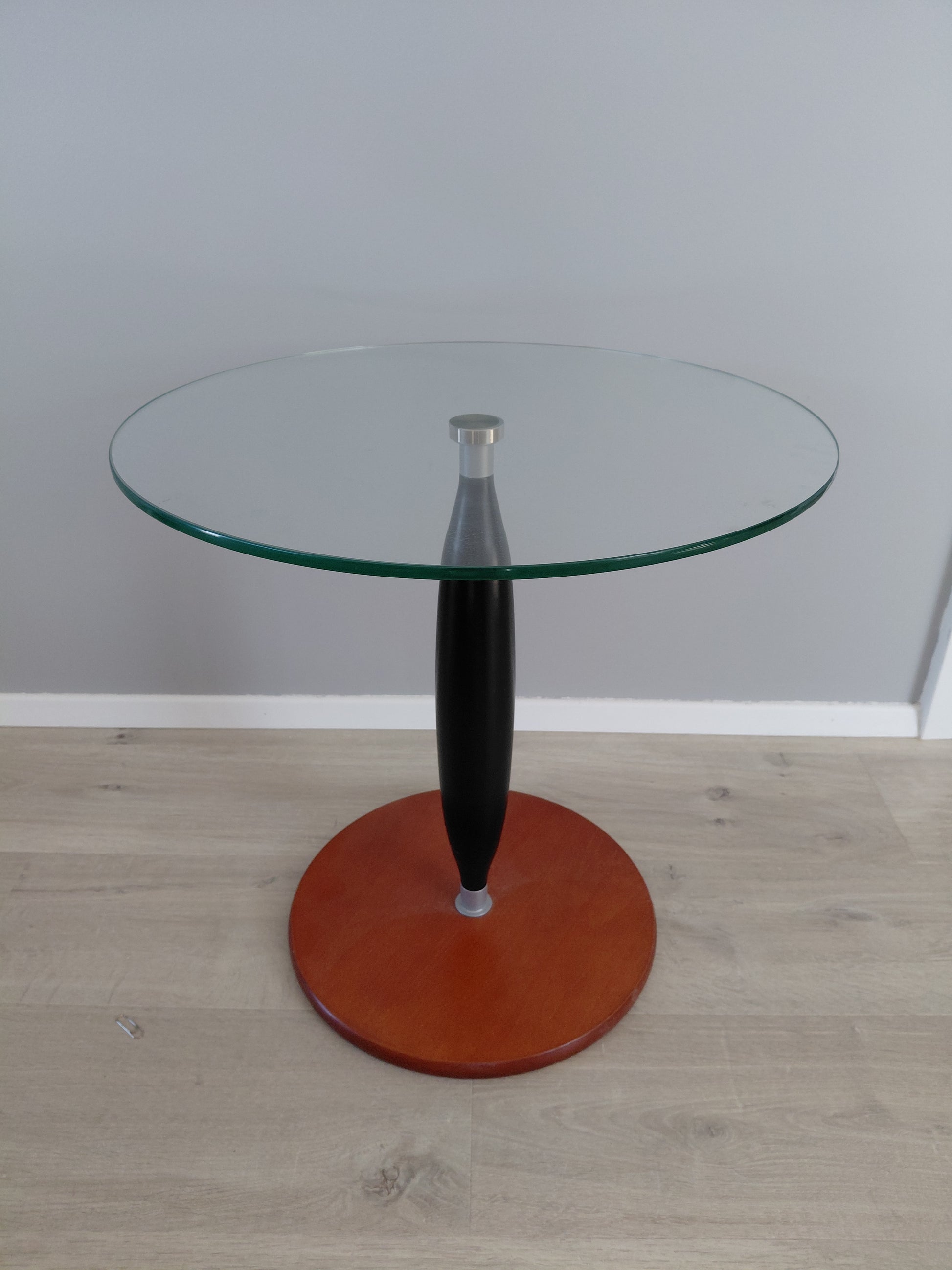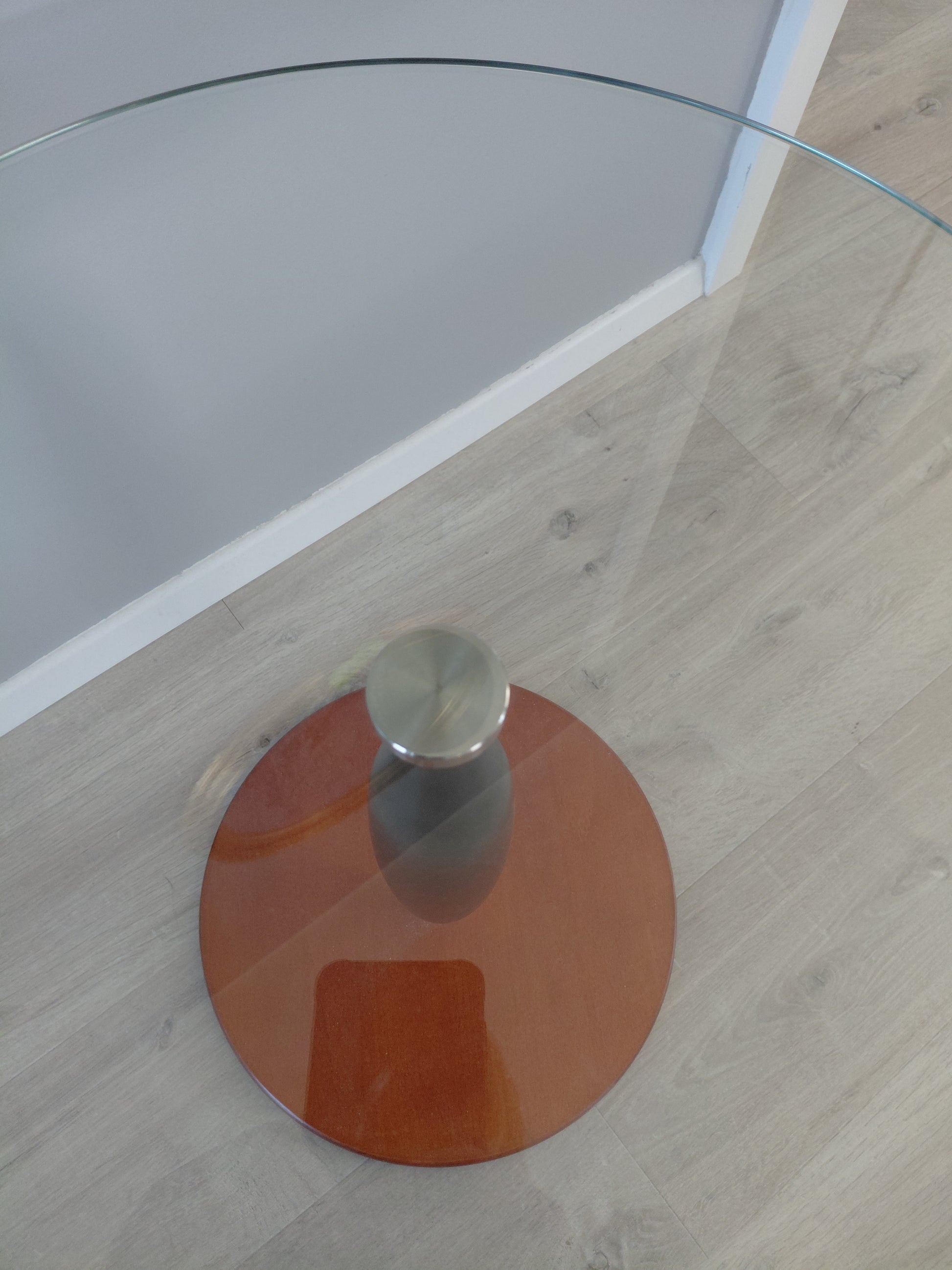 Fallegt hliðarborð úr gleri, hringlaga og stendur á nánast sporöskjulata fæti. Þetta borð er frá timabilinu 1980-1990s.