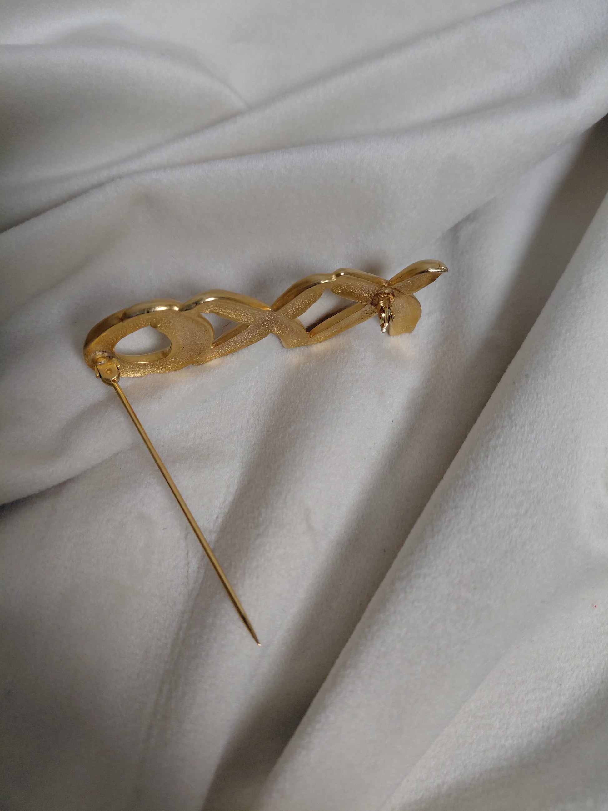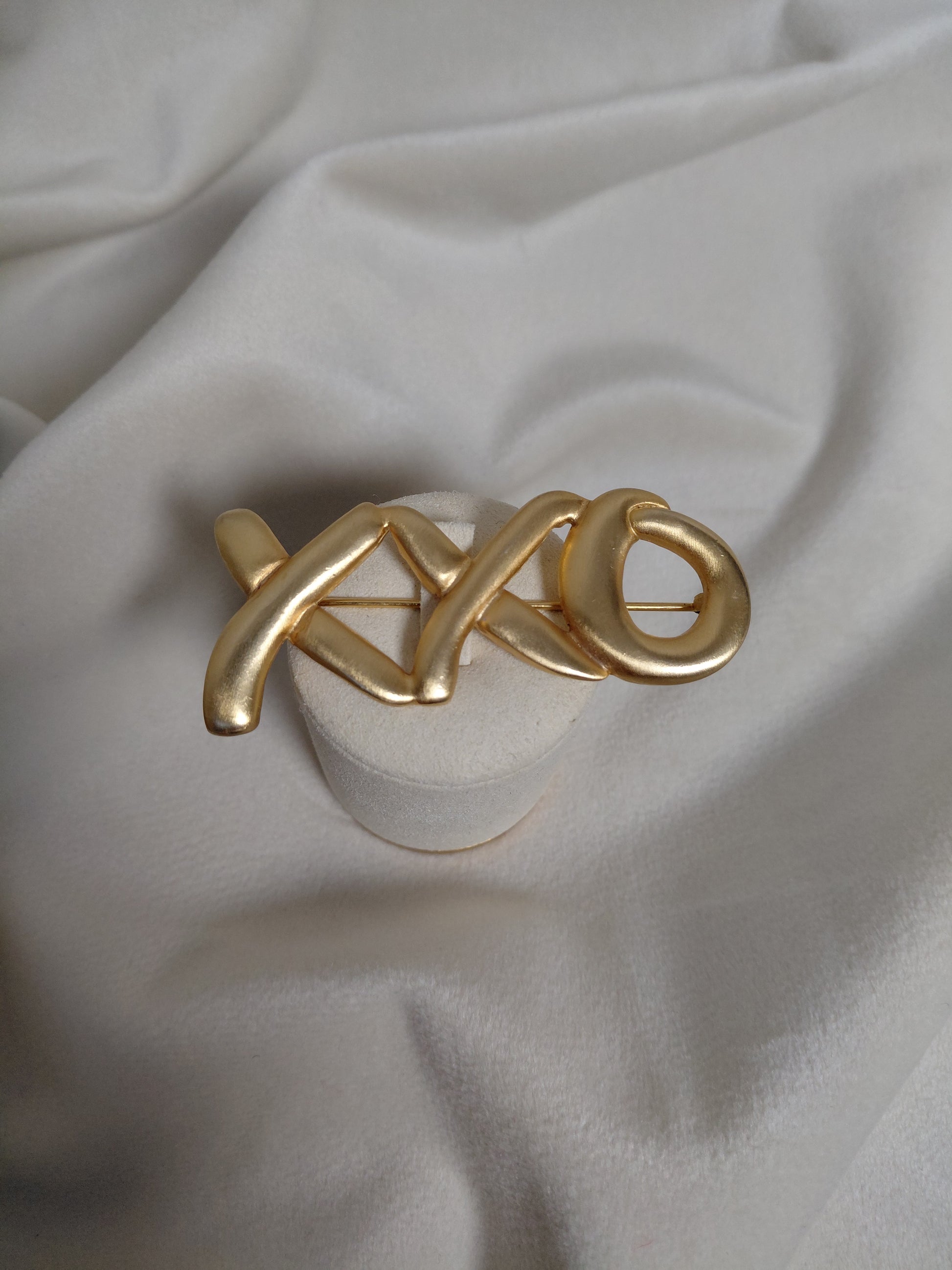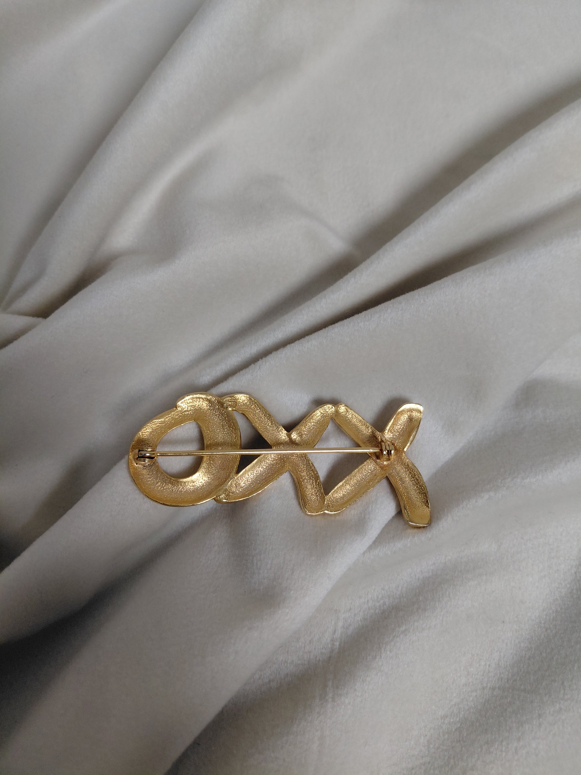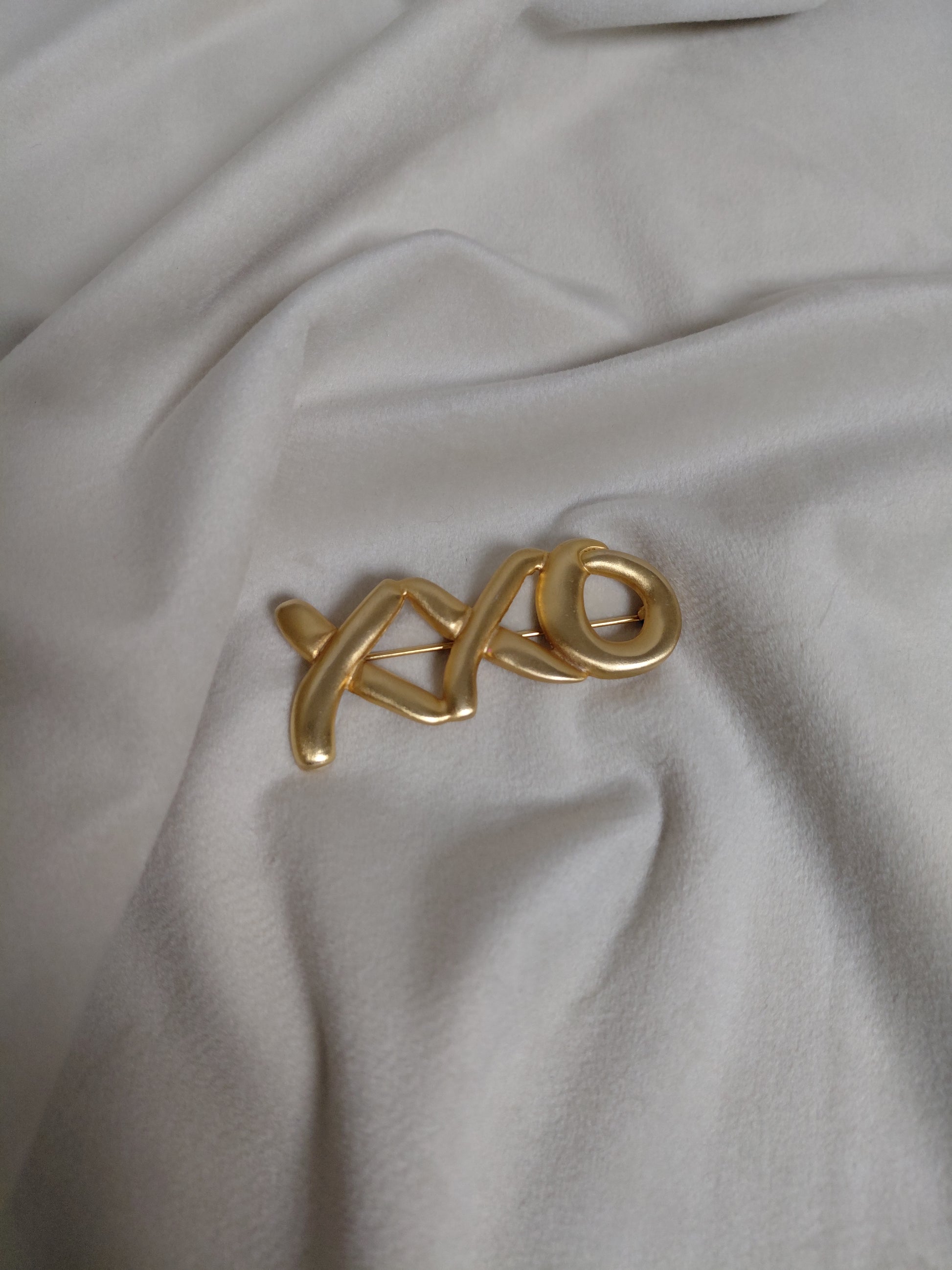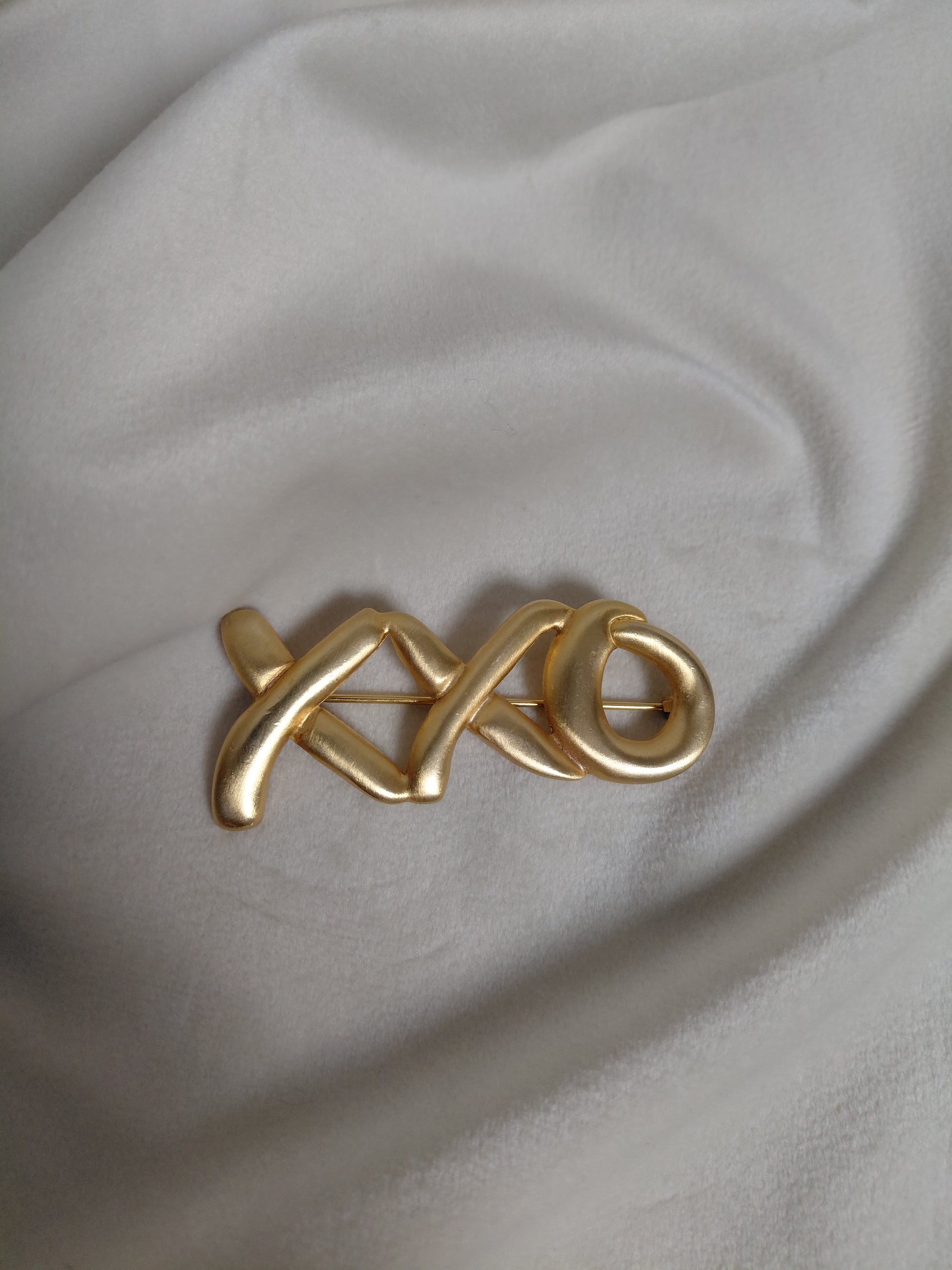 Falleg vintage næla sem oft er kölluð "Hugs and Kisses" næla eða "XO" næla þar sem XXO eru tákn fyrir kossa. Liturinn er gull en við vitum ekki um framleiðandann en þetta er stálnæla og líklegast EKKI ekta gull.