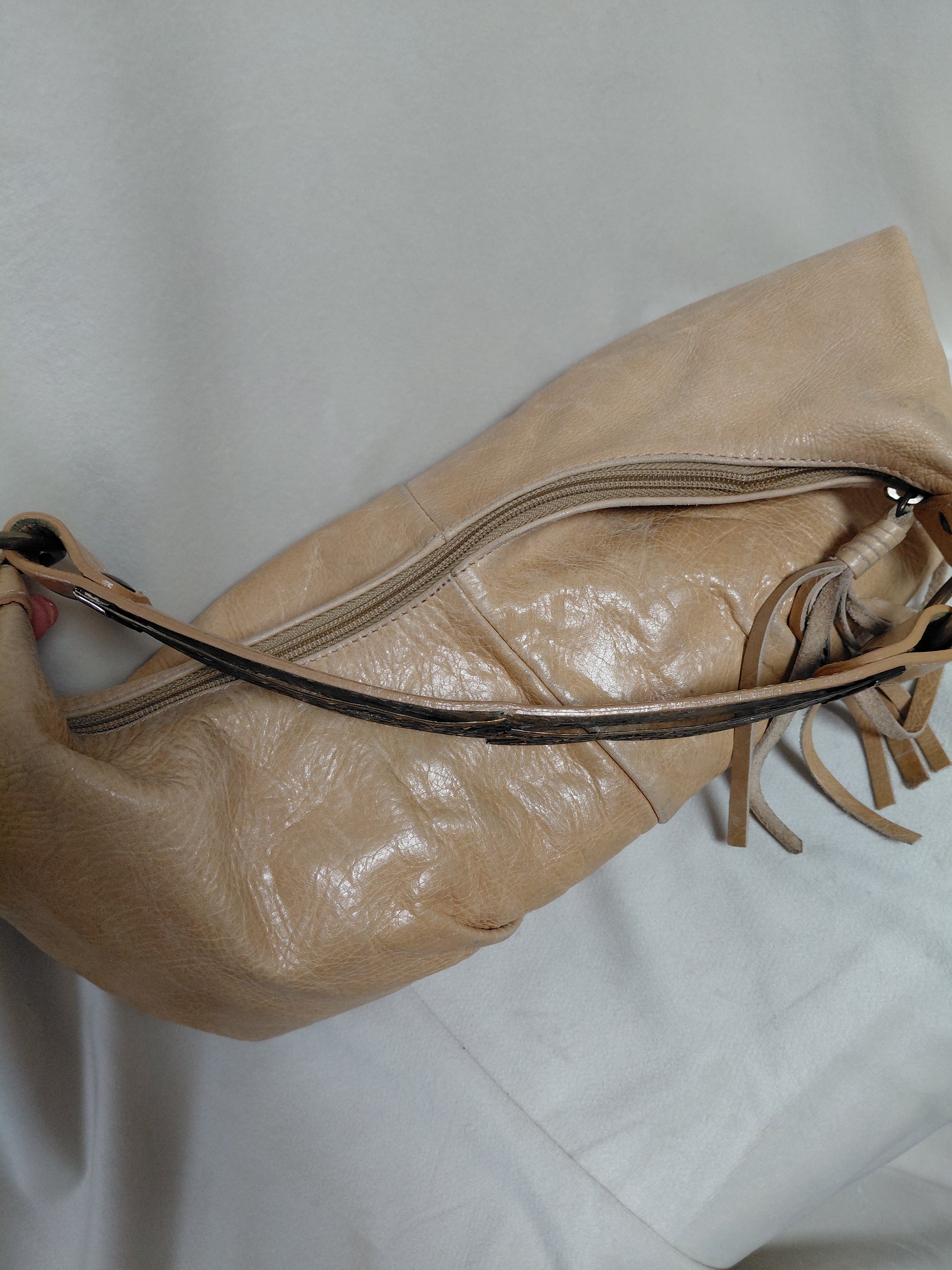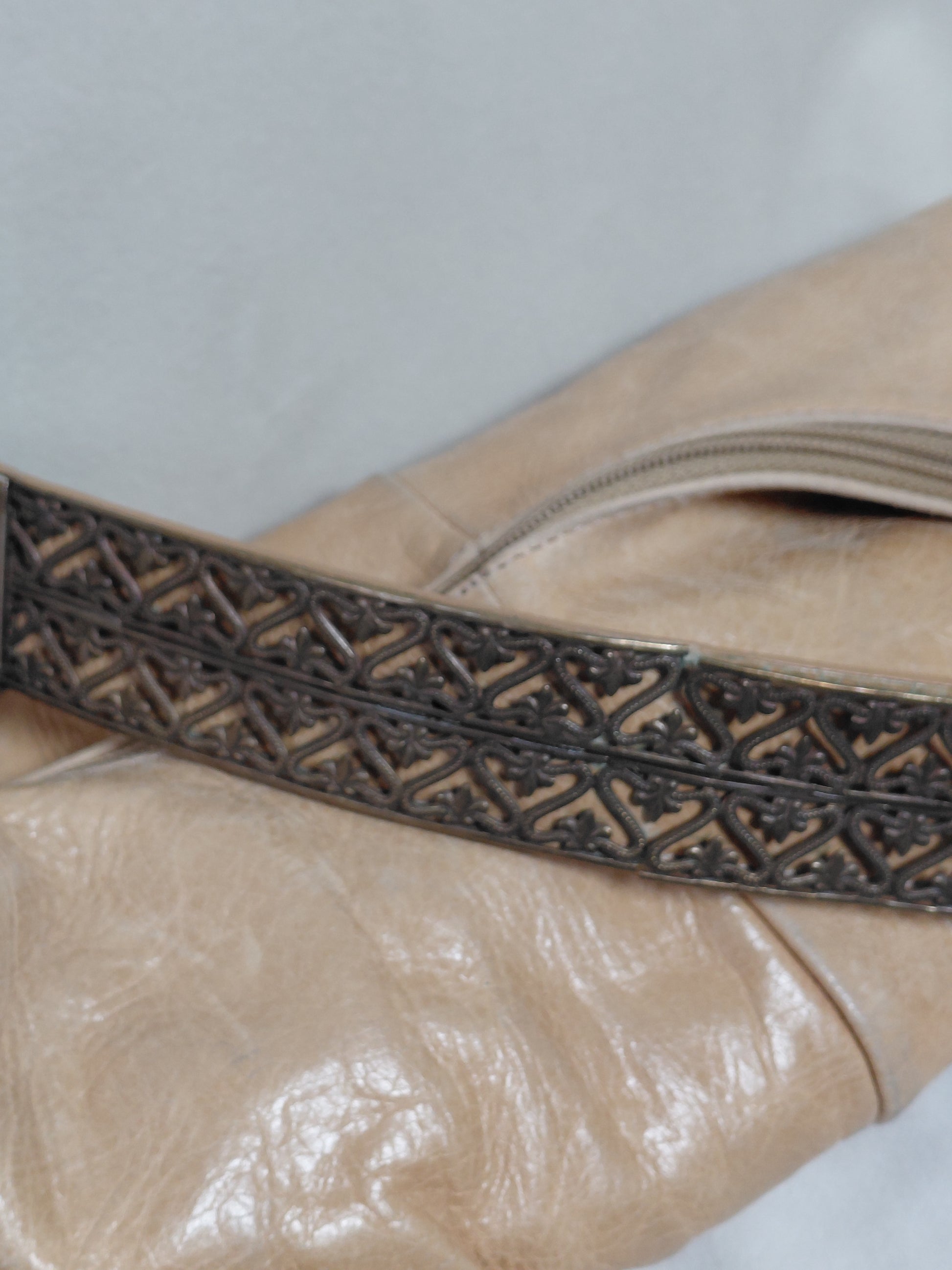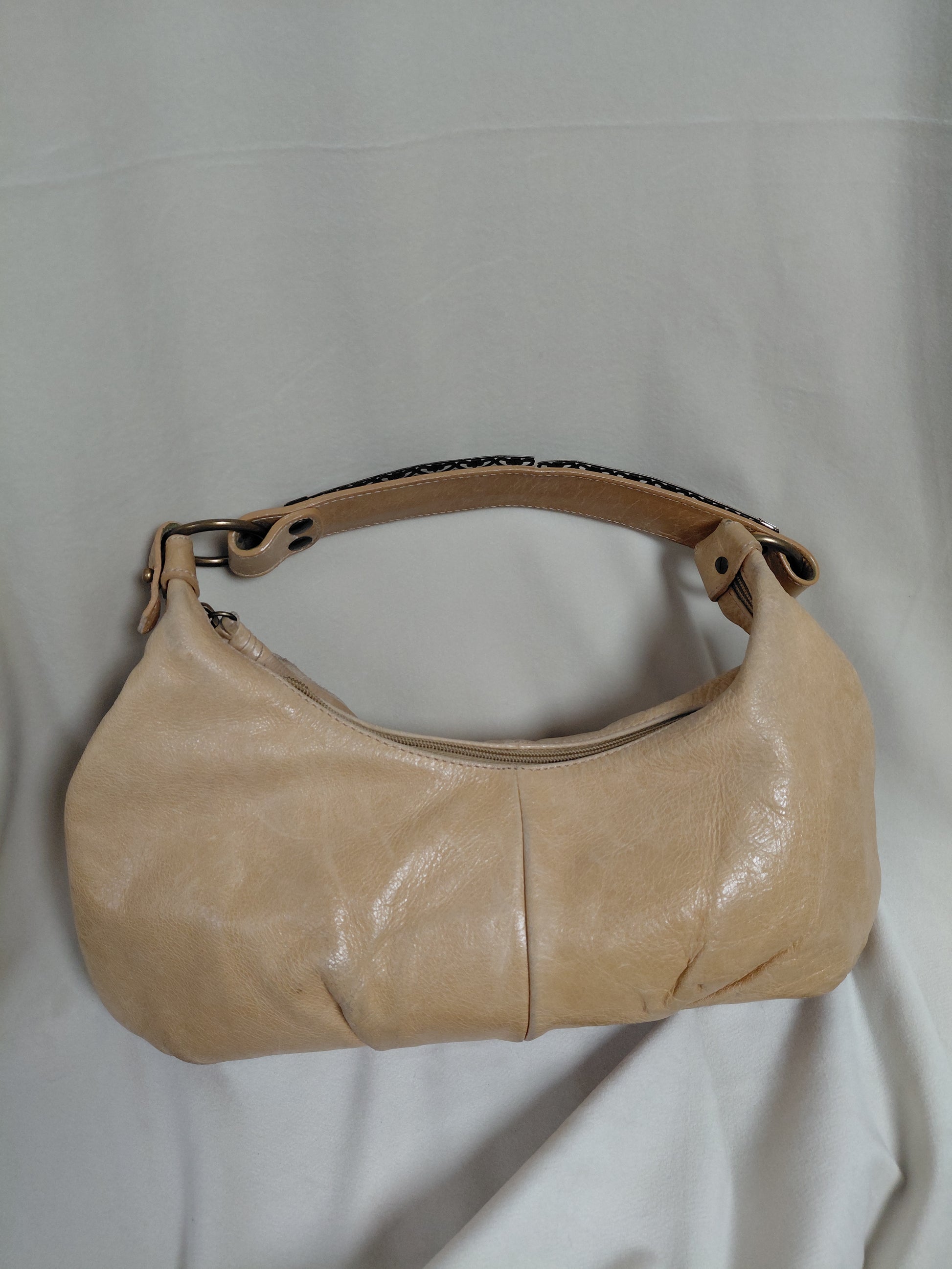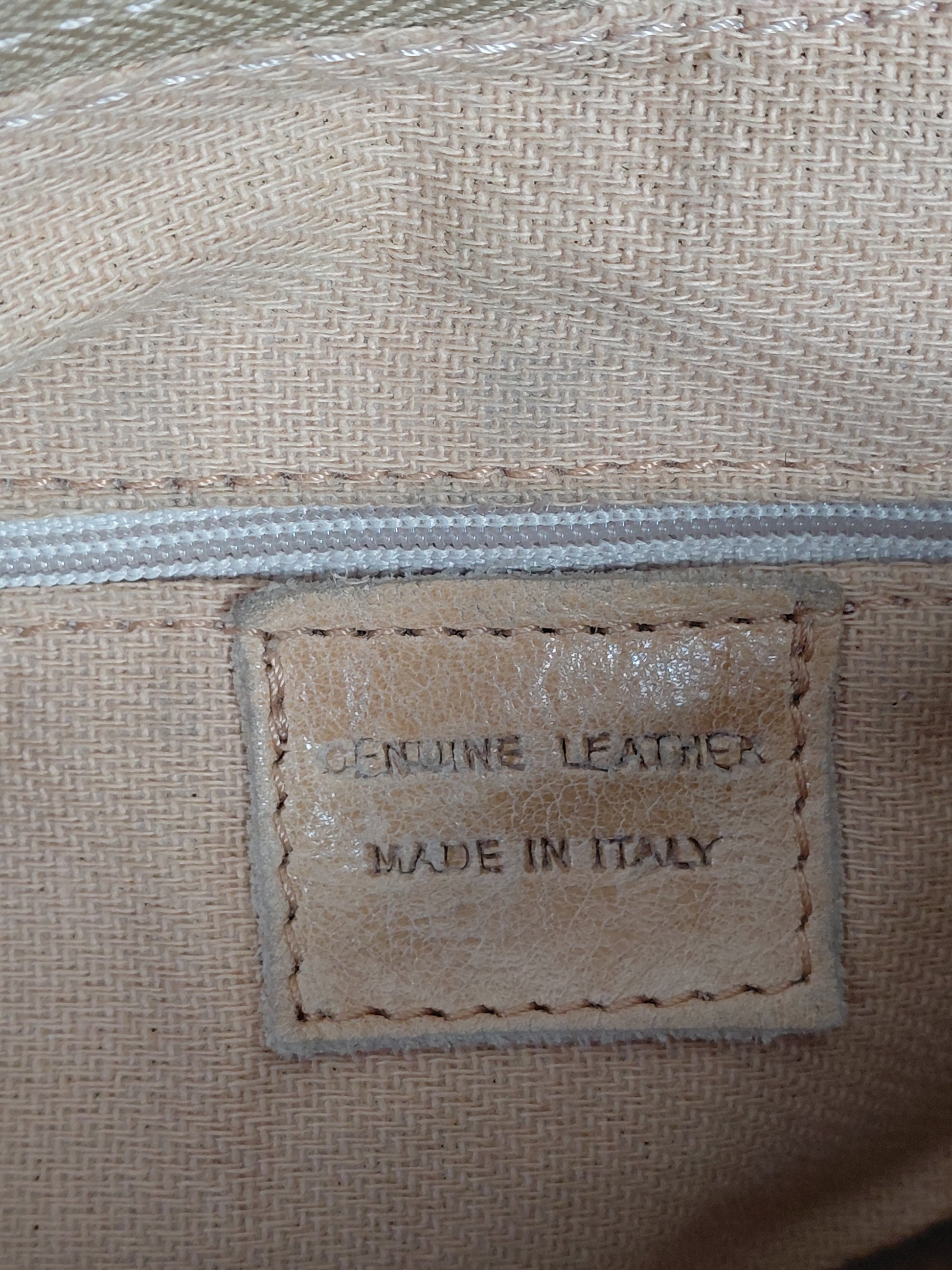 Falleg vintage (2000) ekta leður taska úr "Distressed" leðri. Þessi taska er merkt Made in Italy og Genuine Leather en ekki vitað um framleiðanda. Axlabandið er skreytt með málmskreytingu sem er brotin um miðja ól sem sést mjög lítið og er ólin samt heil, sjá myndir. Tekið er mið af þessu í verði.