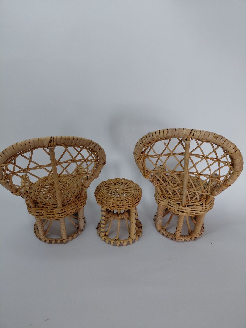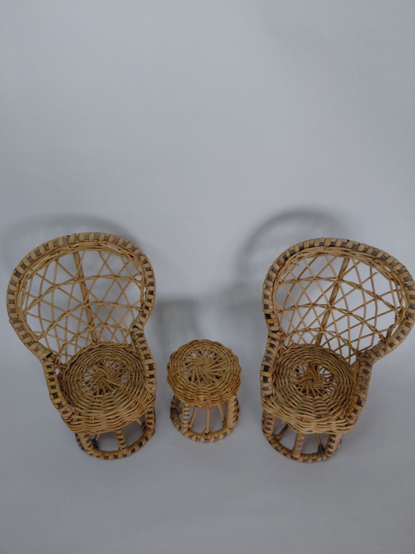 Vintage mini stólar og borð. Settið inniheldur 2 stóla og 1 borð. Gjarnan notað í dúkkuhús eða sem punt. Þessar vörur voru vinsælar á árunum 1960-1980.