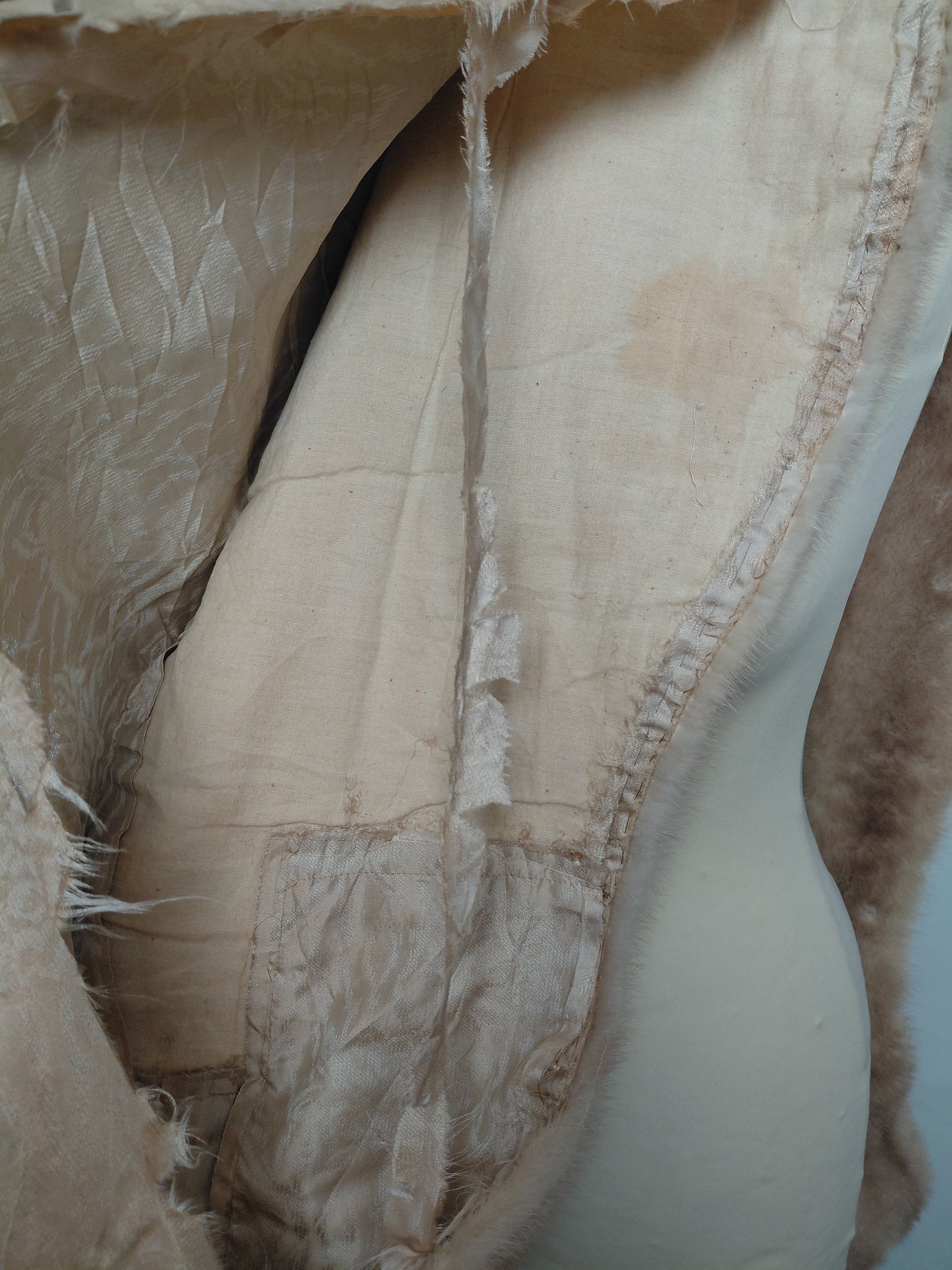 Fóðrið er ansi illa farið en það er hægt að rífa það af eða láta gera við það Við mælum alltaf með því að reyna að halda í merkingarnar á fóðrinu og reyna að láta laga það t.d. ofan á nýtt fóður. Verðmætið er í pelsinum sjálfum og merkingunum.