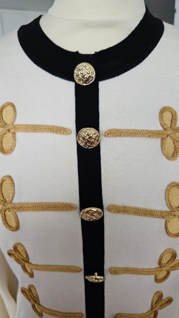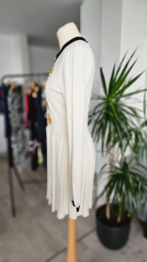 Beautiful golden dress made of knitted material and with beautiful embroidery on the front.