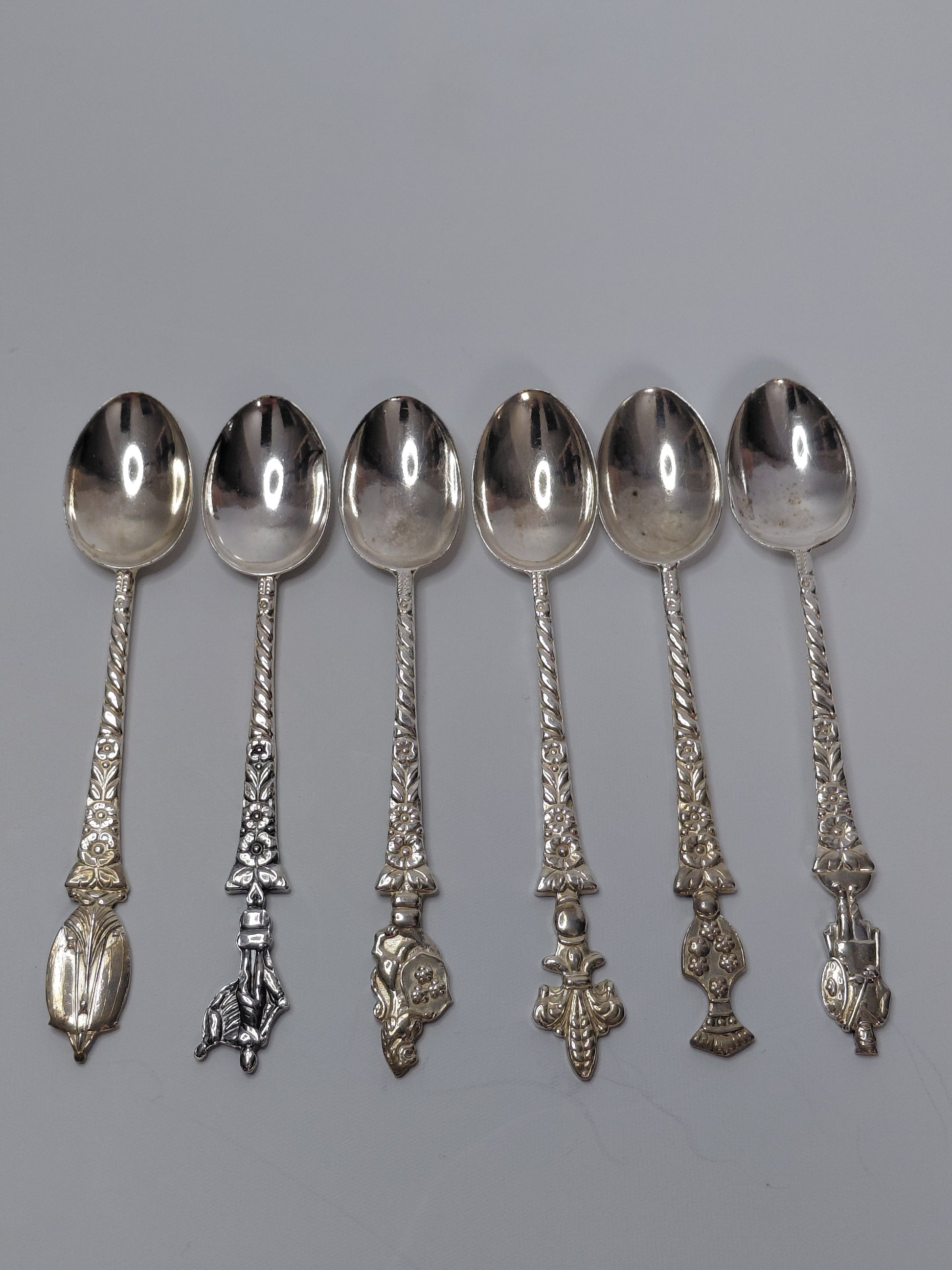 Silfuhúðaðar teskeiðar frá tímabilinu 1950-1970, 6 stk sem seljast saman. Hver skeið er 9.5 cm löng og hver skreytt með sinni fígúru. Þessi vara kemur í sínum upprunalegu umbúðum