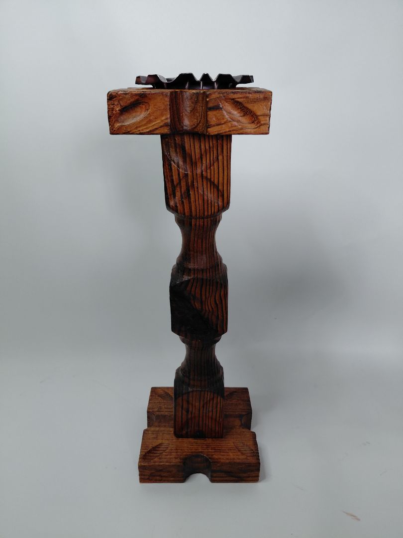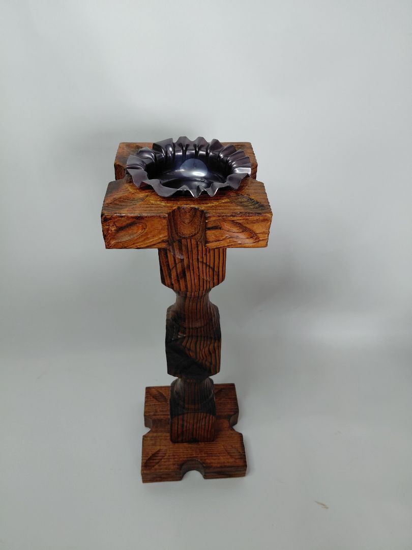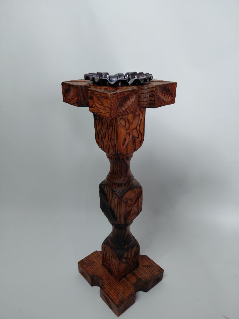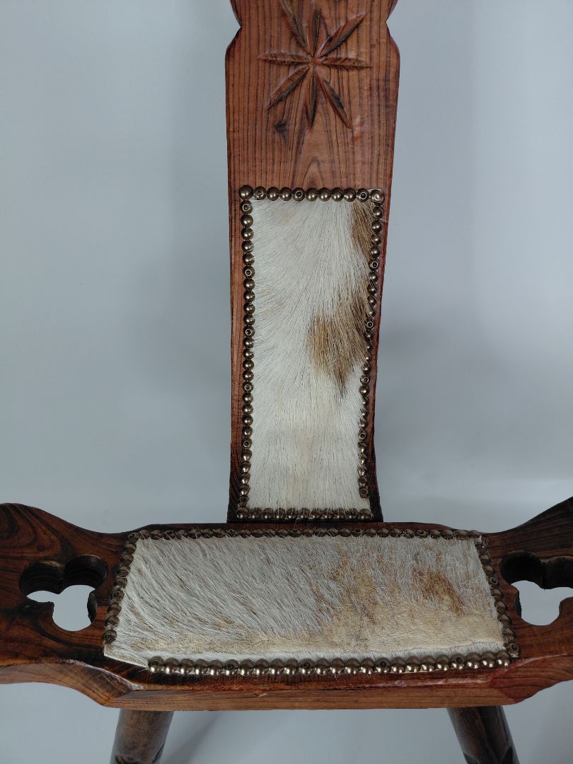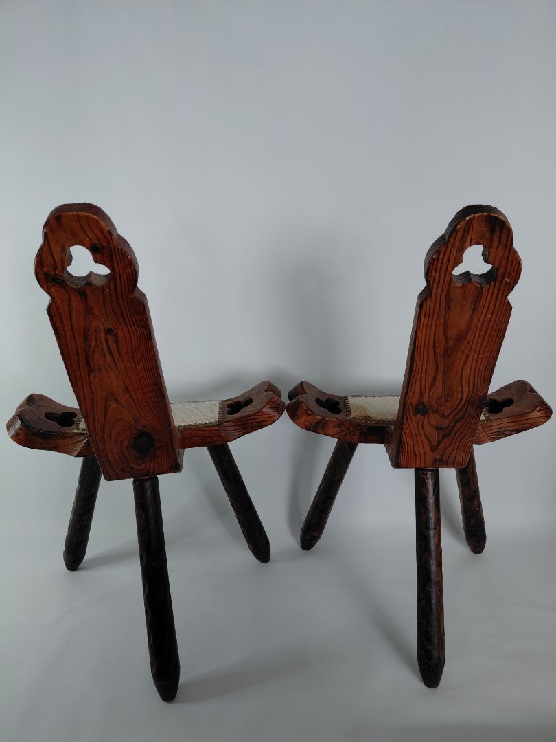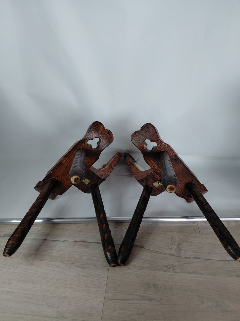 Tveir þrífótastólar ásamt standi með skál í, þetta sett er spænsk hönnun a.m.k frá árunum 1960-1970 og urðu vinsælir a níunda áratugnum sem húsgögn. Settið er handgert og útskortið og eru stólarnir bólstraðir að öllum líkindum með geitaskinni. Einstaklega þægilegir stólar.