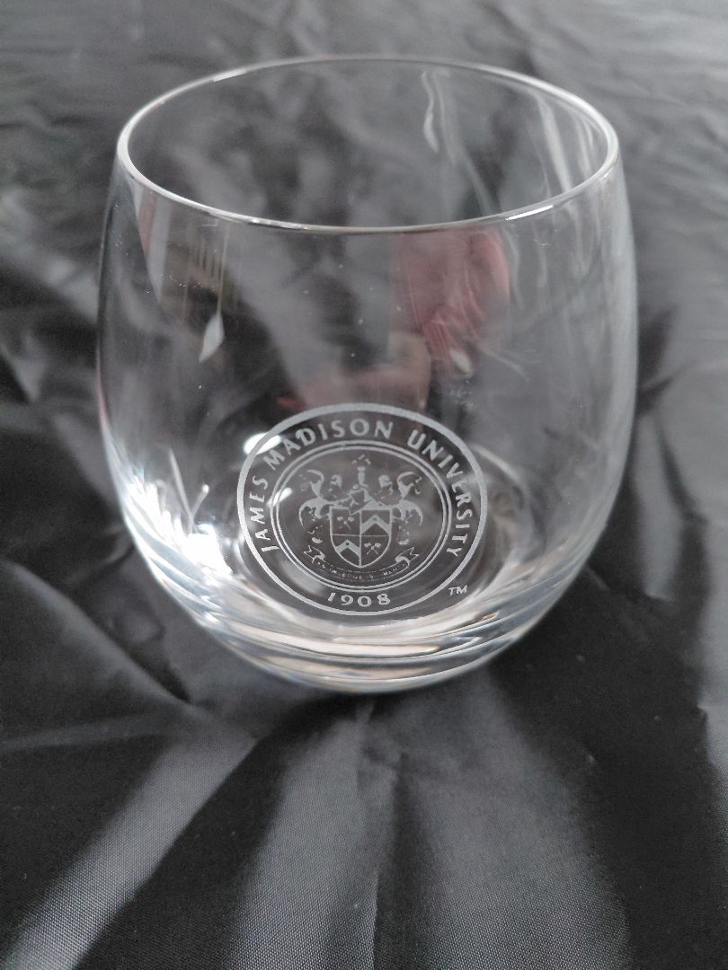 Kúpt rauðvínsglös merkt James Madison University 1908. Þessi glös henta líka vel t.d fyrir vatn eða aðra drykki.