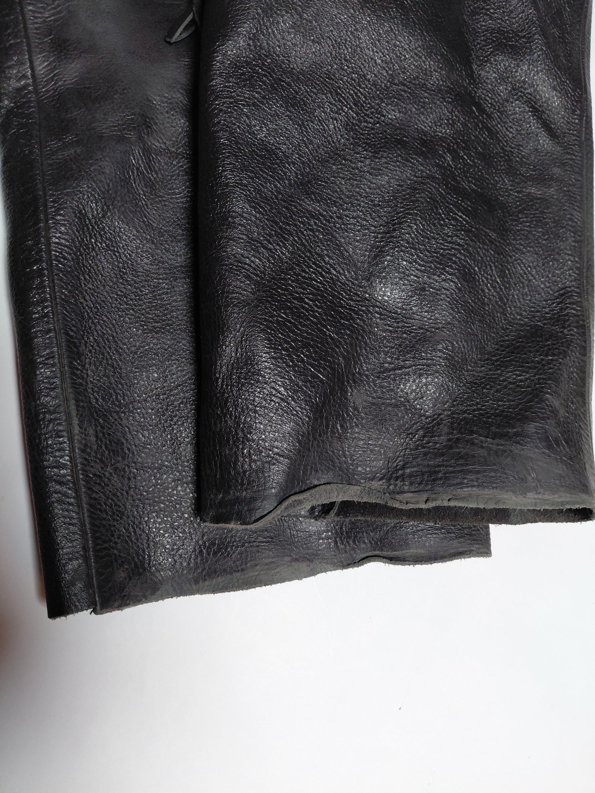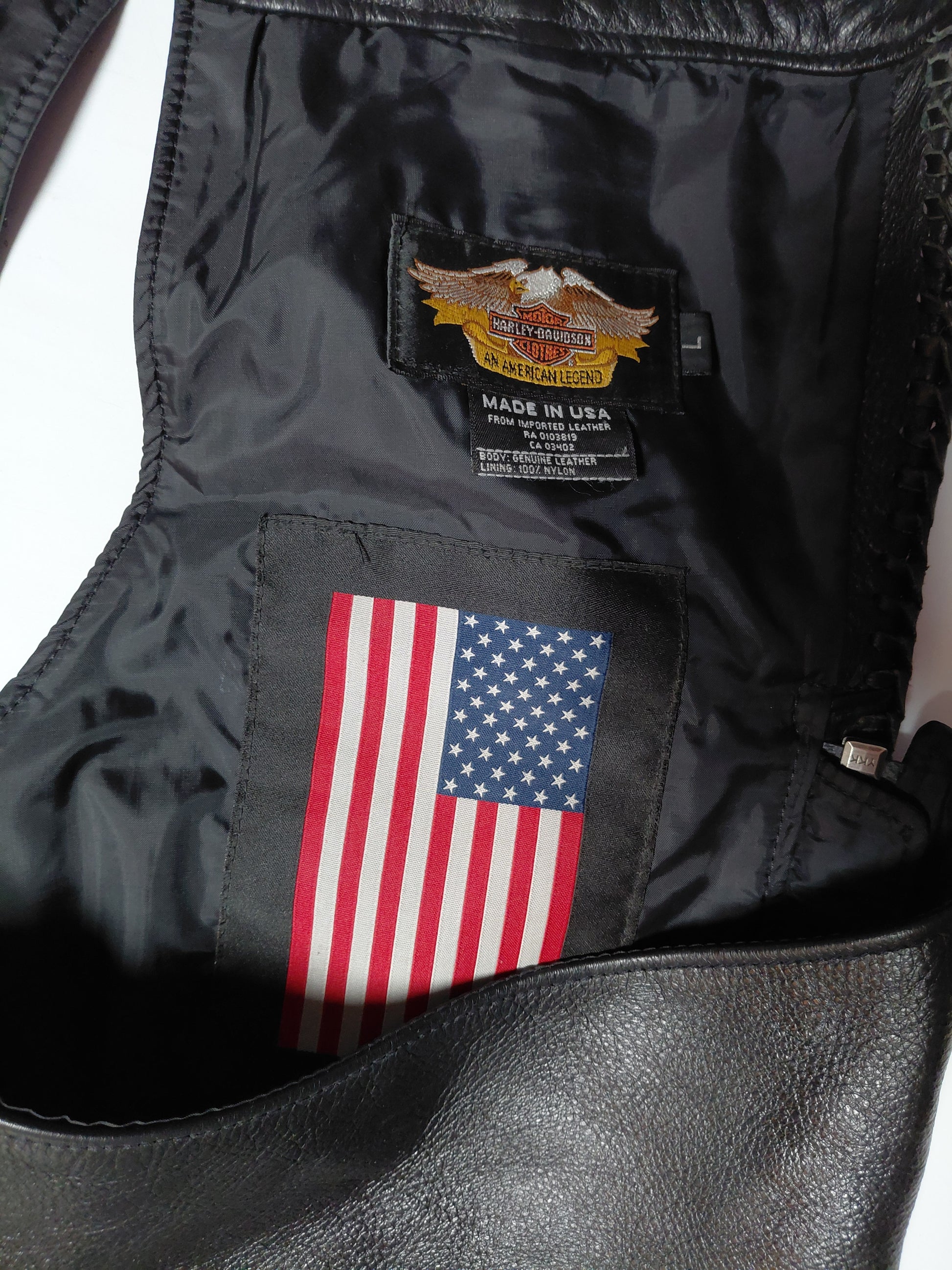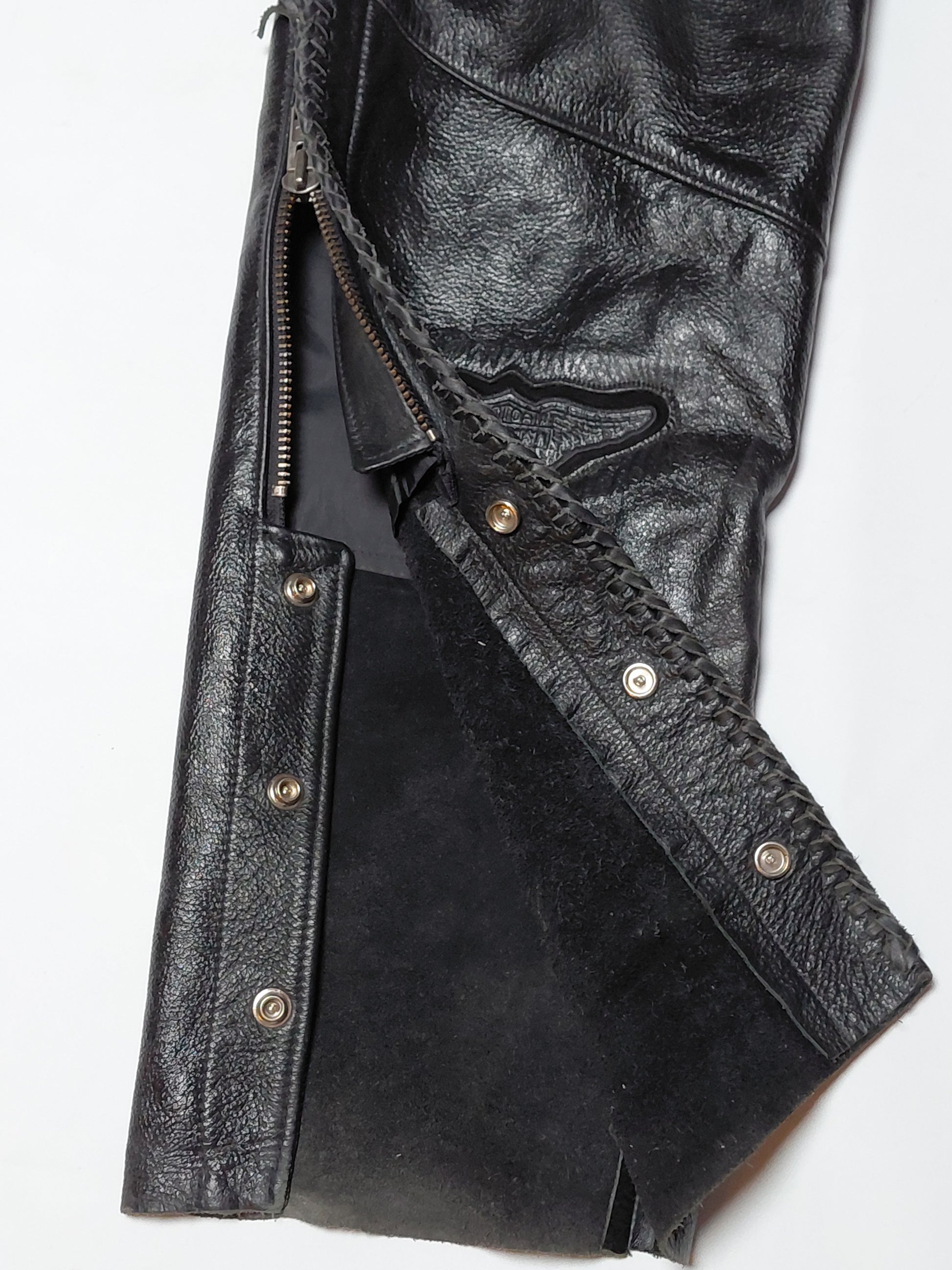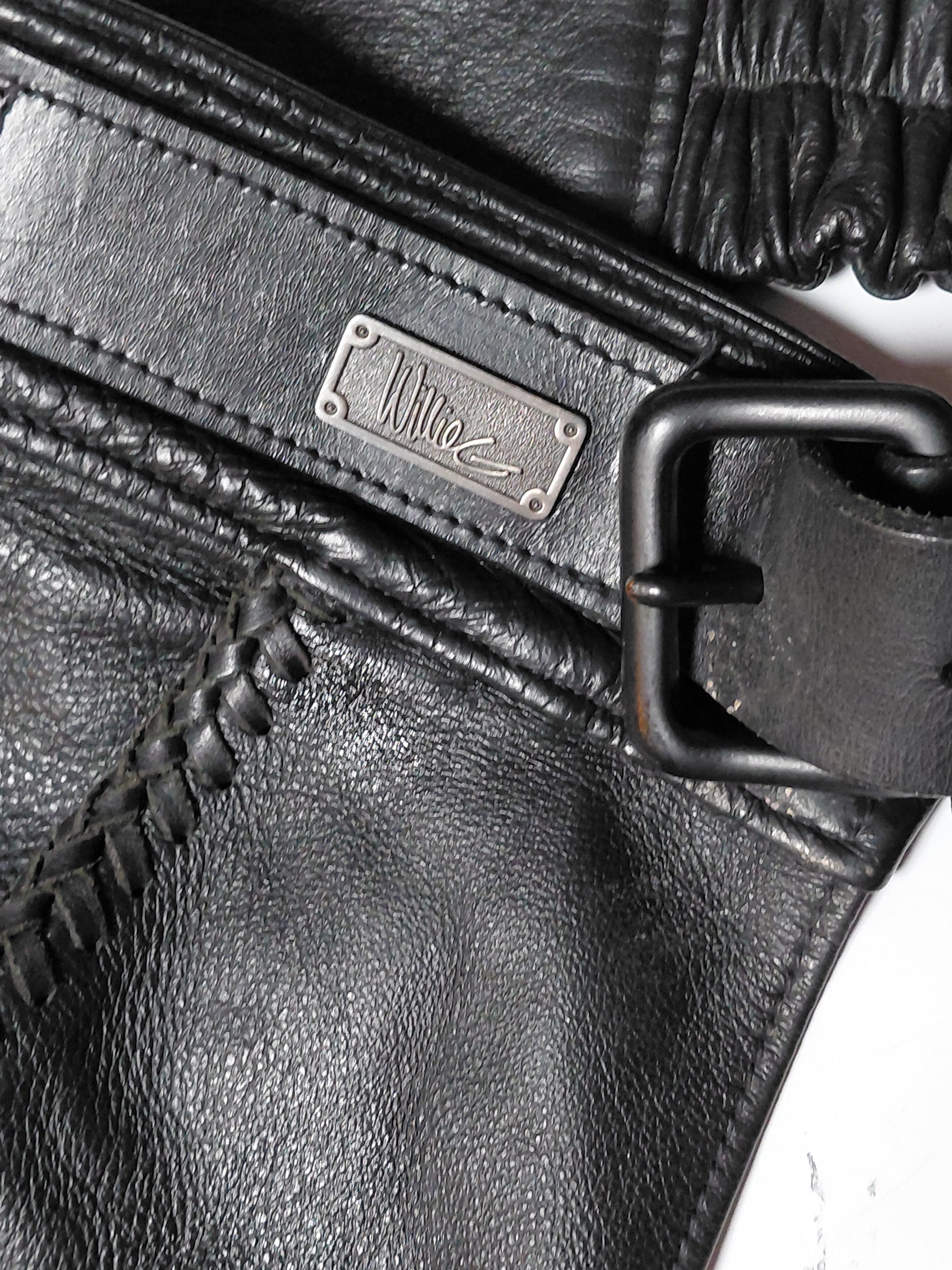 Klassískar Harley Davidson Willie G ekta leðurbuxur opnar í klofið og ætlað að vera t.d. yfir gallabuxum. Buxurnar eru með belti og teygju í baki og því mittismálið nokkuð sveigjanlegt.