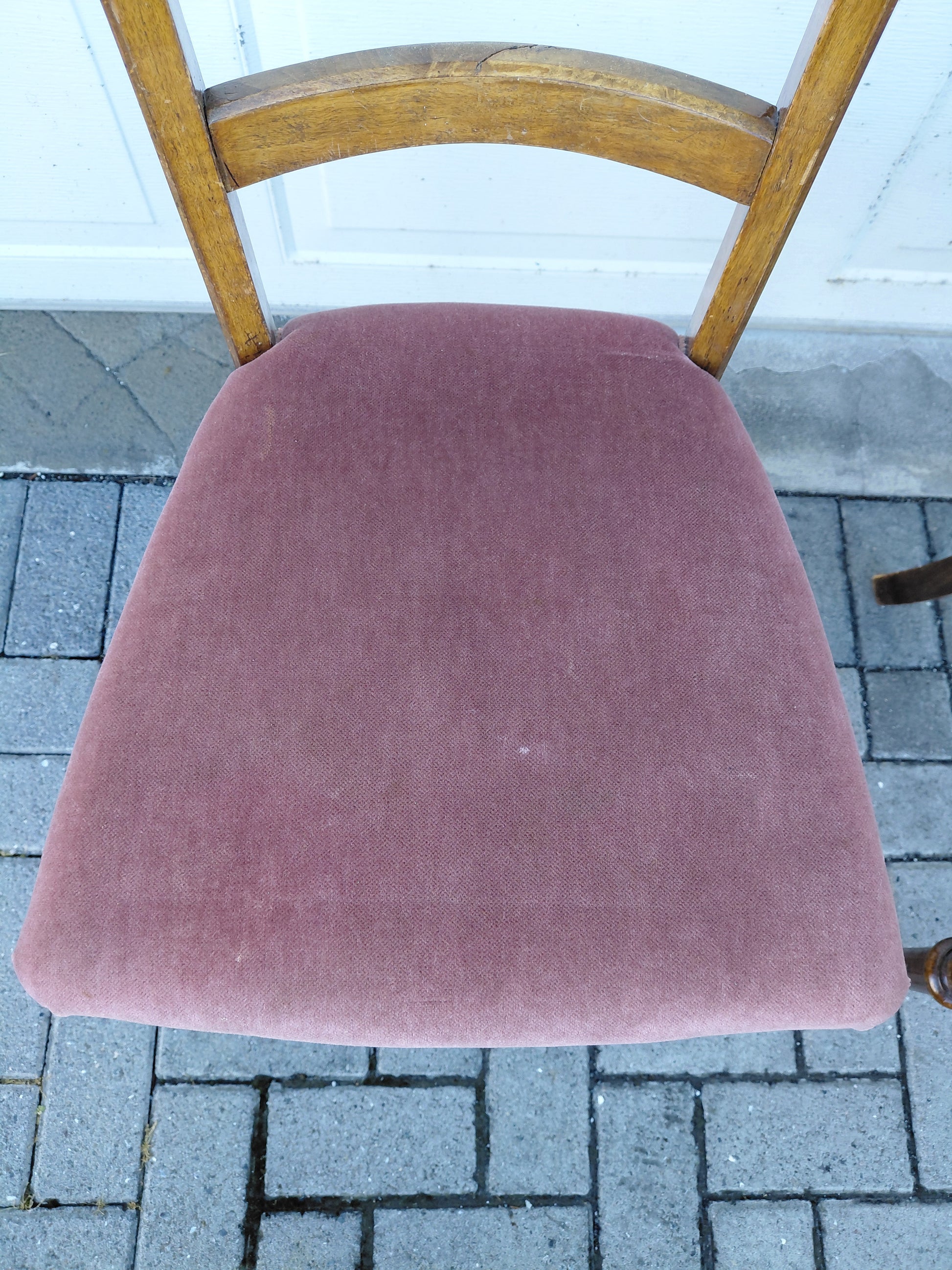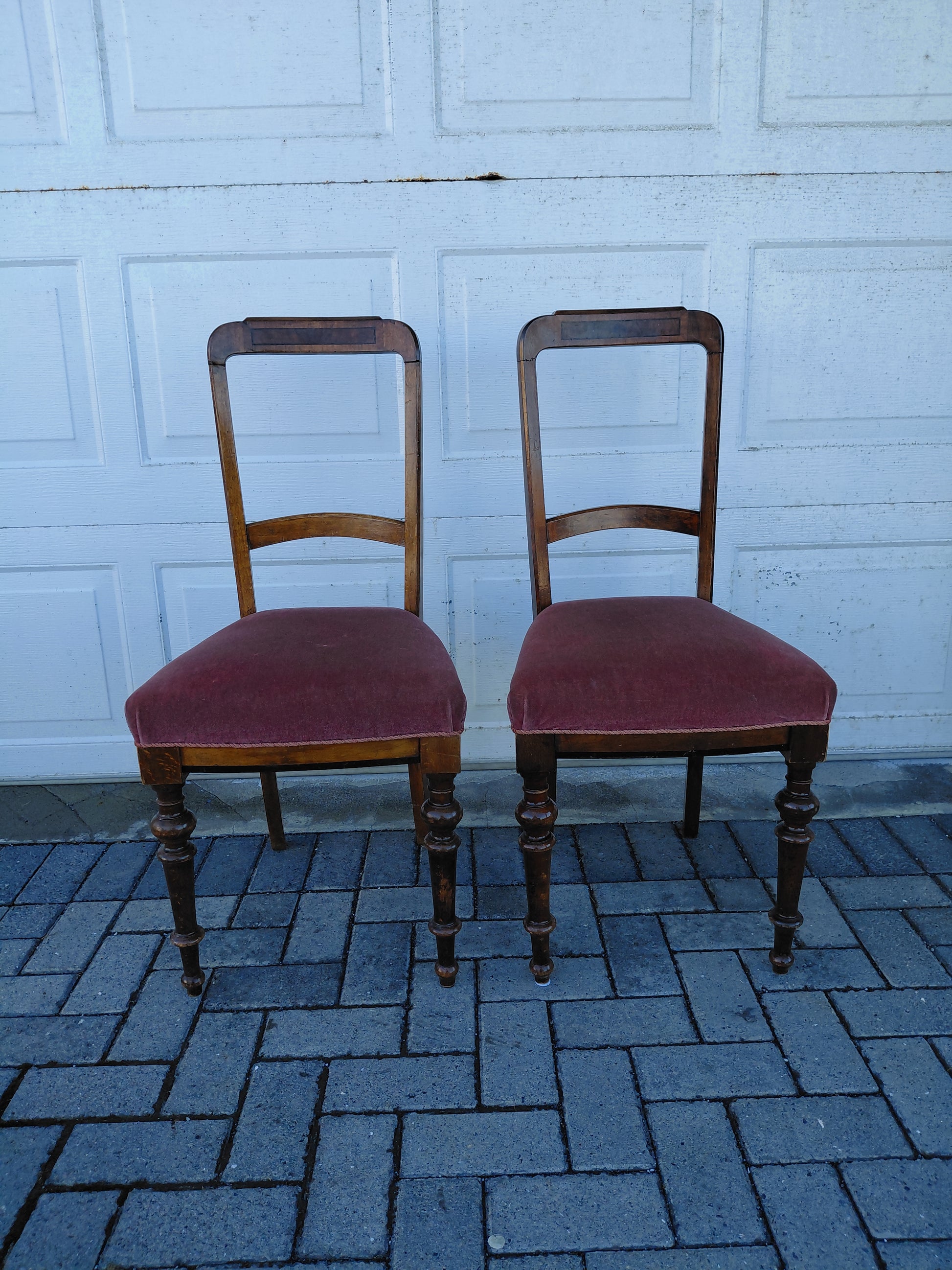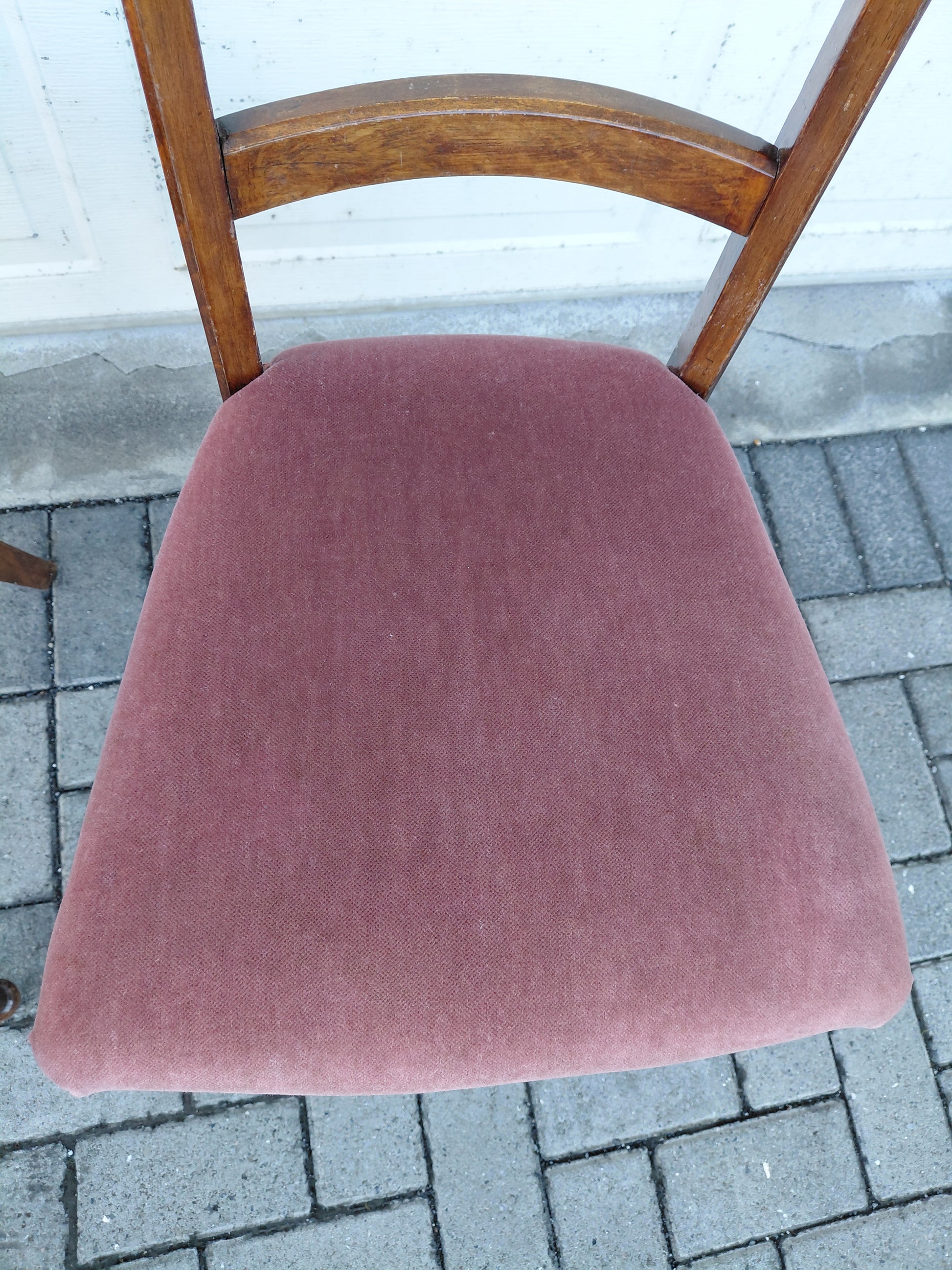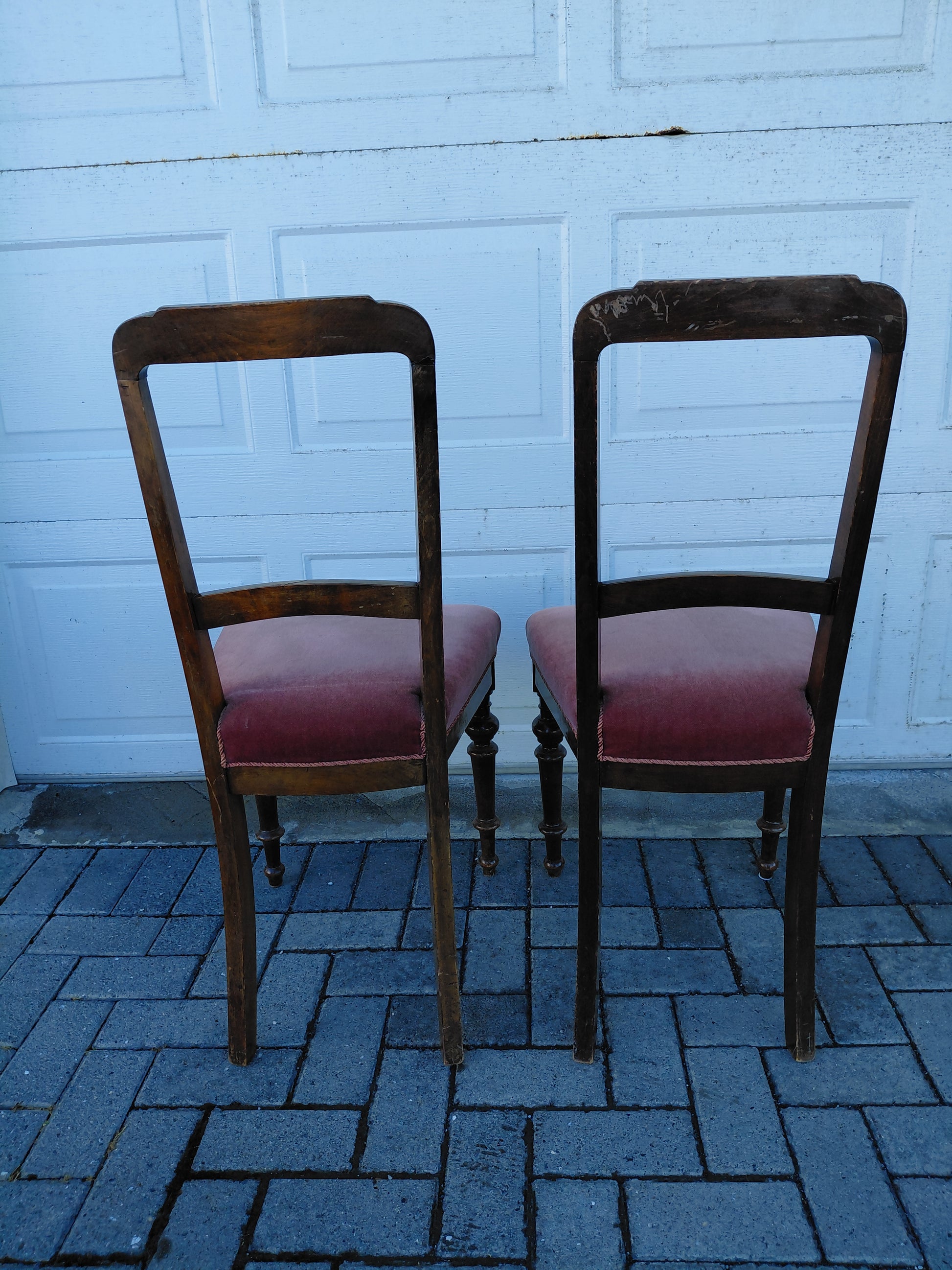 Fallegir antík borðstofustólar, 2 stk sem seljast saman, með ljósbleiku kóngaflauels áklæði. Stólarnir eru útskiornir í baki og á fótum. Þessir stólar eru í mjög góðu standi fyrir utan rispur og lítill ljós blettur á annarri sessunni (sjá myndir) og er tekið mið af því í verði. Báðir stólarnir seljast saman.