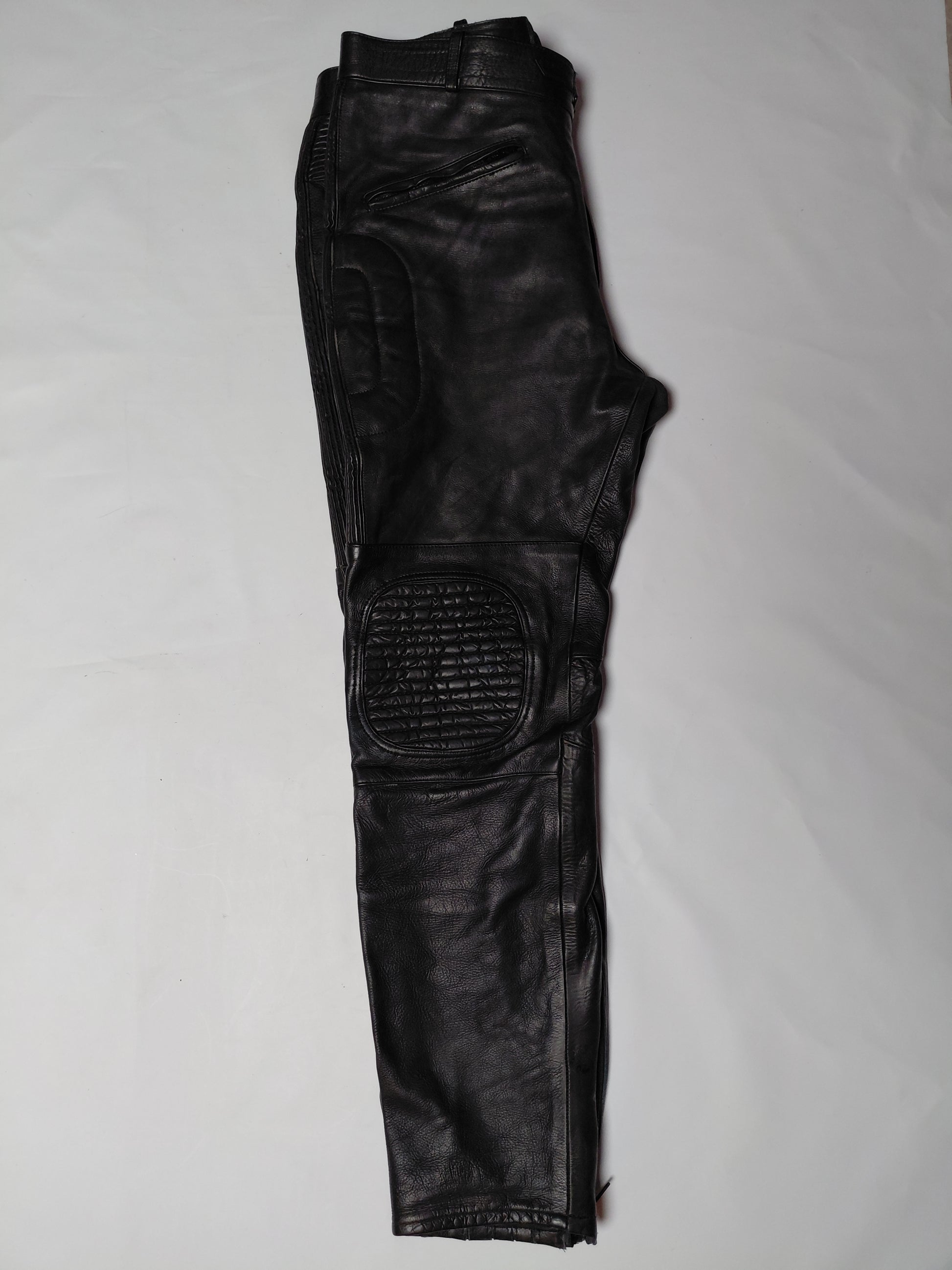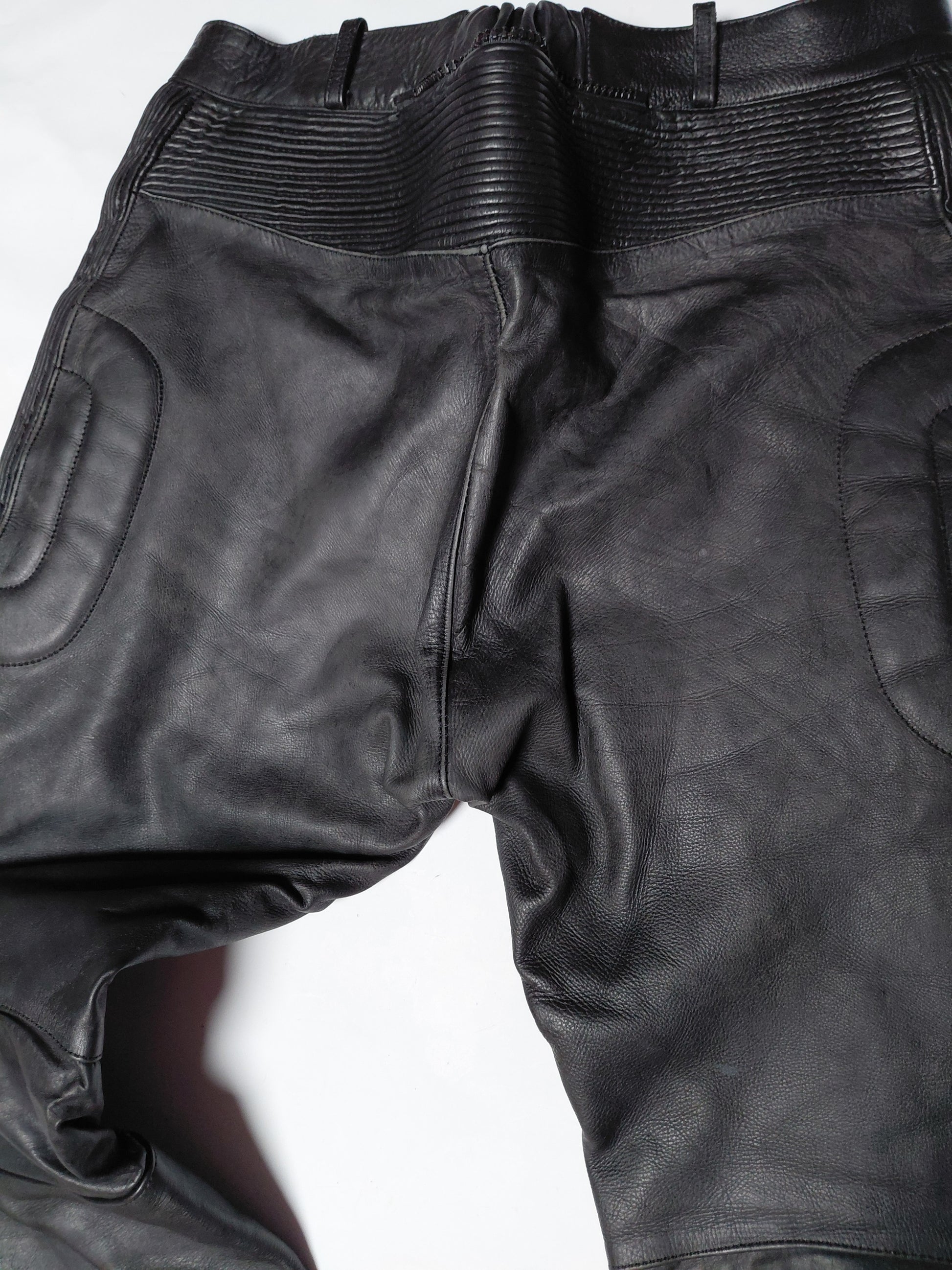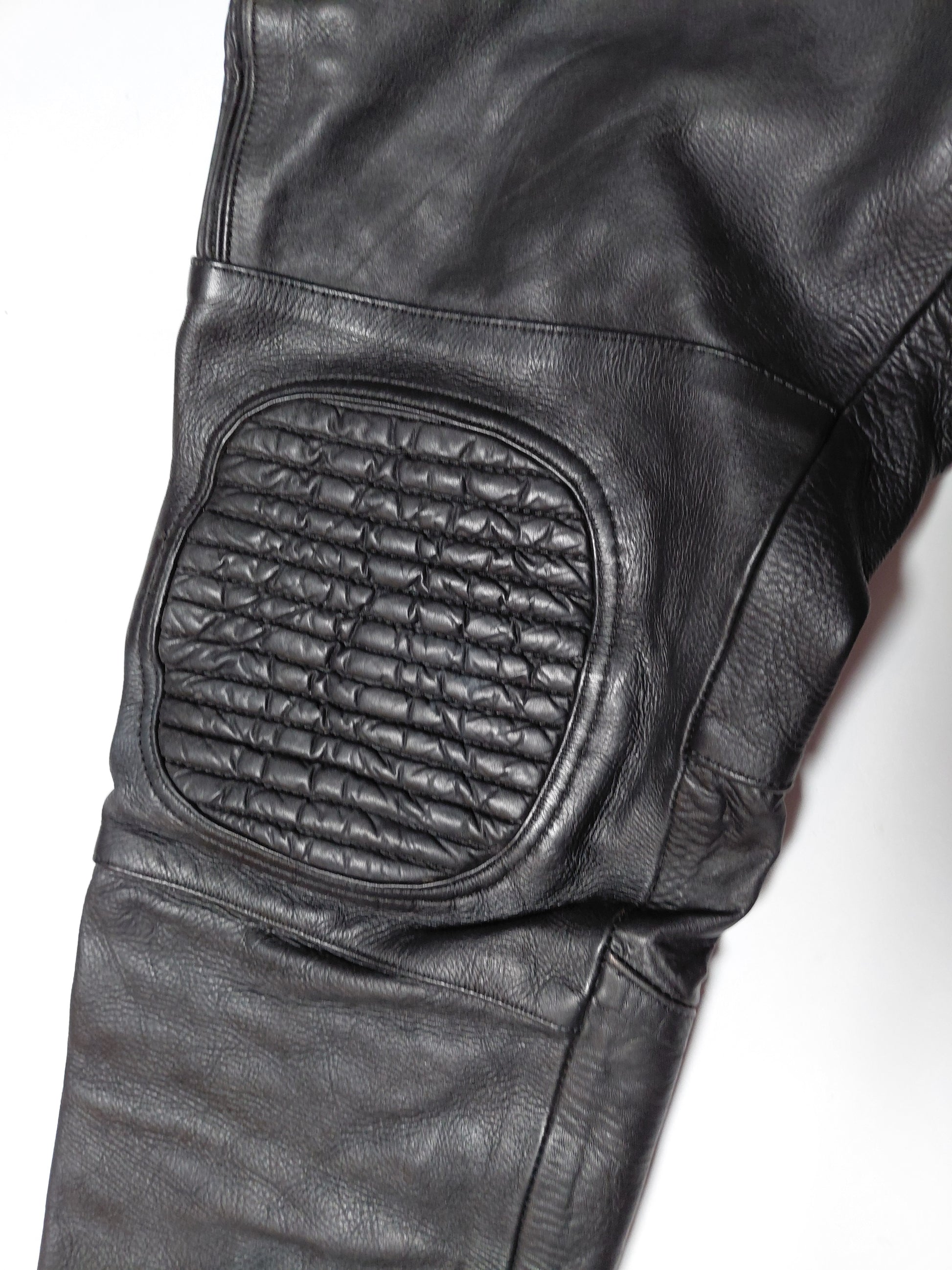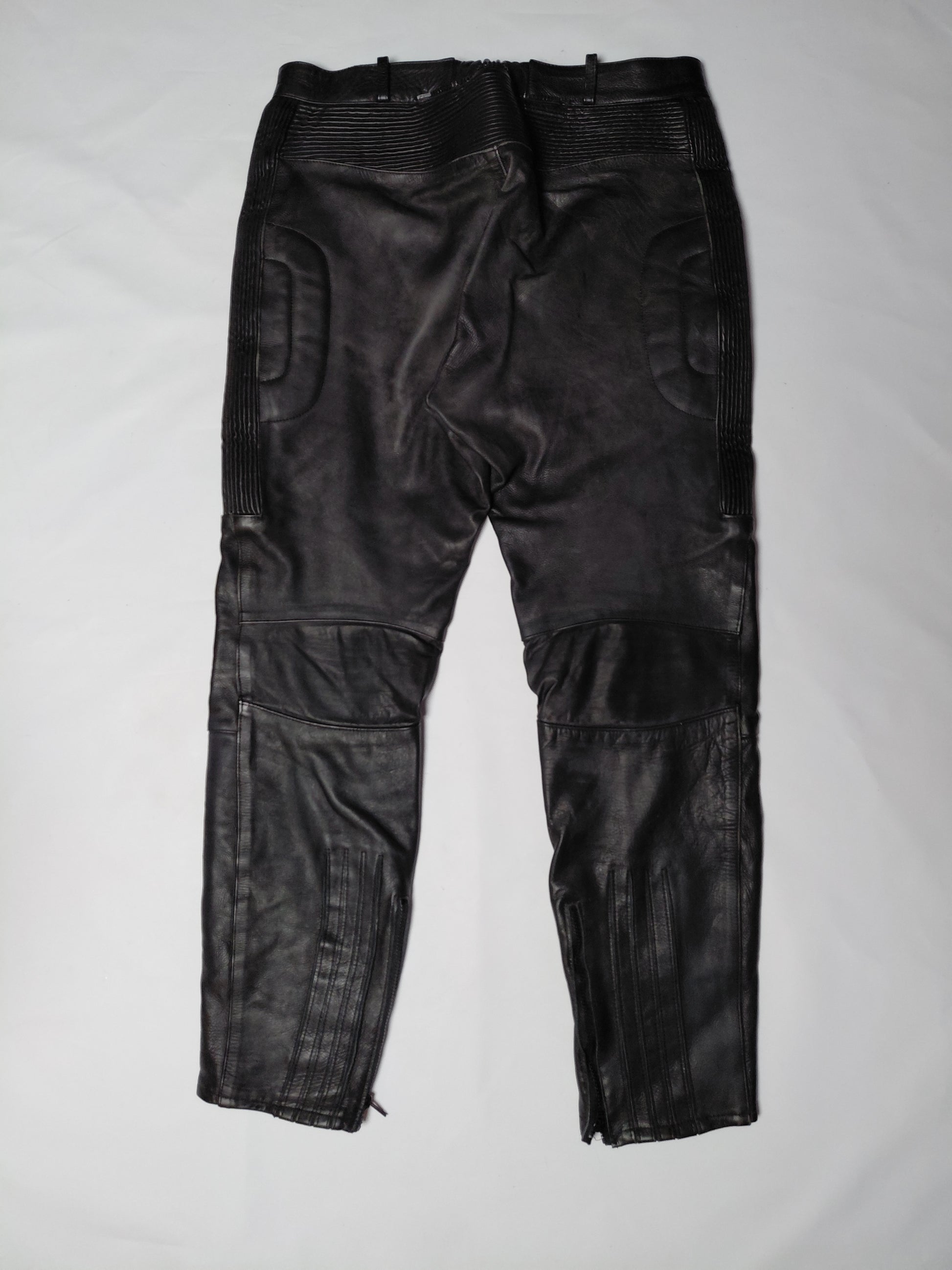 Klassískar leður mótorhjólabuxur frá AMX og eru fóðraðar að innan með svörtu fóðri, eru með púðum á hnjá og á mjöðmum.