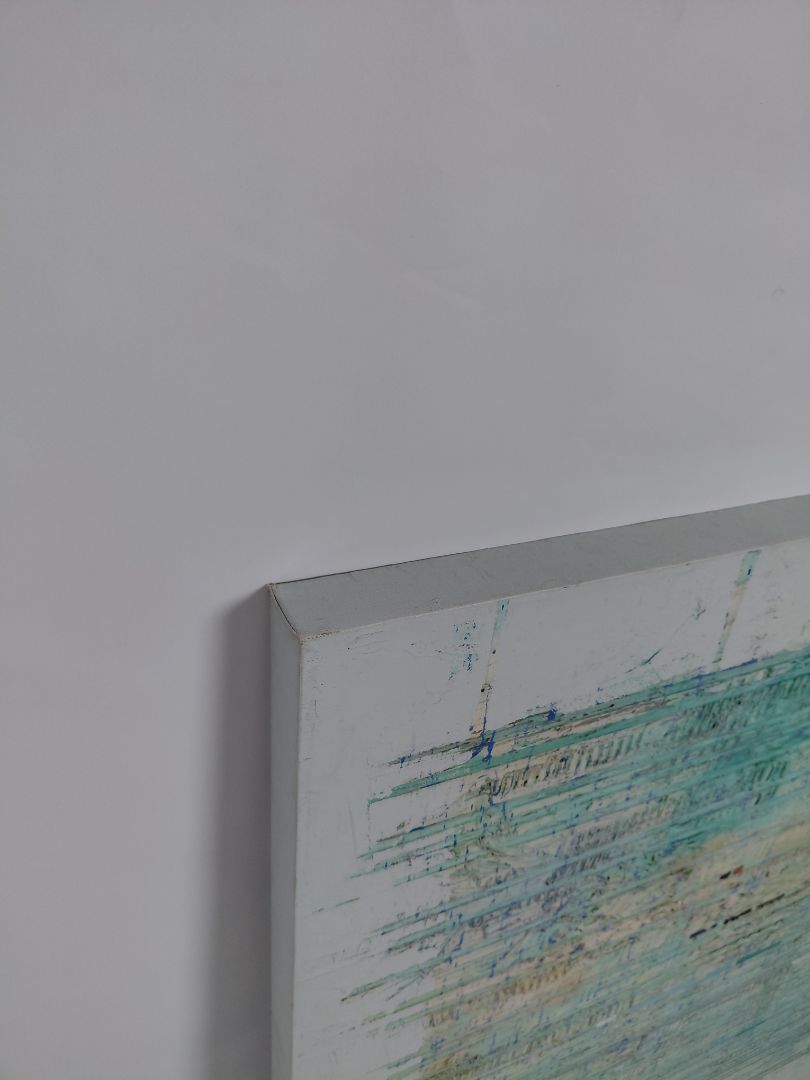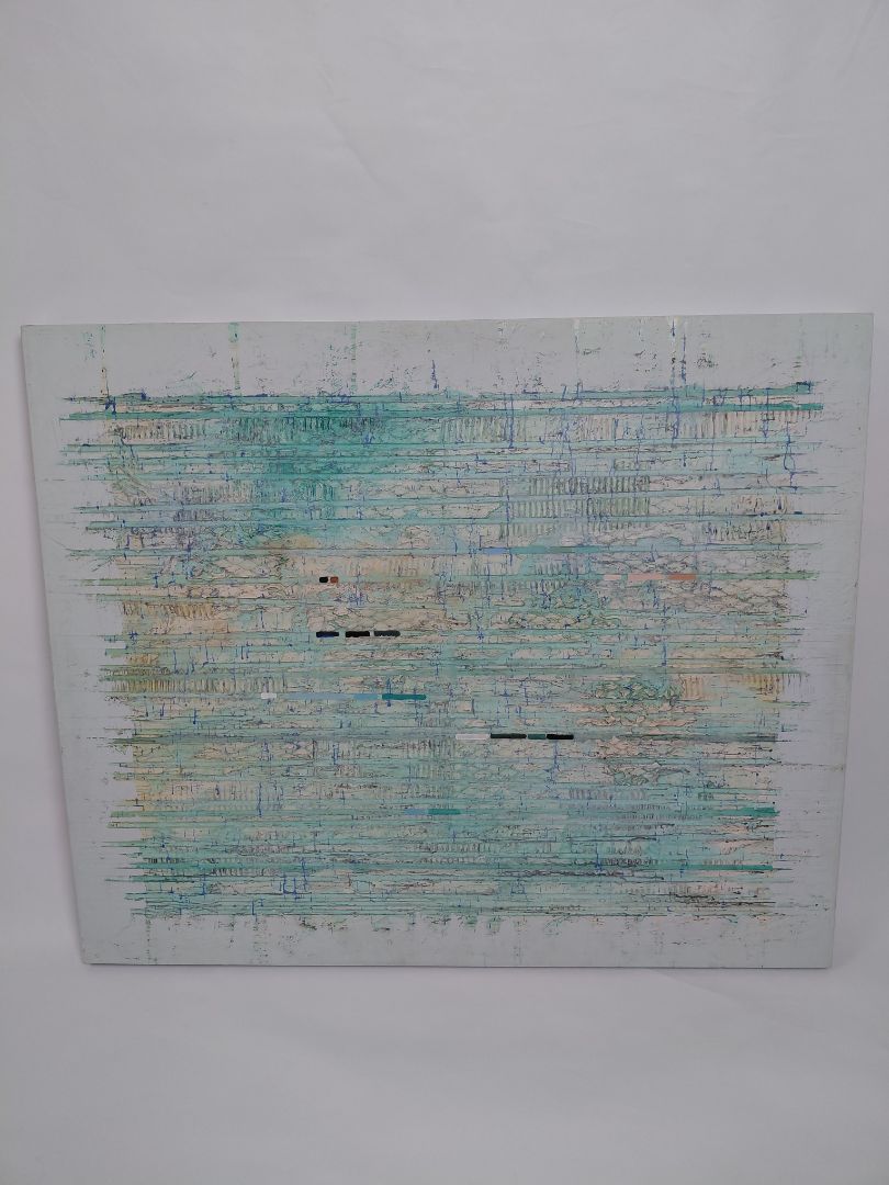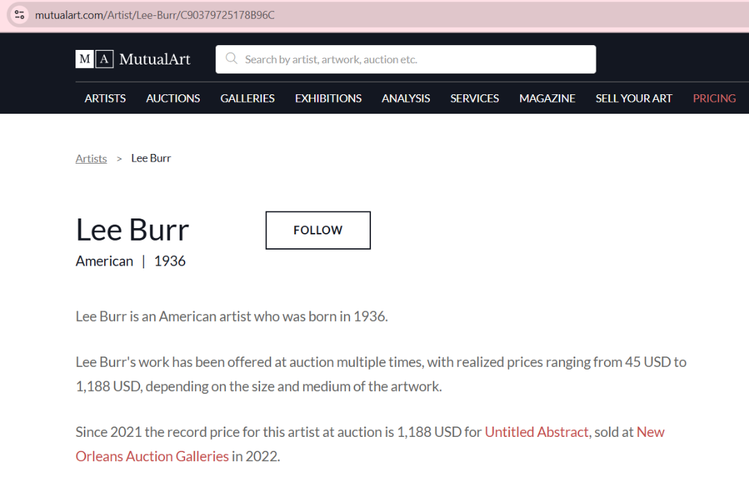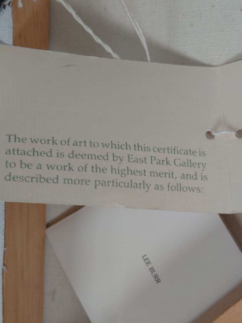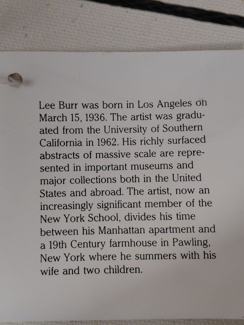 Fallegt abstract olíu og akríl málað á striga af listamanninum Lee Burr. Verk eftir hann hafa selst á uppboðum allt frá $45 til $1200, það dýrasta seldist árið 2022.