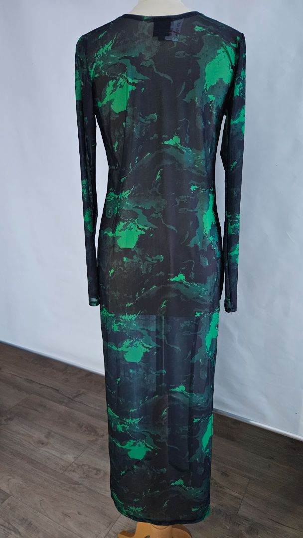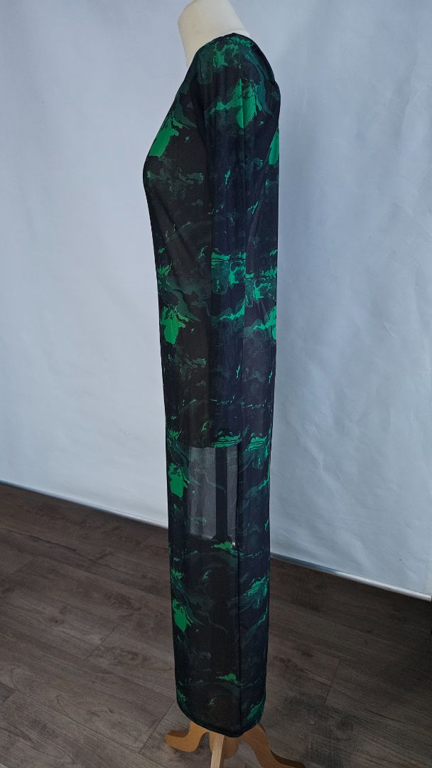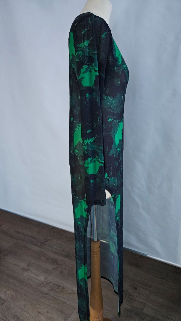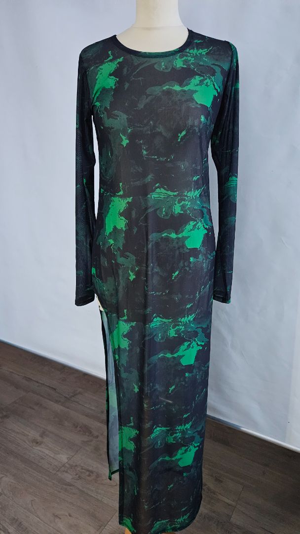 Þröngur stretch kjóll með langri klauf á annarri hliðinni.