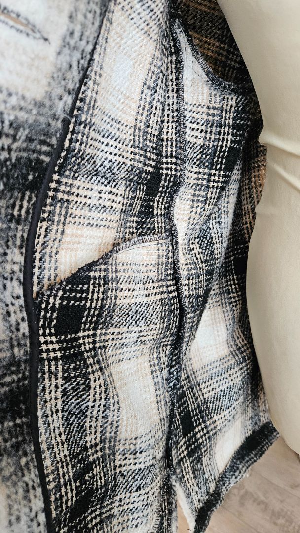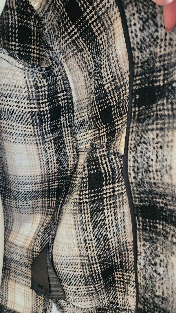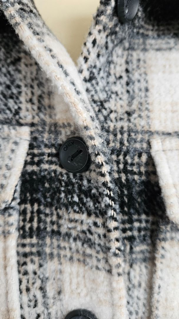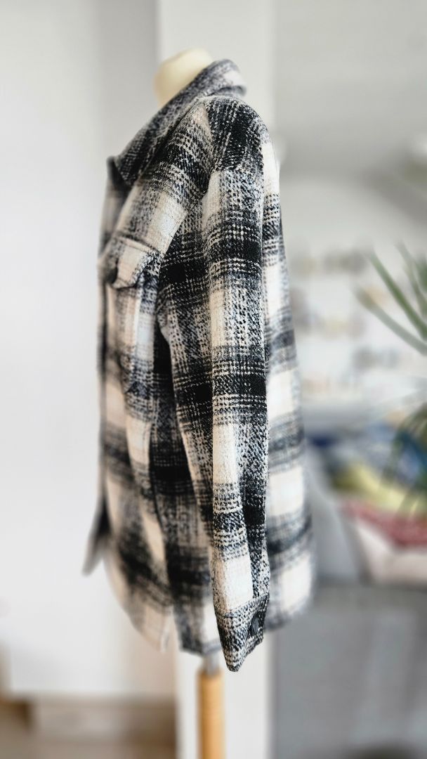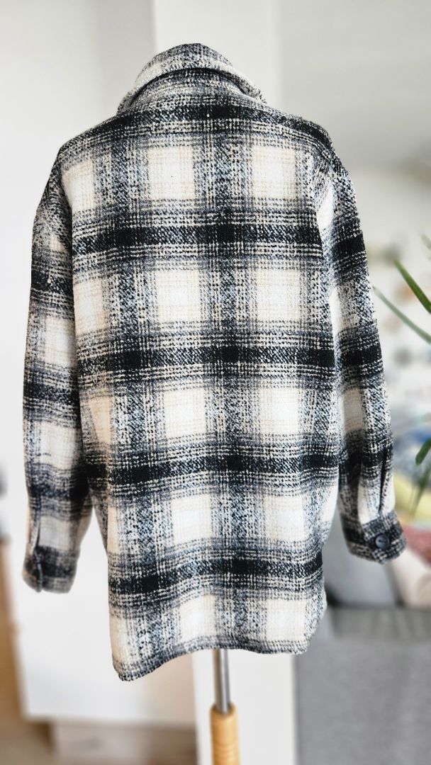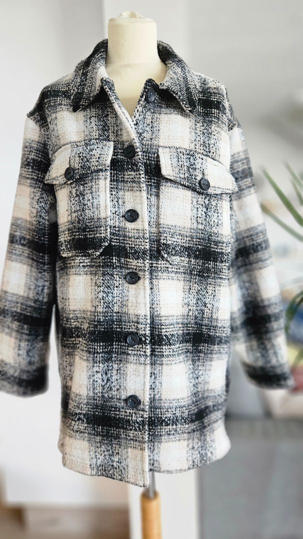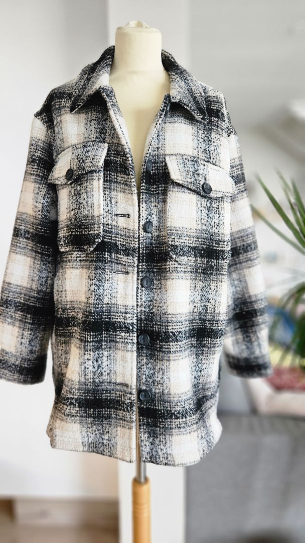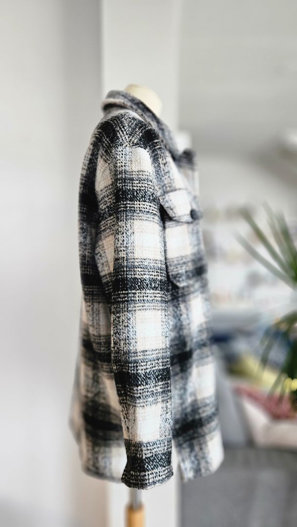 Hlýr og þykkur skyrtu jakki í kremuðum, brúnum, hvítum og svörtum lit.