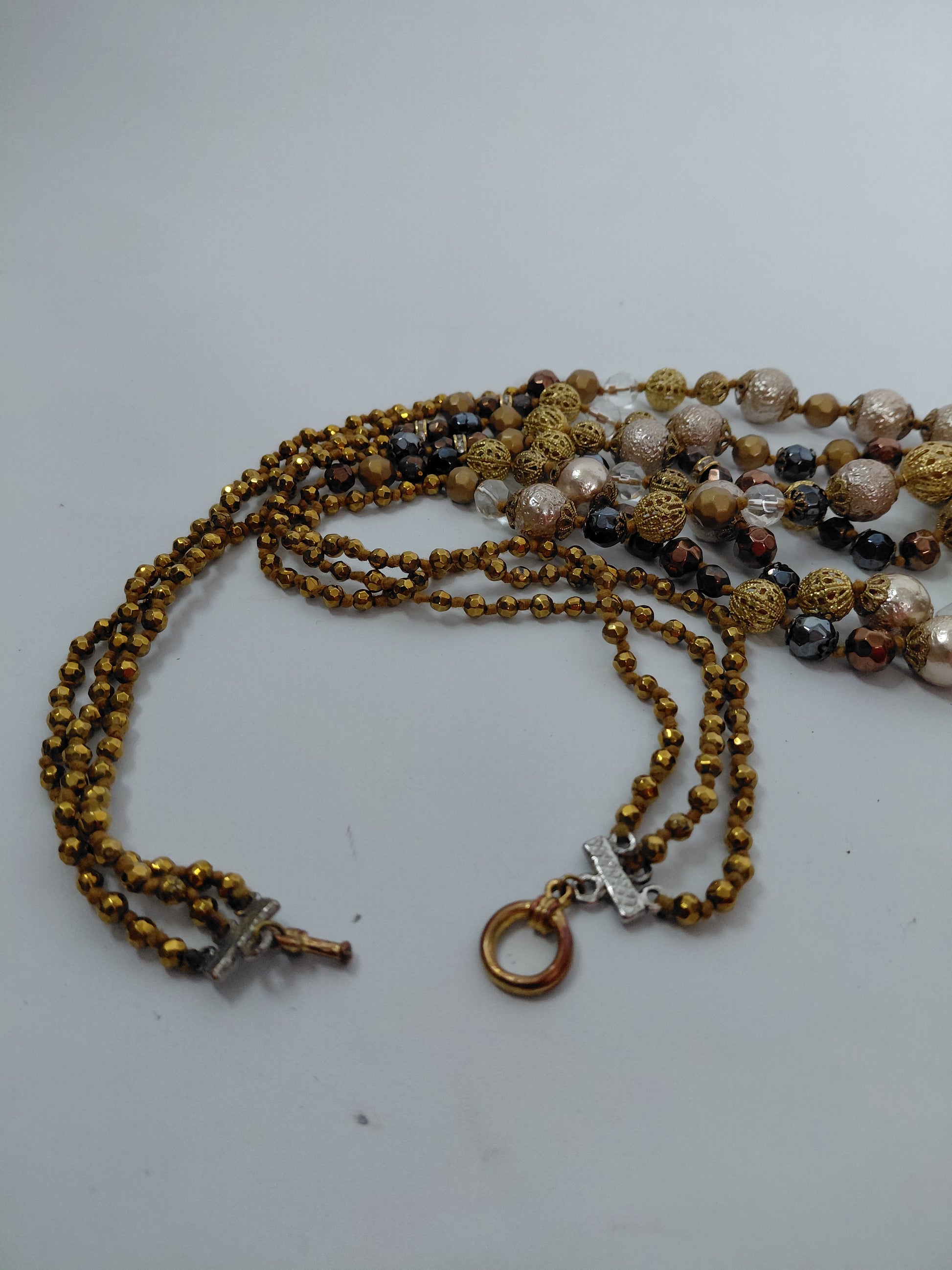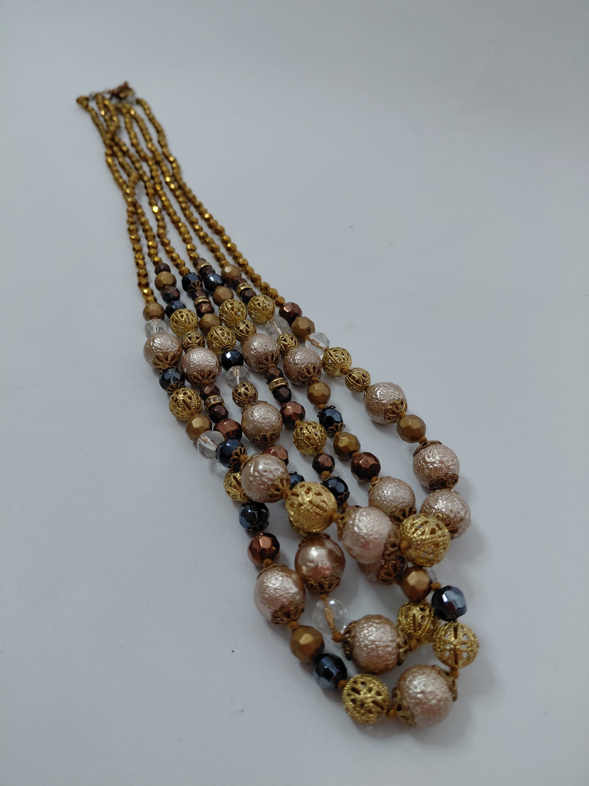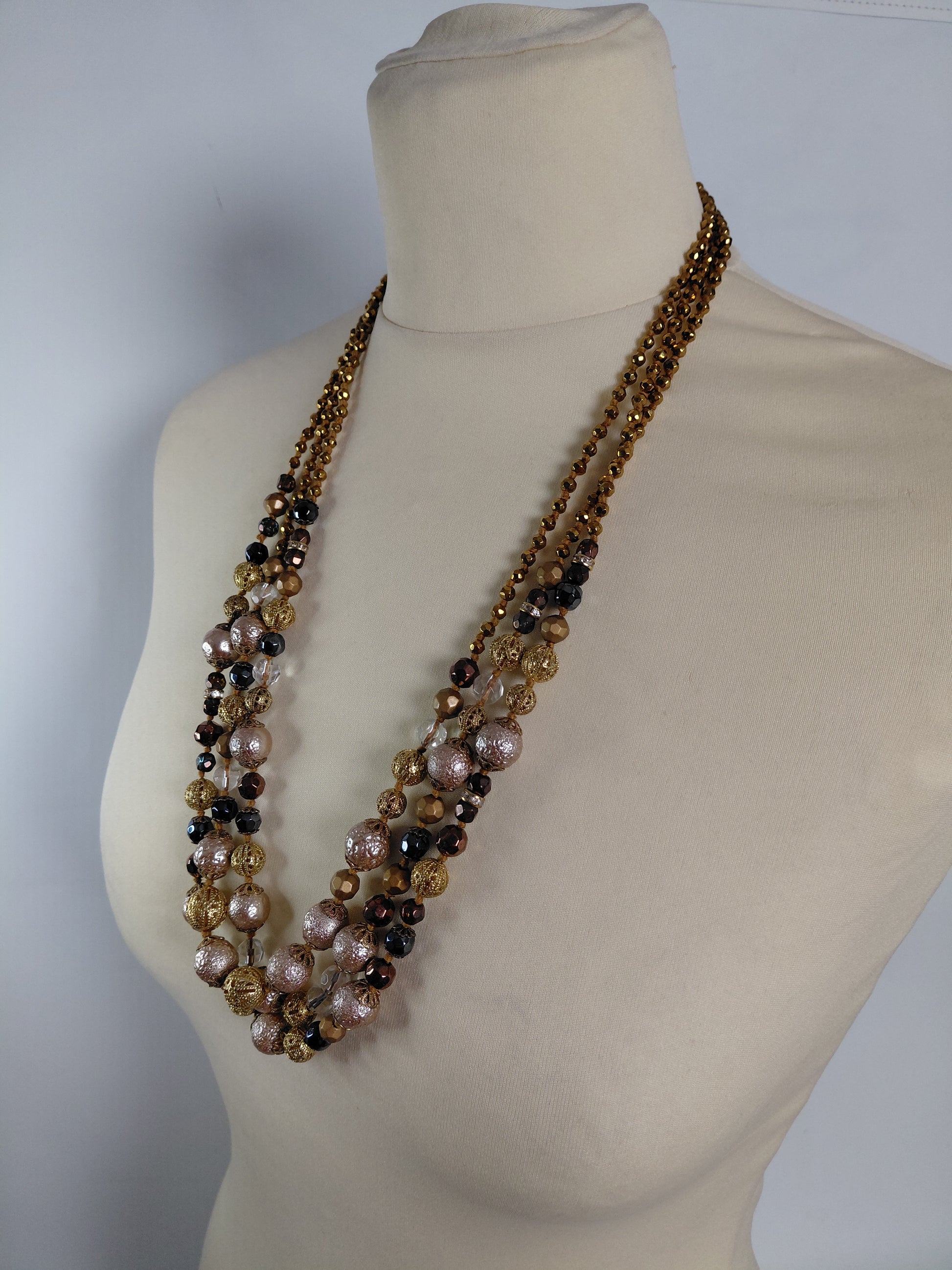 Sítt gylllt hálsmen með dökkbláum og koparlituðum kúlum.