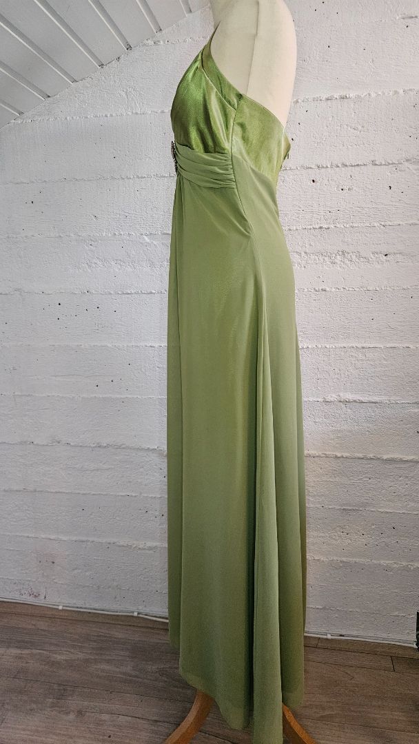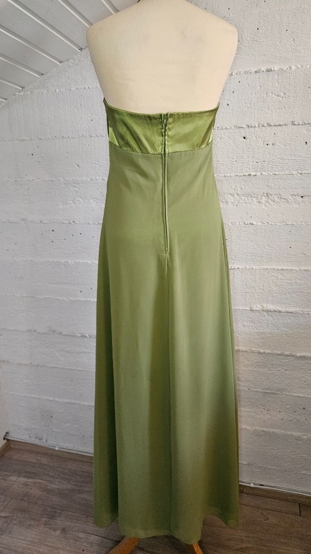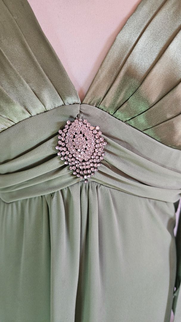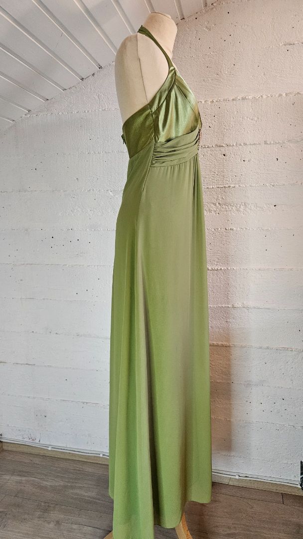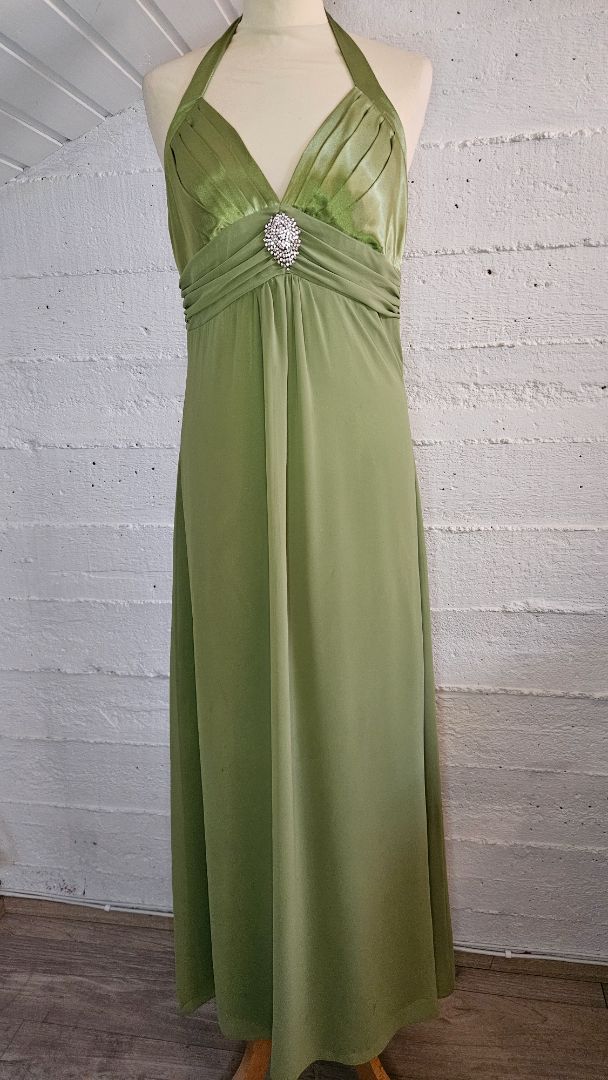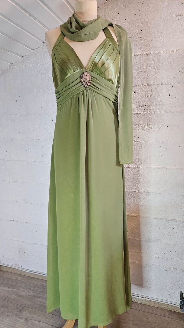 Gullfallegur grænn vintage síðkjóll frá ca 1980 sem er mjög lítið notaður og einstaklega vel með farin. Slæðan í stíl fylgir með. Kjóllinn er með fallegum kristöllum á bringu, örlitlum brjóstapúðum og fóðraður að innan.