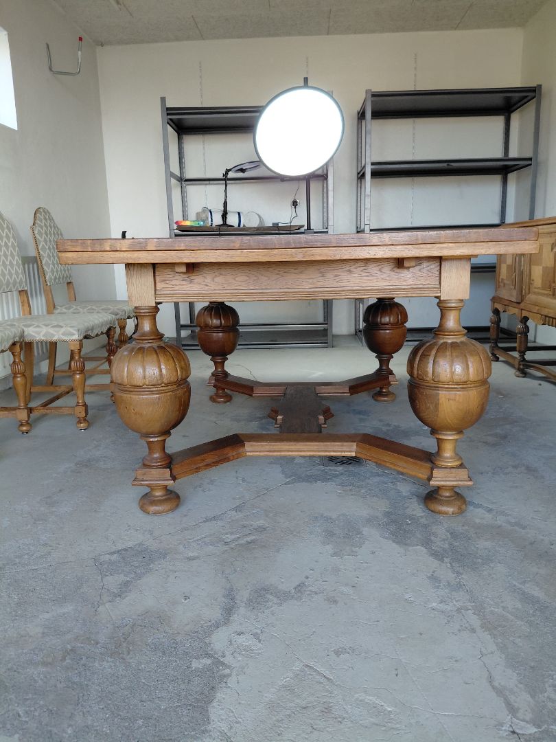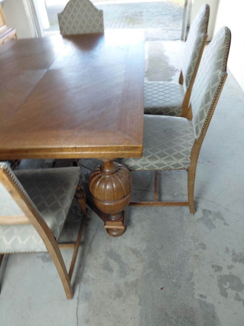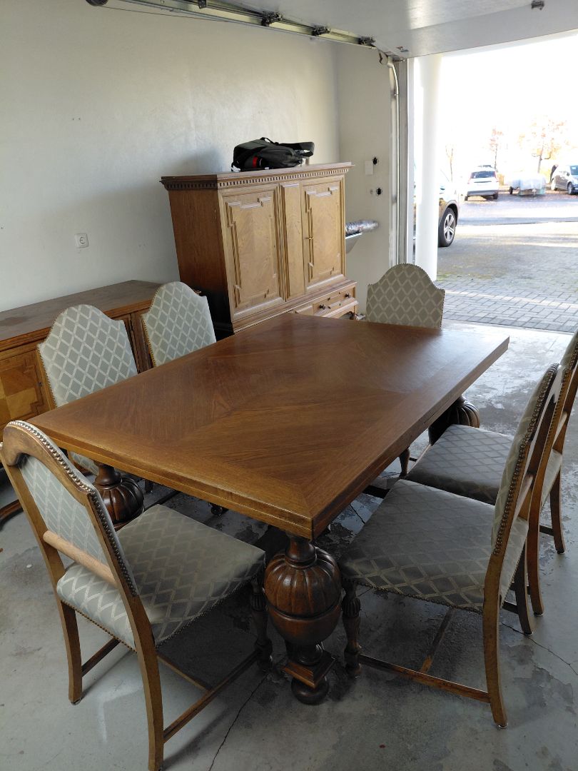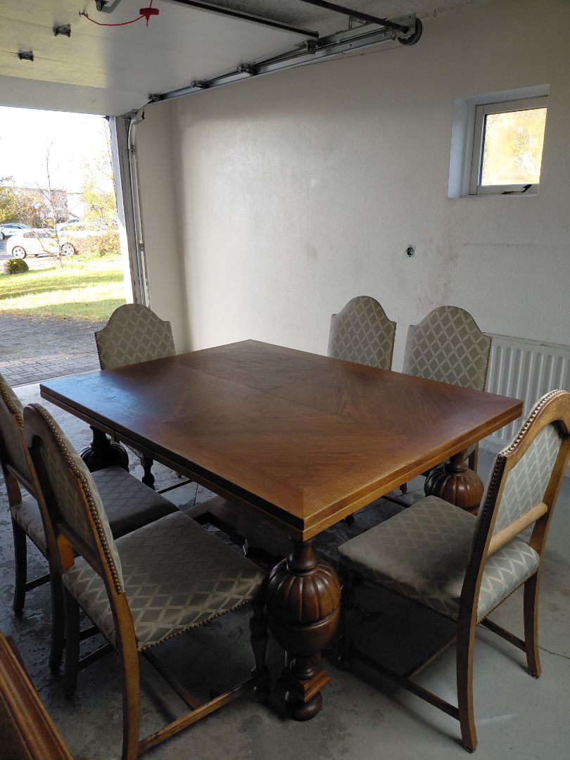 Fallegt og einstaklega vel með farið borðstofuborð ásamt 6 stólum úr gegnheilli eik. Upprunaleg kaupnóta er til staðar til sönnunar um aldur og uppruna. Einnig fylgir lykill með skápnum. Skápurinn er Renaissance í Jacobian stíl og haldist innan sömu fjölskyldu alla tíð. Alla þessi tugi ára hefur verið vel husað um húsgögnin og þau olíuborin reglulega.