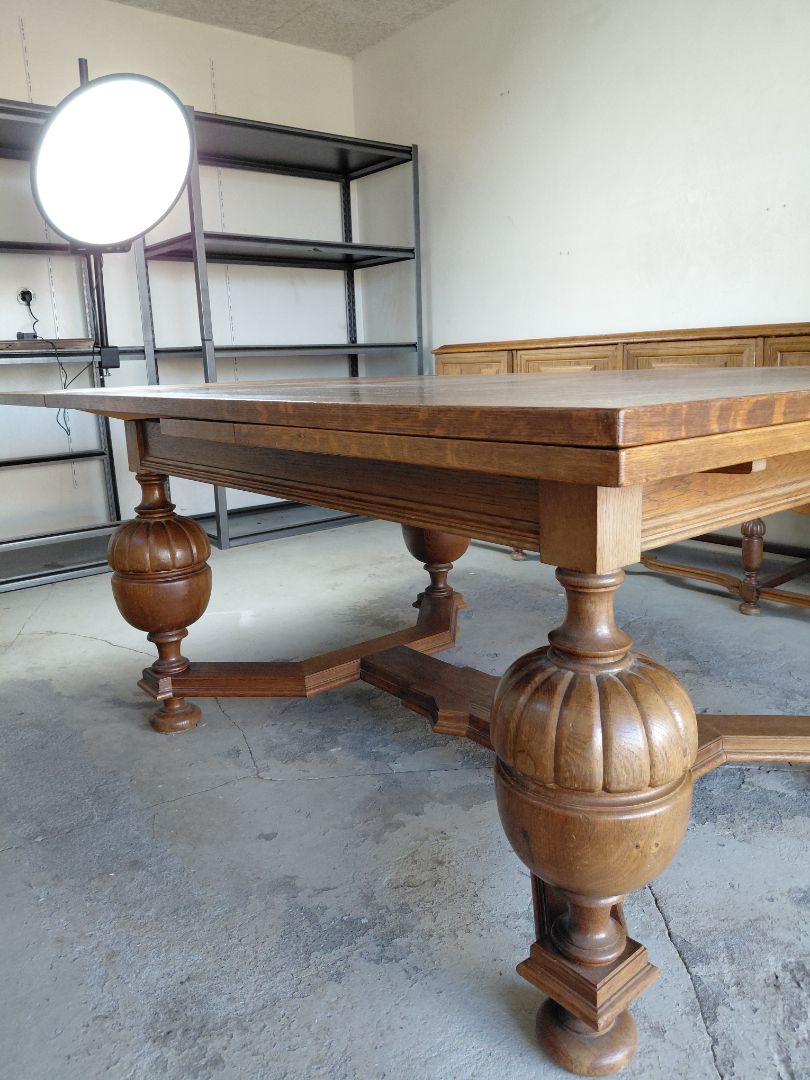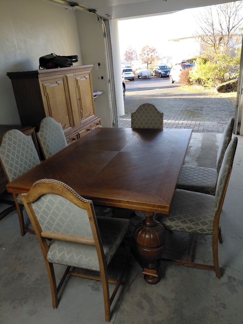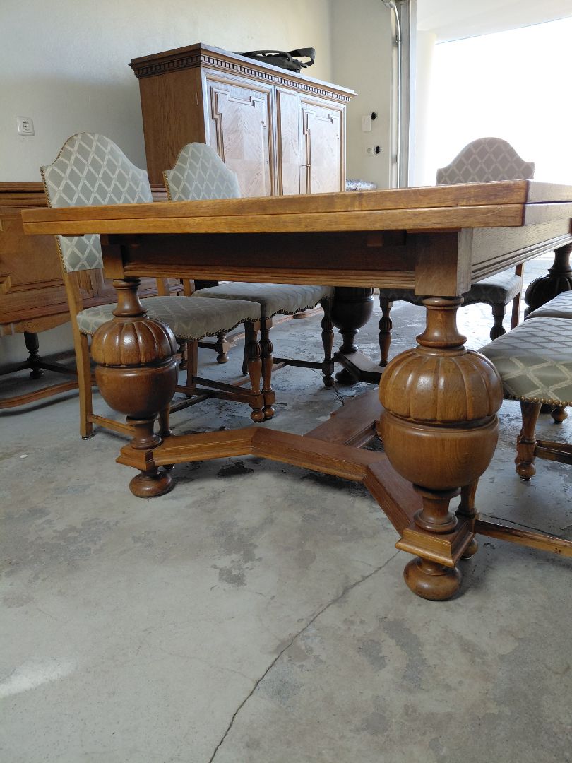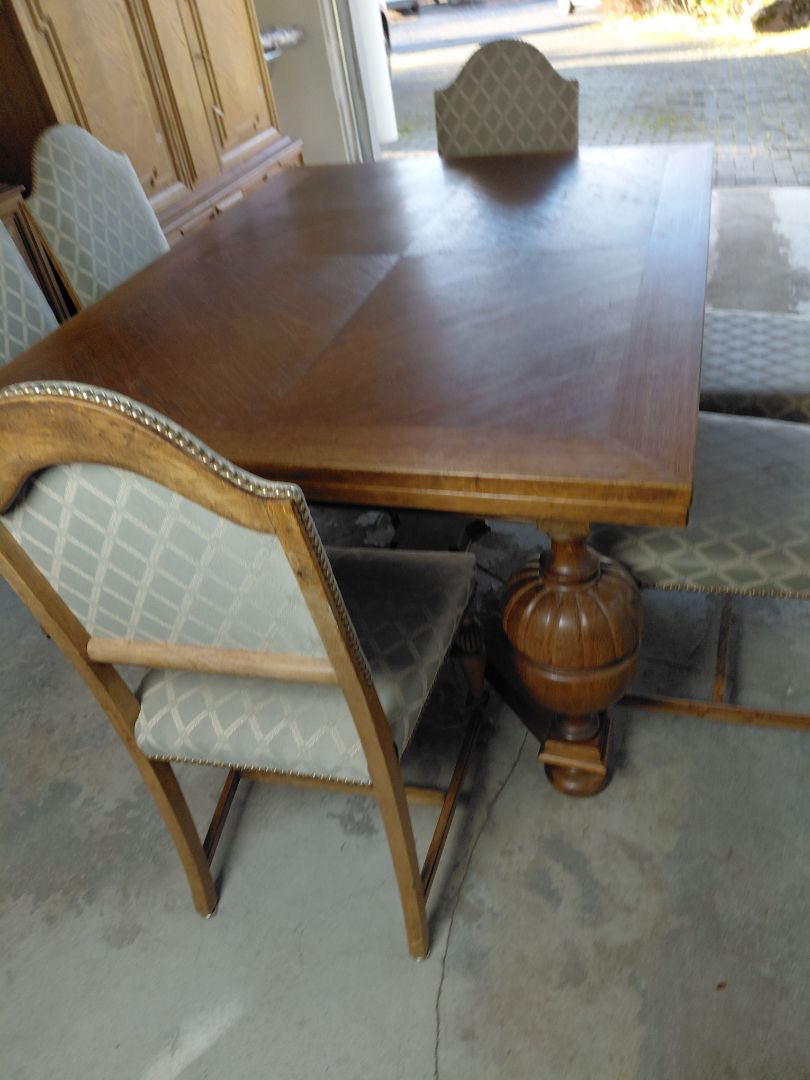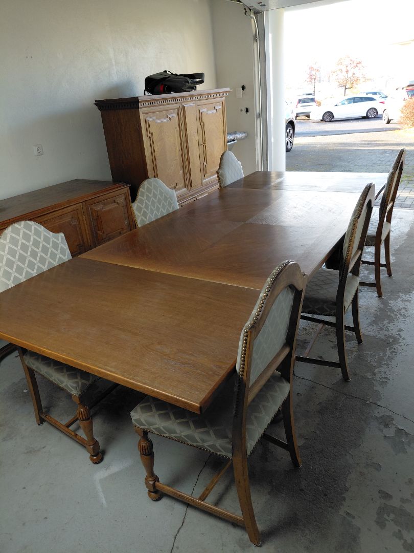 Fallegt og einstaklega vel með farið borðstofuborð ásamt 6 stólum úr gegnheilli eik. Upprunaleg kaupnóta er til staðar til sönnunar um aldur og uppruna. Einnig fylgir lykill með skápnum. Skápurinn er Renaissance í Jacobian stíl og haldist innan sömu fjölskyldu alla tíð. Alla þessi tugi ára hefur verið vel husað um húsgögnin og þau olíuborin reglulega.