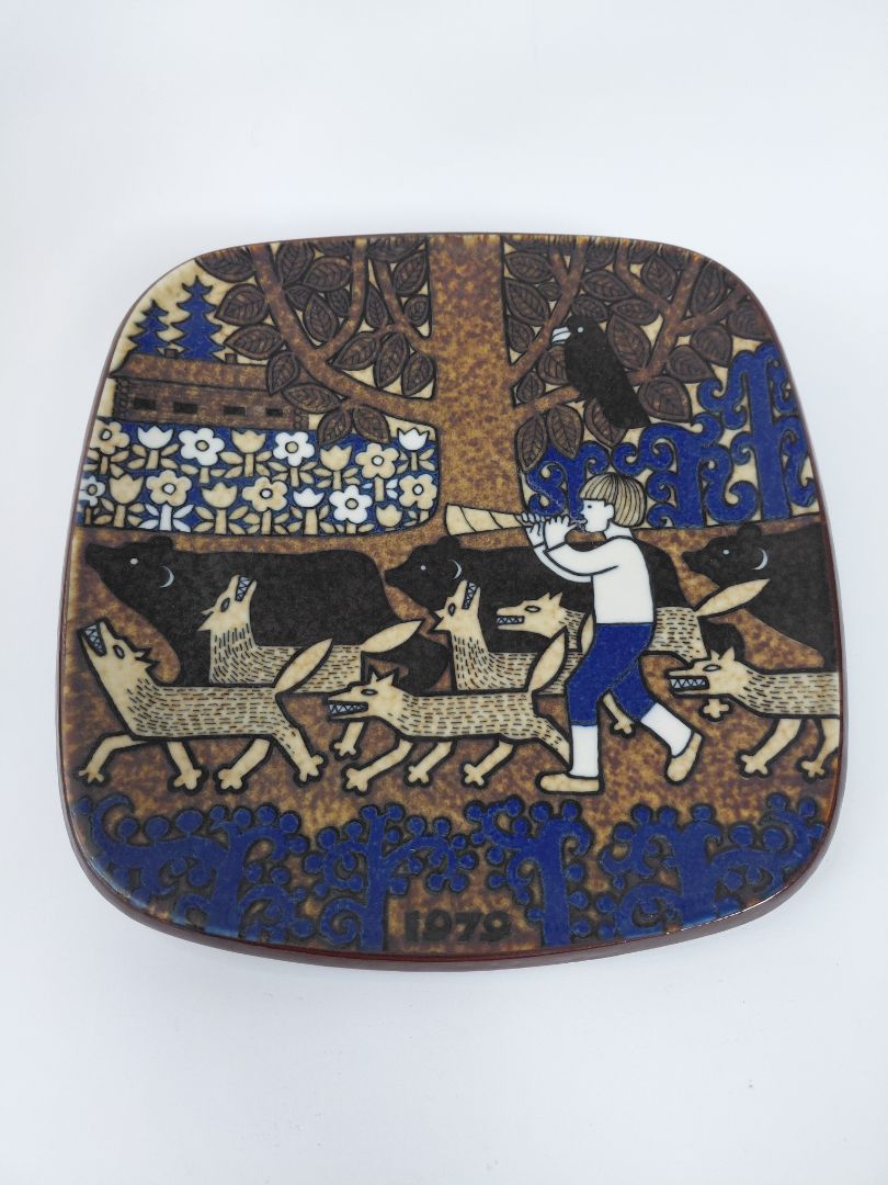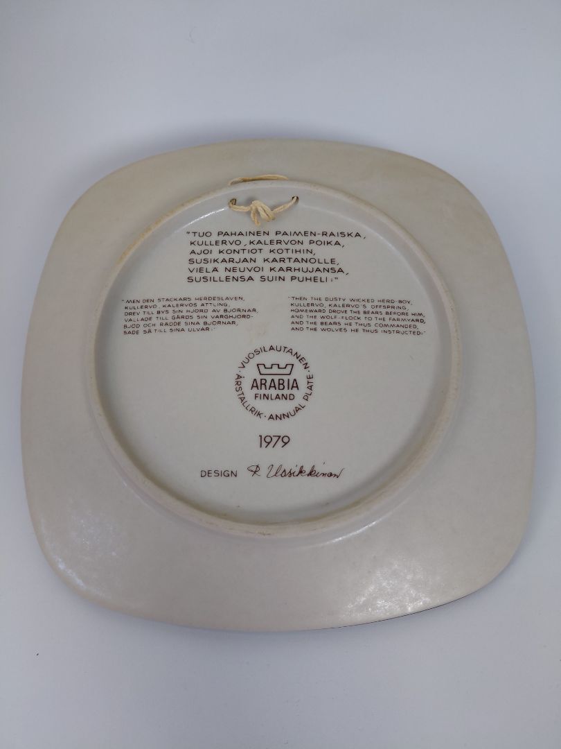 Veggplatti fyrir árið 1979 úr Kalevala línunni frá Arabia Finland, lína sem var framleidd á árunum 1976-1999. Þessi platti var hannaður af Raija Uosikkinen. Verð miðast við söluverð á platta úr sömu línu af vefsíðunni https://www.nordendesign.com