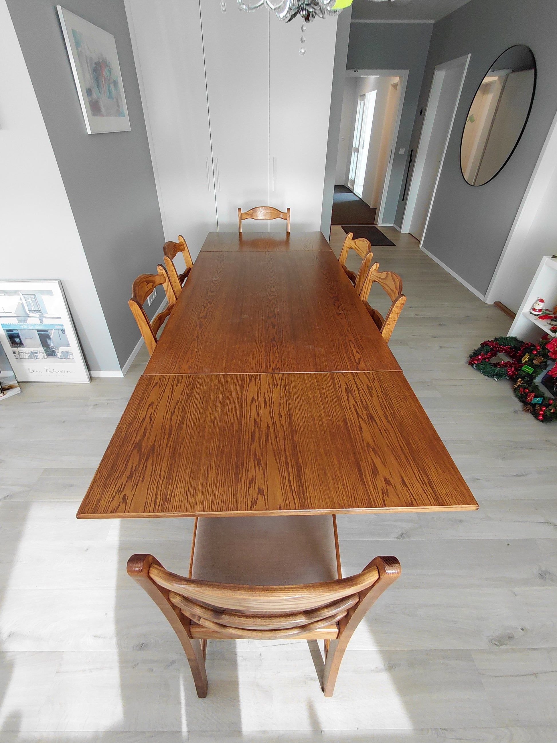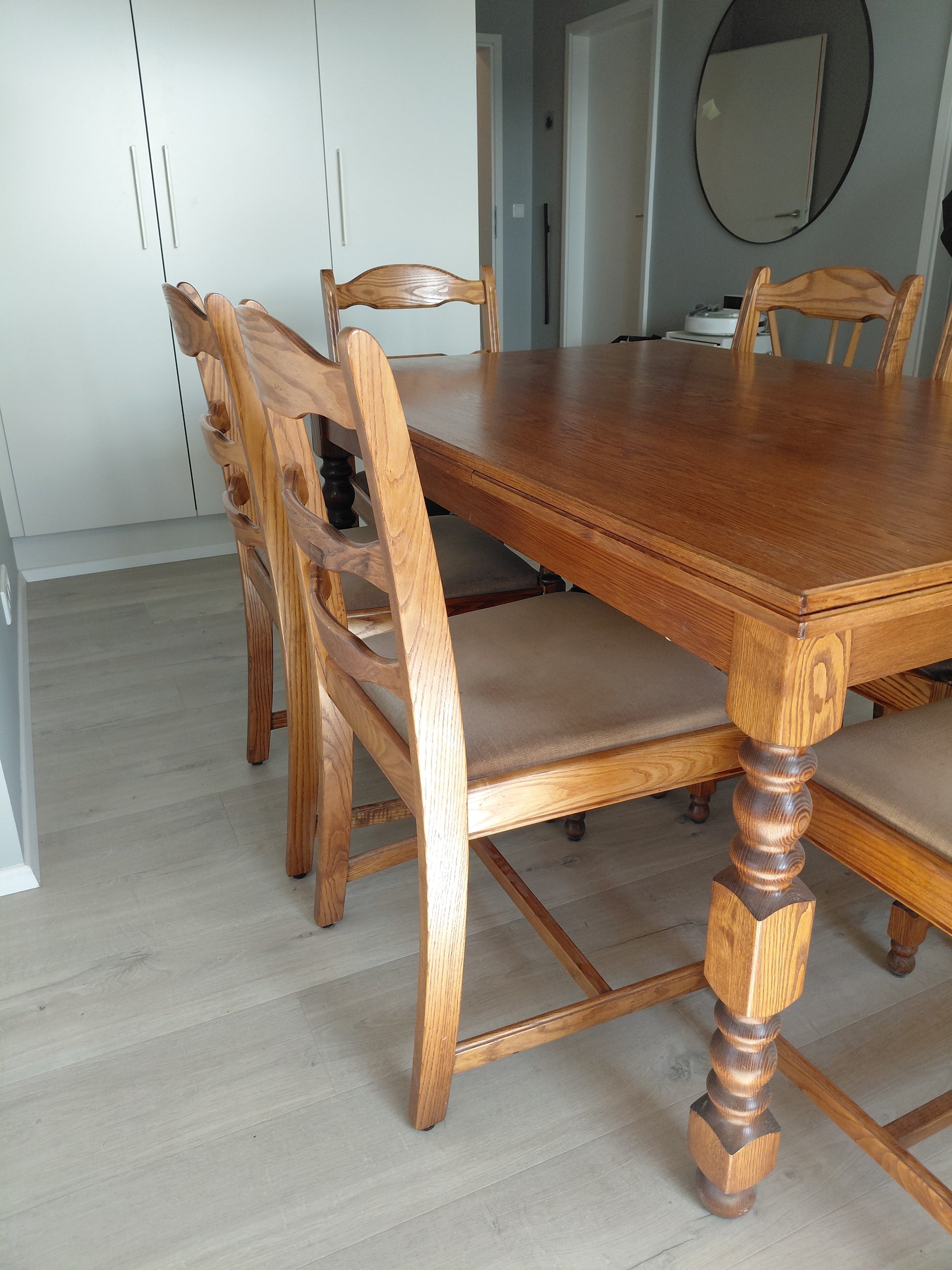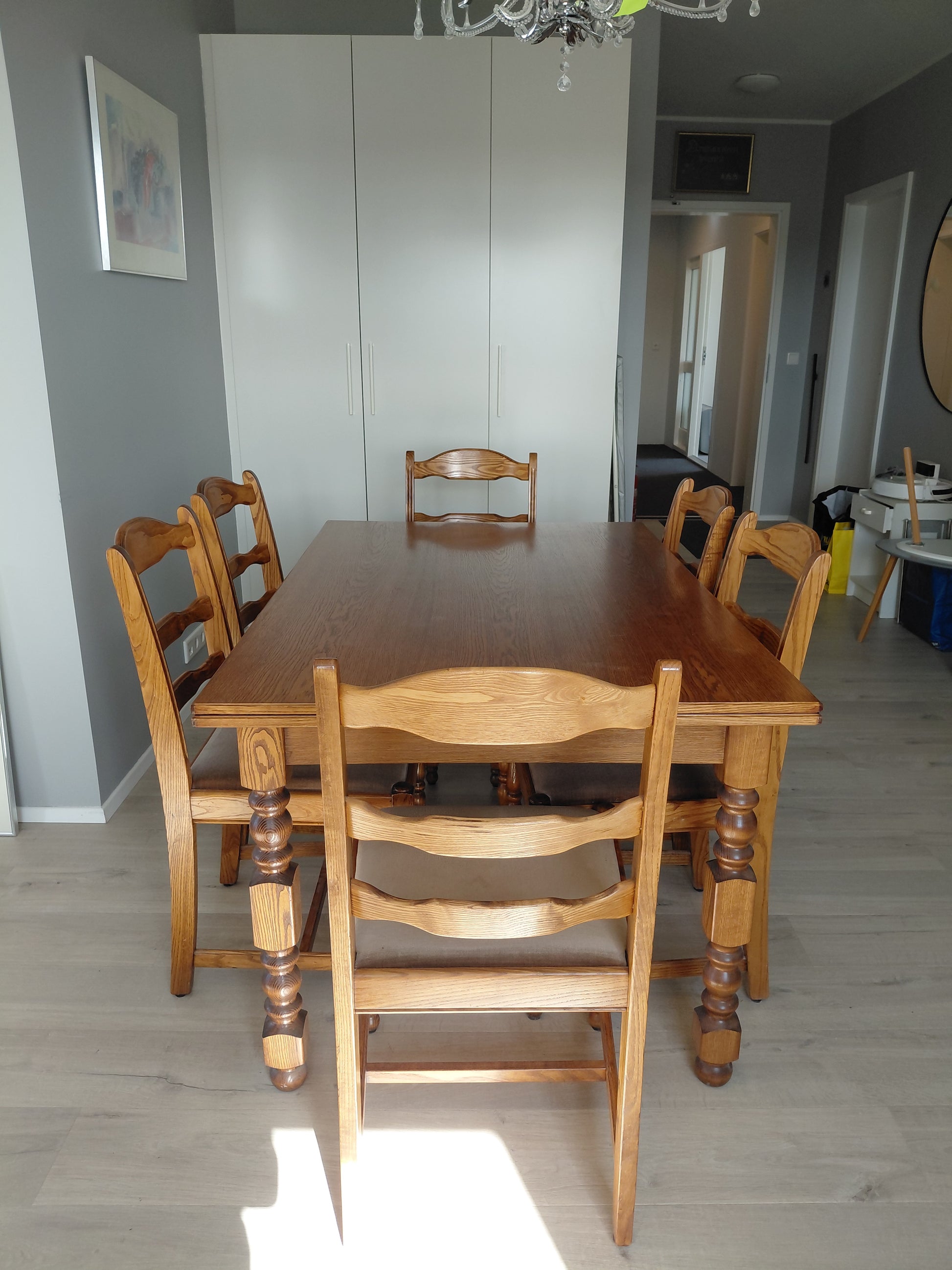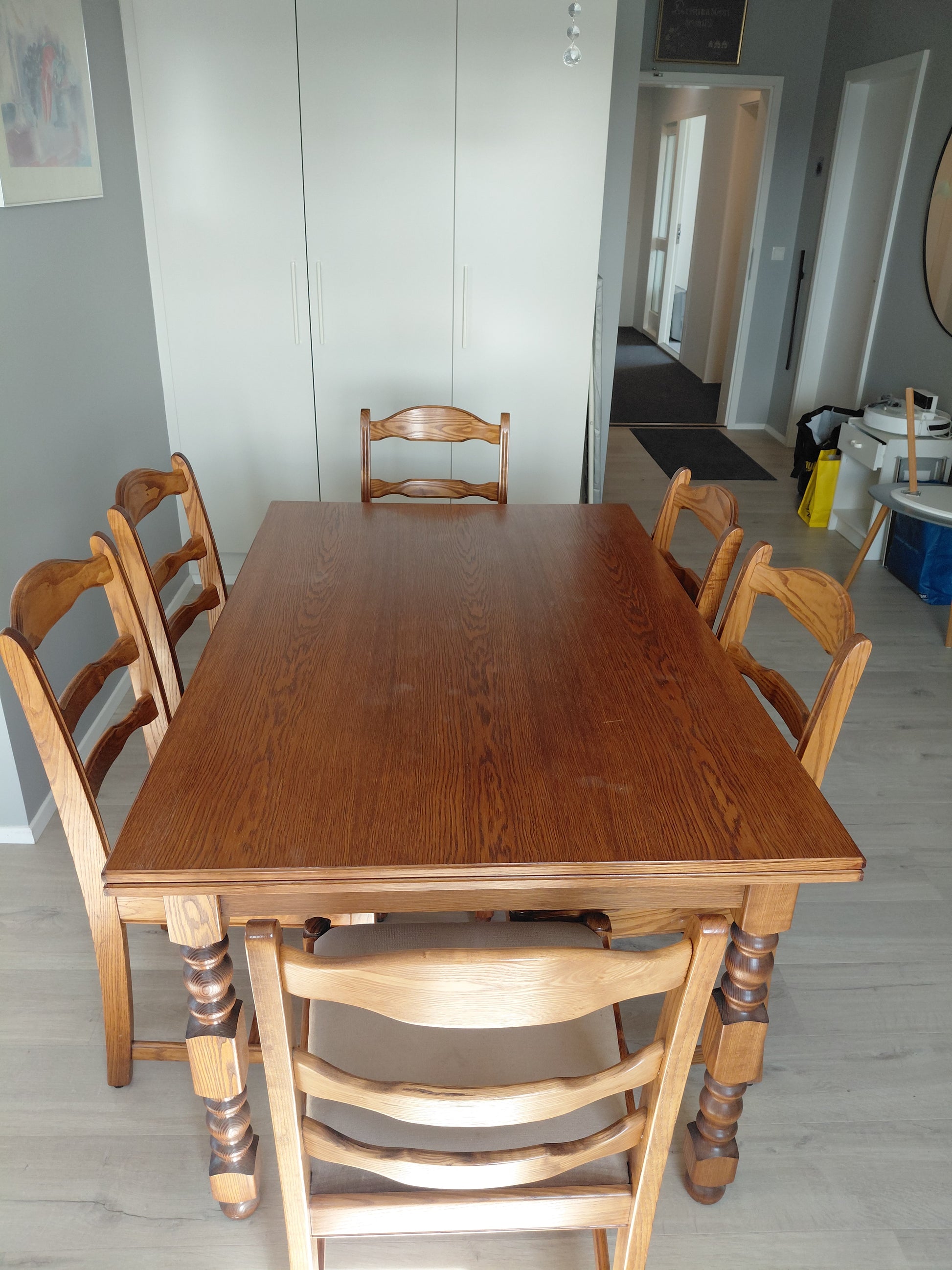Fallegt borðstofuborð, jafnvel eldhúsborð, stækkanlegt í báða enda ásamt 6 stólum í stíl. Eftir stækkum væri hægt að stija allt að 8-10 manns. Stólarnir eru bólstraðir ljósbrúnu/kremuðu bólstri úr einskonar kóngaflaueli og er í mjög góðu standi, aðeins einn stólanna er með áberandi blett (sjá myndir) sem lýsir upp áklæðið. Mögulega næst það úr með djúpreinsun. Tekið er mið af þessu í verði.