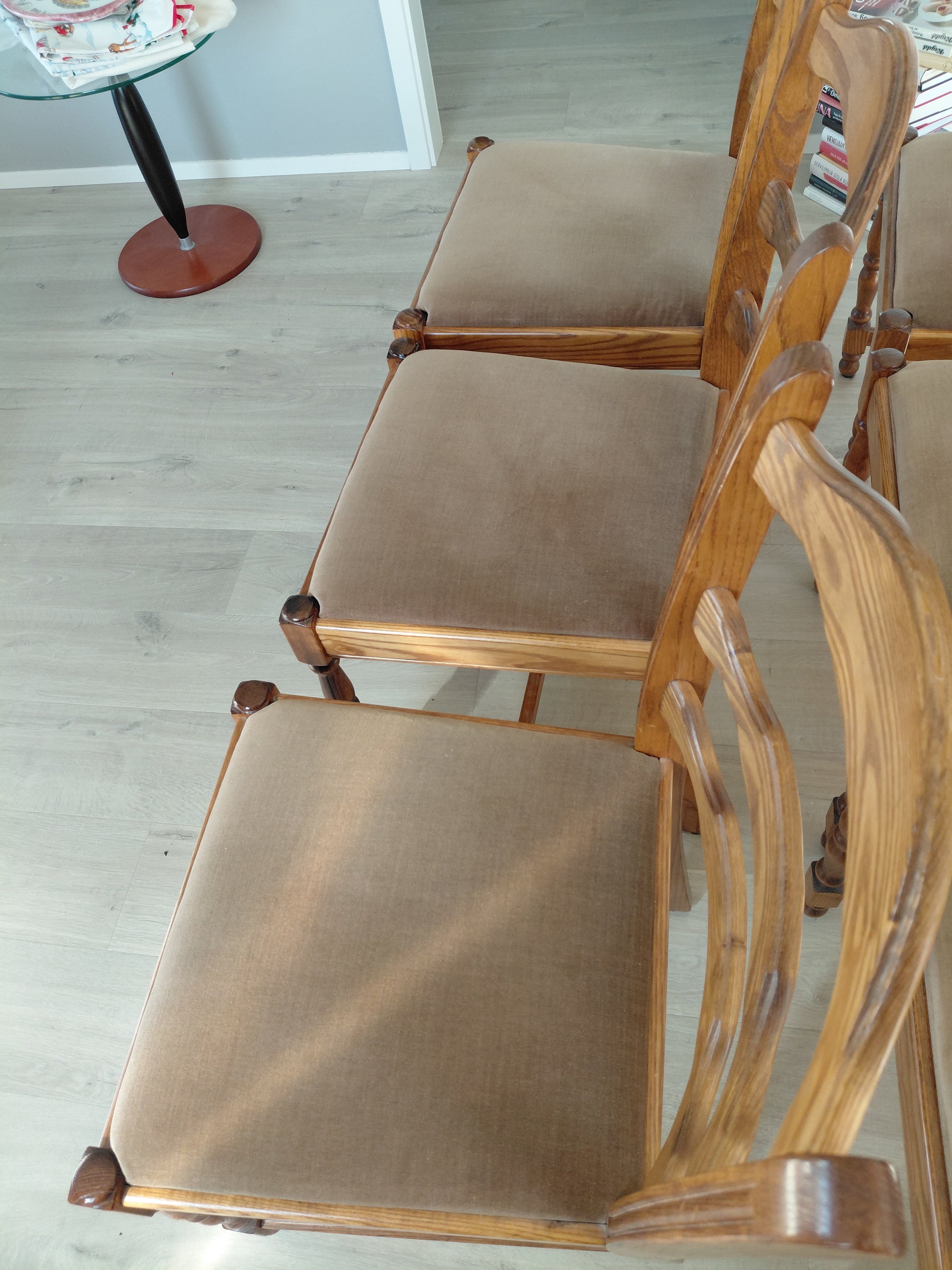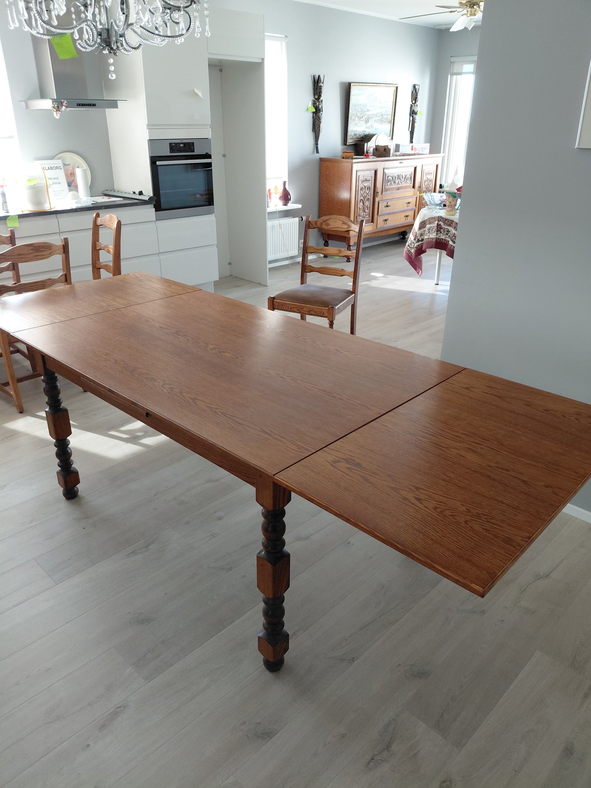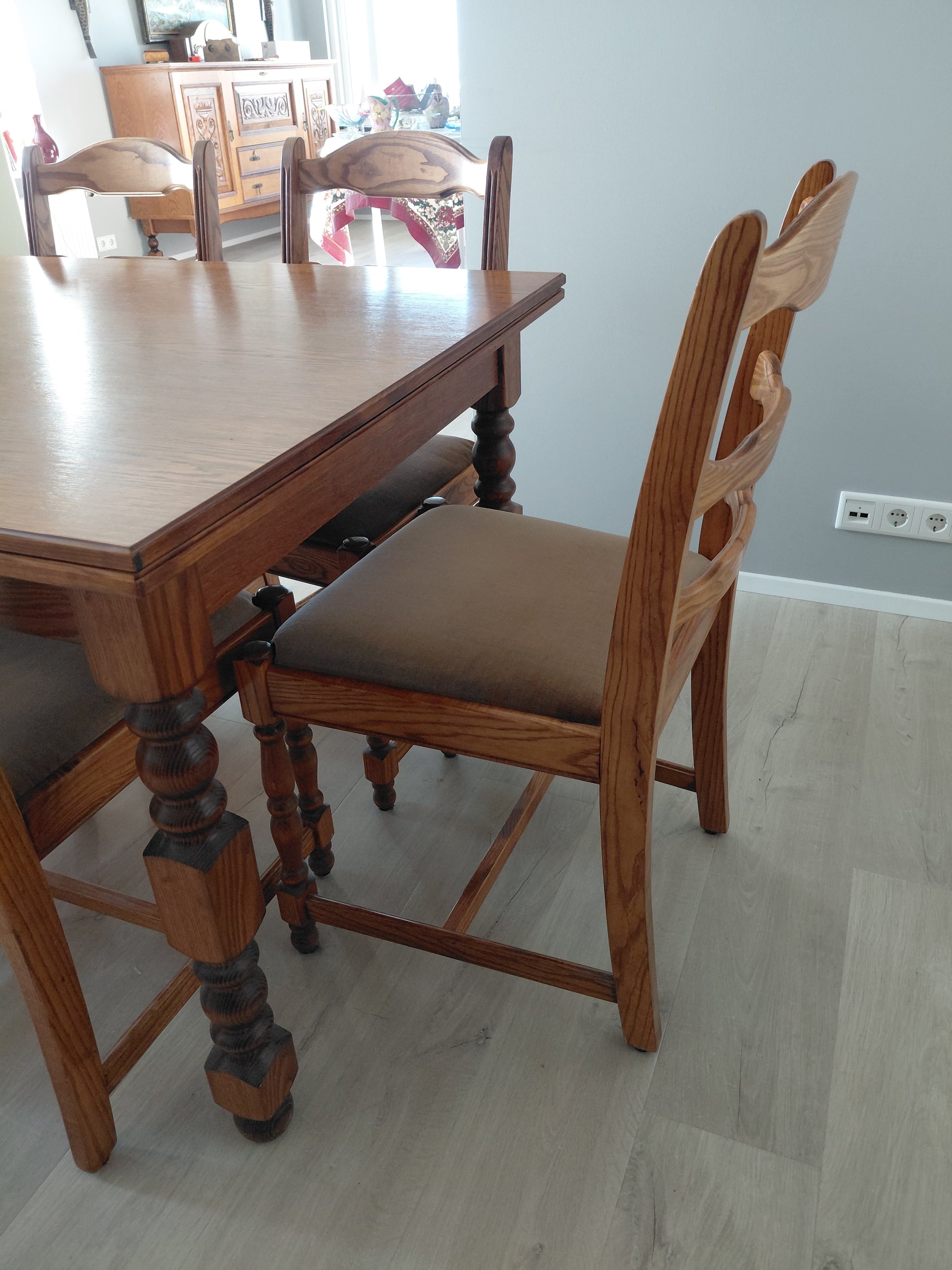 Fallegt borðstofuborð, jafnvel eldhúsborð, stækkanlegt í báða enda ásamt 6 stólum í stíl. Eftir stækkum væri hægt að stija allt að 8-10 manns. Stólarnir eru bólstraðir ljósbrúnu/kremuðu bólstri úr einskonar kóngaflaueli og er í mjög góðu standi, aðeins einn stólanna er með áberandi blett (sjá myndir) sem lýsir upp áklæðið. Mögulega næst það úr með djúpreinsun. Tekið er mið af þessu í verði.