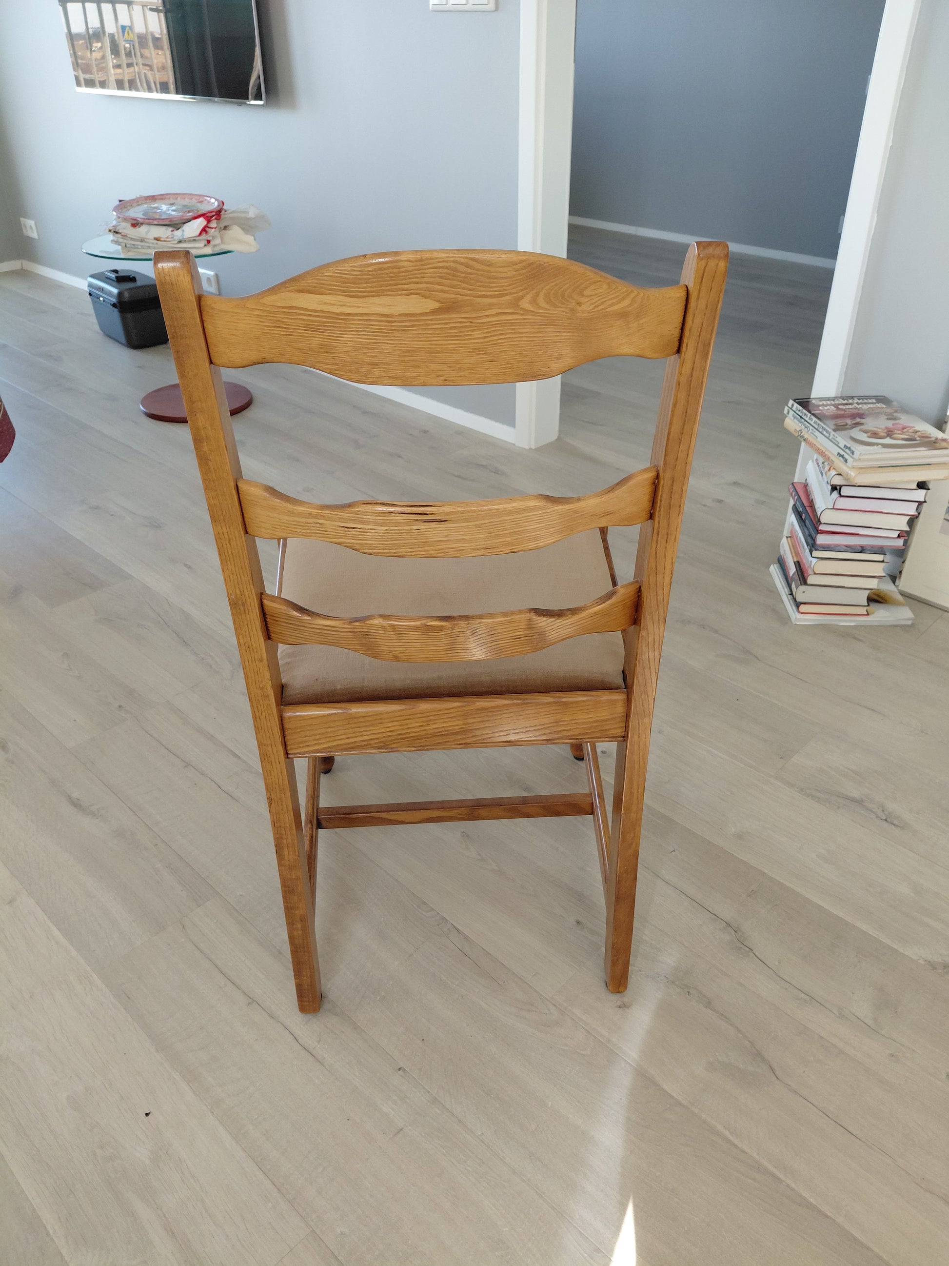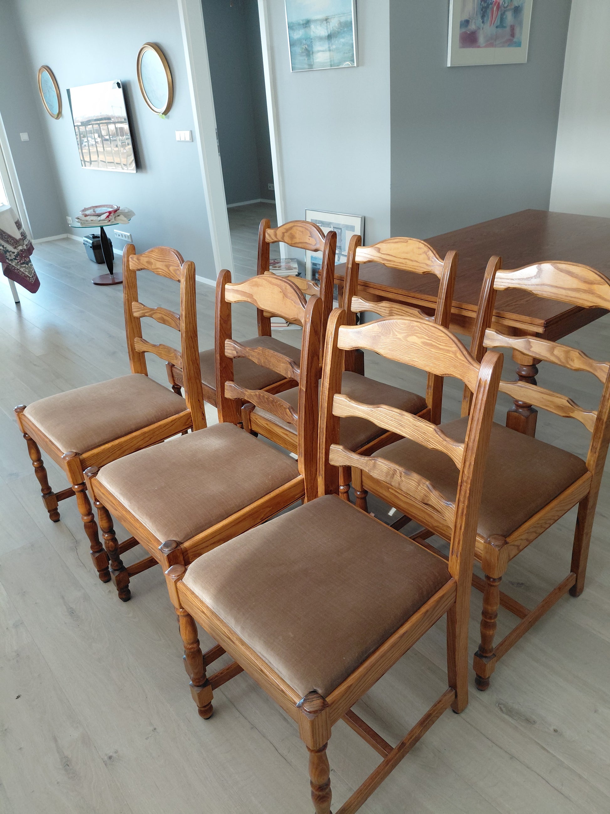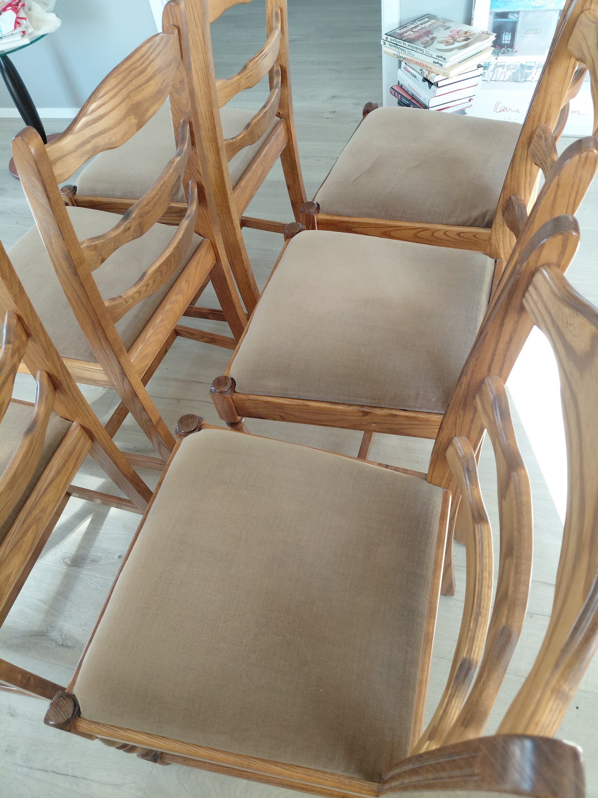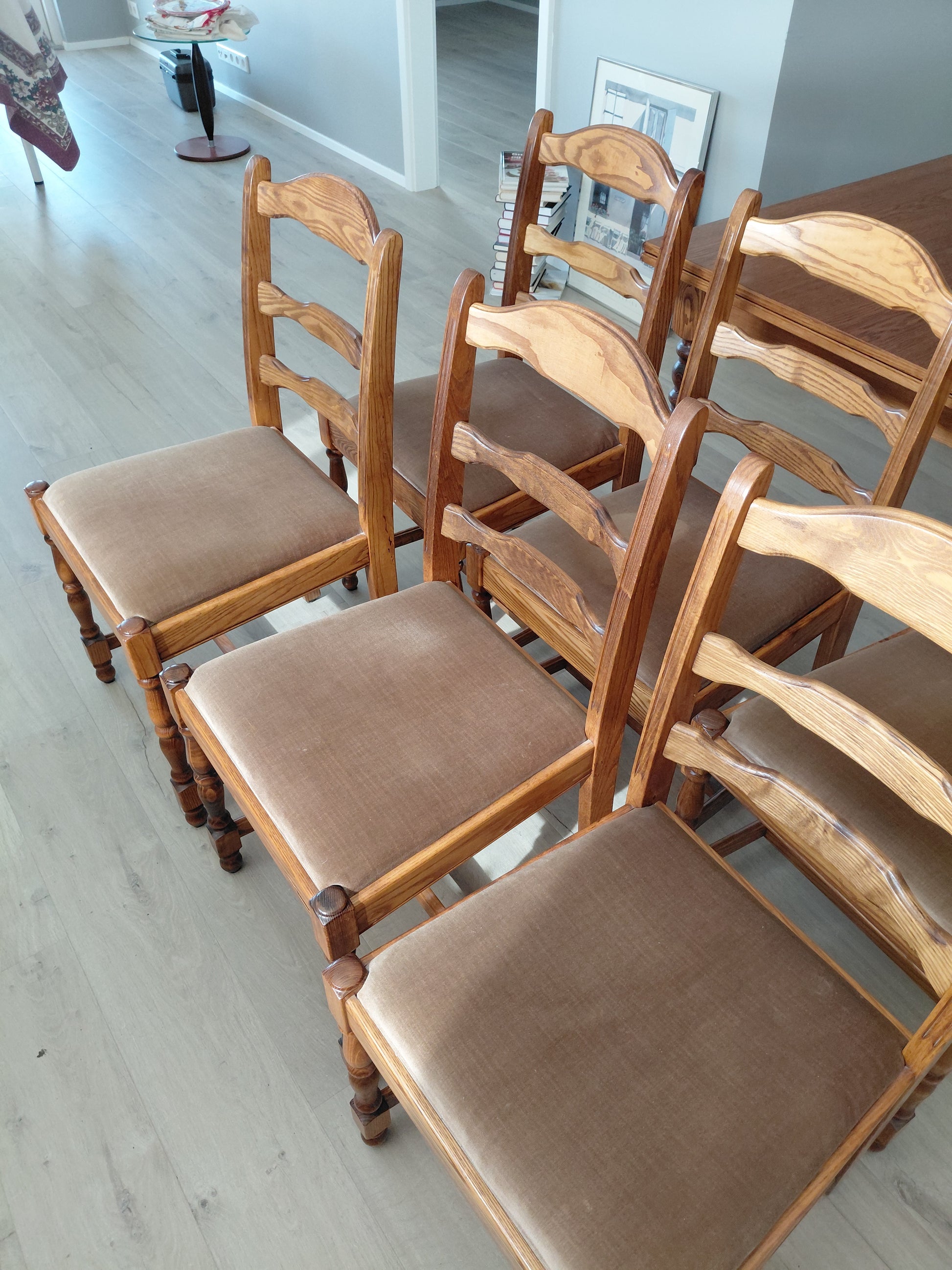 Fallegt borðstofuborð, jafnvel eldhúsborð, stækkanlegt í báða enda ásamt 6 stólum í stíl. Eftir stækkum væri hægt að stija allt að 8-10 manns. Stólarnir eru bólstraðir ljósbrúnu/kremuðu bólstri úr einskonar kóngaflaueli og er í mjög góðu standi, aðeins einn stólanna er með áberandi blett (sjá myndir) sem lýsir upp áklæðið. Mögulega næst það úr með djúpreinsun. Tekið er mið af þessu í verði.