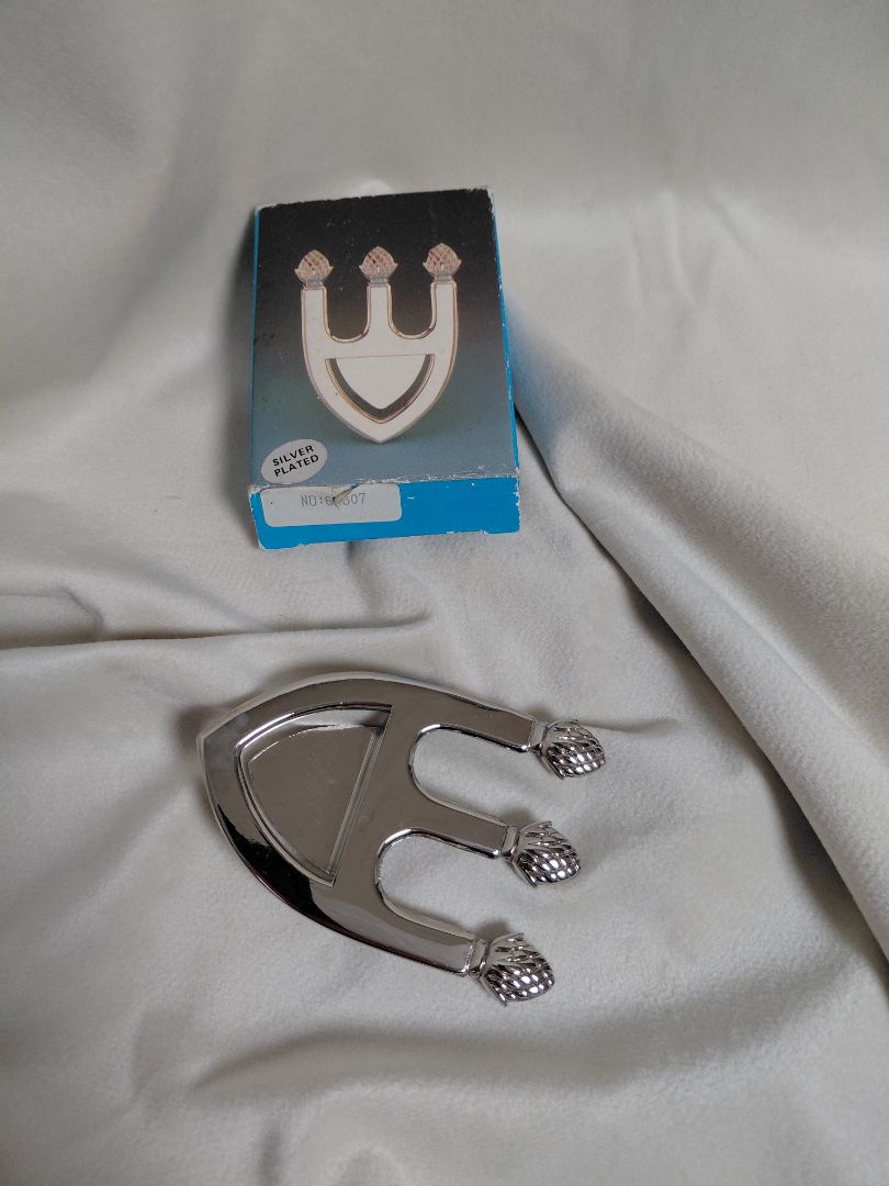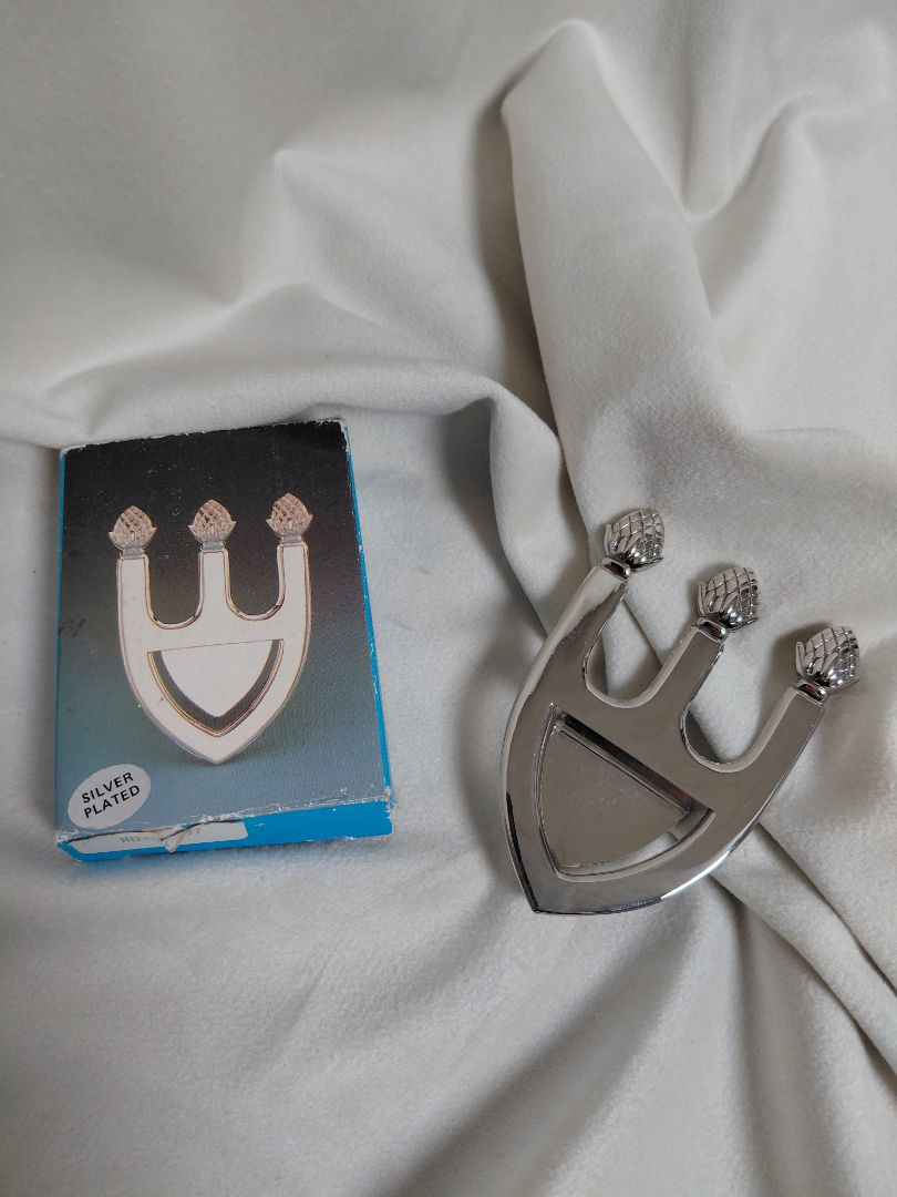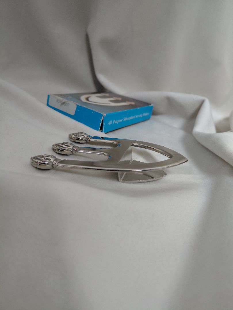Fallegur silfur húðaður skeiðahaldari í kórónu sniði. Haldarinn er festur á kantinn á skál og skeiðinn hvílir á þessum haldara. Þessi vara kemur í sínum upphaflegu umbúðum.