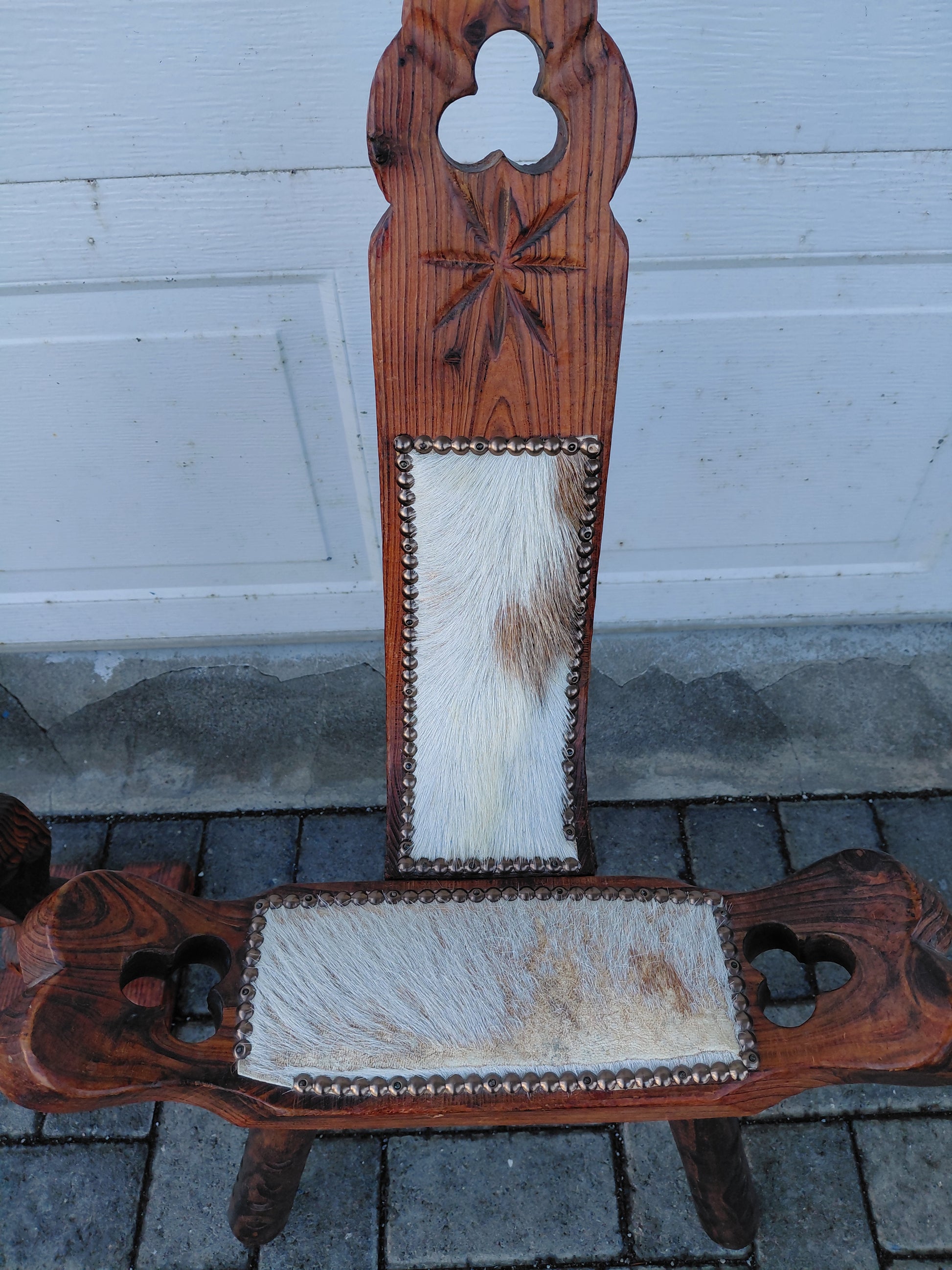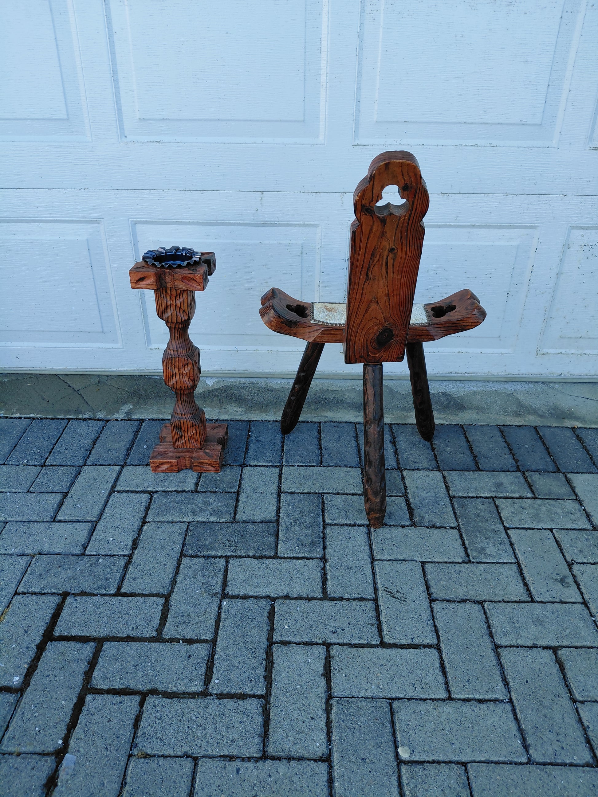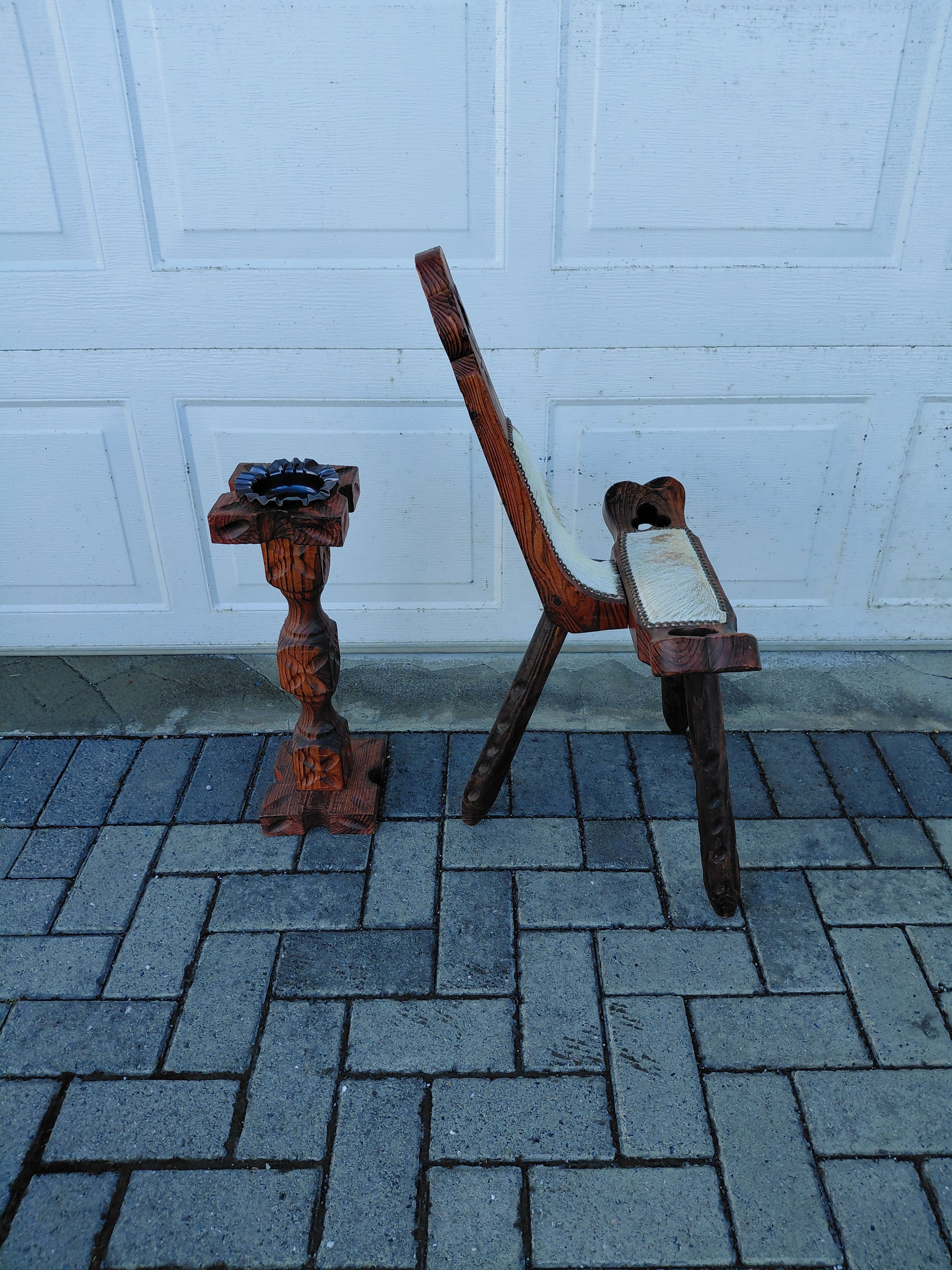 Stóll ásamt kertastandi, þetta sett er spænsk hönnun frá 1960-1970 með innblástur af stólum sem upphaflega voru notaðir sem fæðingastólar en urðu síðar vinsælt stofudjáns. Settið er handgert og útskortið og er stóllinn bólstraður að öllum líkindum með geitaskinni sem hárin hafa farið af á afmörkuðu svæði á sessu, sjá myndir. Þetta er ekki að eyðileggja útlitið á stólunum en gert er ráð fyrir þessu í verði.
