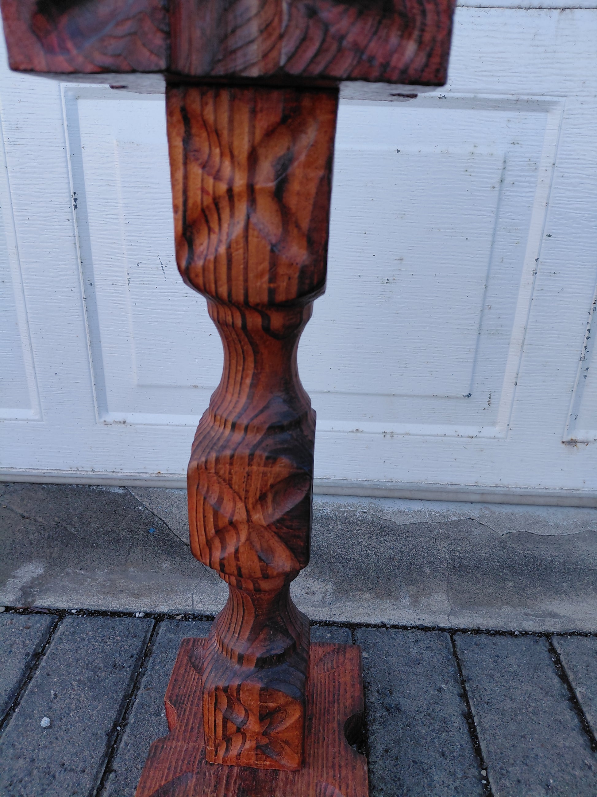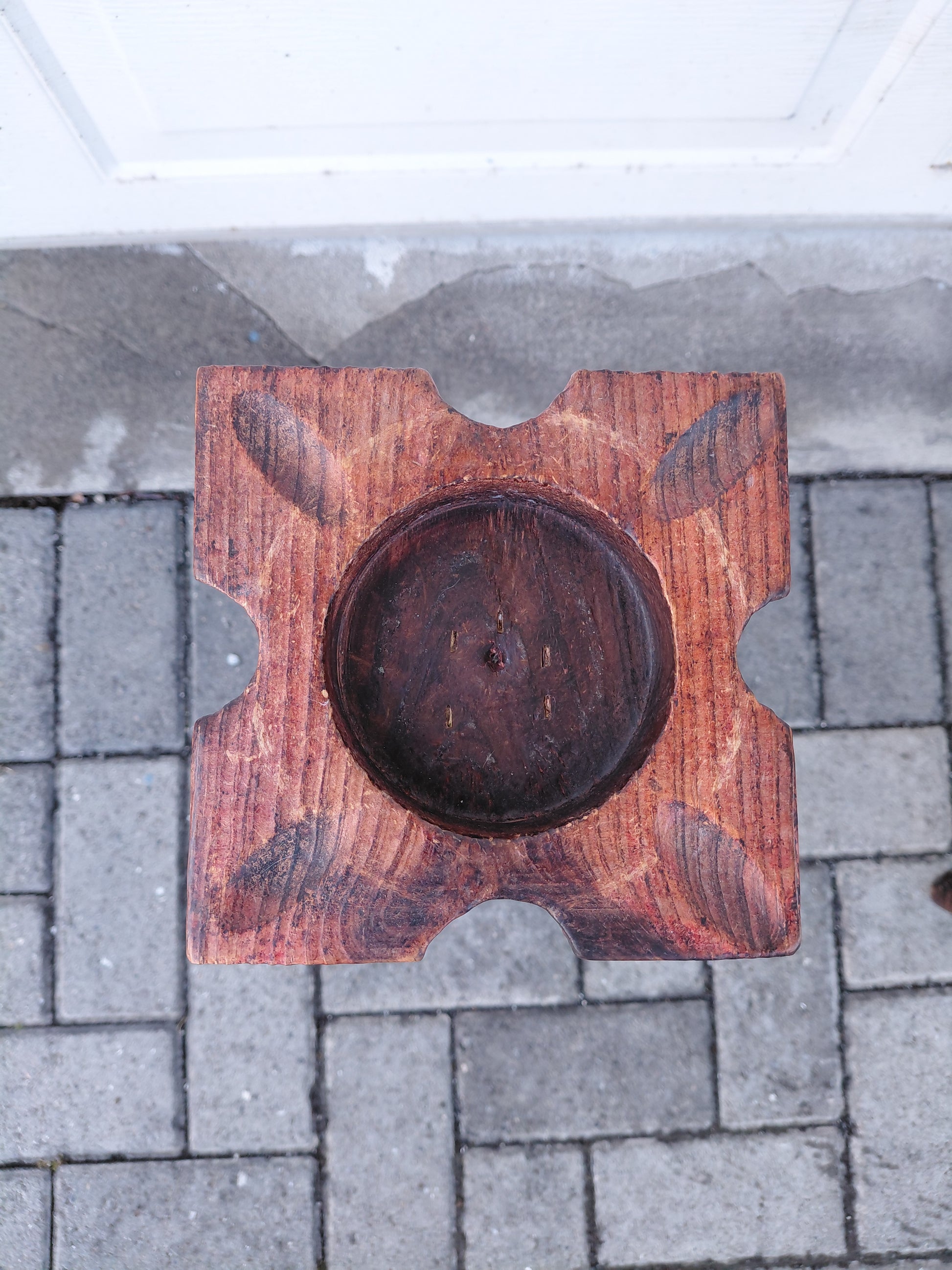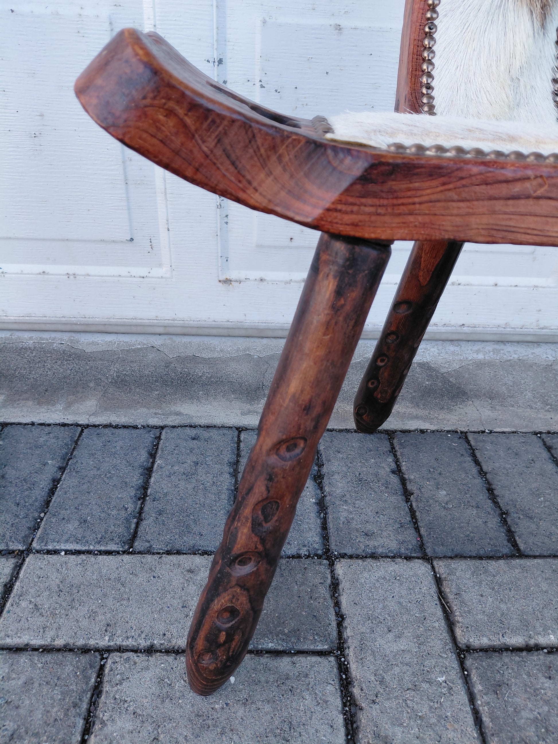 Stóll ásamt kertastandi, þetta sett er spænsk hönnun frá 1960-1970 með innblástur af stólum sem upphaflega voru notaðir sem fæðingastólar en urðu síðar vinsælt stofudjáns. Settið er handgert og útskortið og er stóllinn bólstraður að öllum líkindum með geitaskinni sem hárin hafa farið af á afmörkuðu svæði á sessu, sjá myndir. Þetta er ekki að eyðileggja útlitið á stólunum en gert er ráð fyrir þessu í verði.