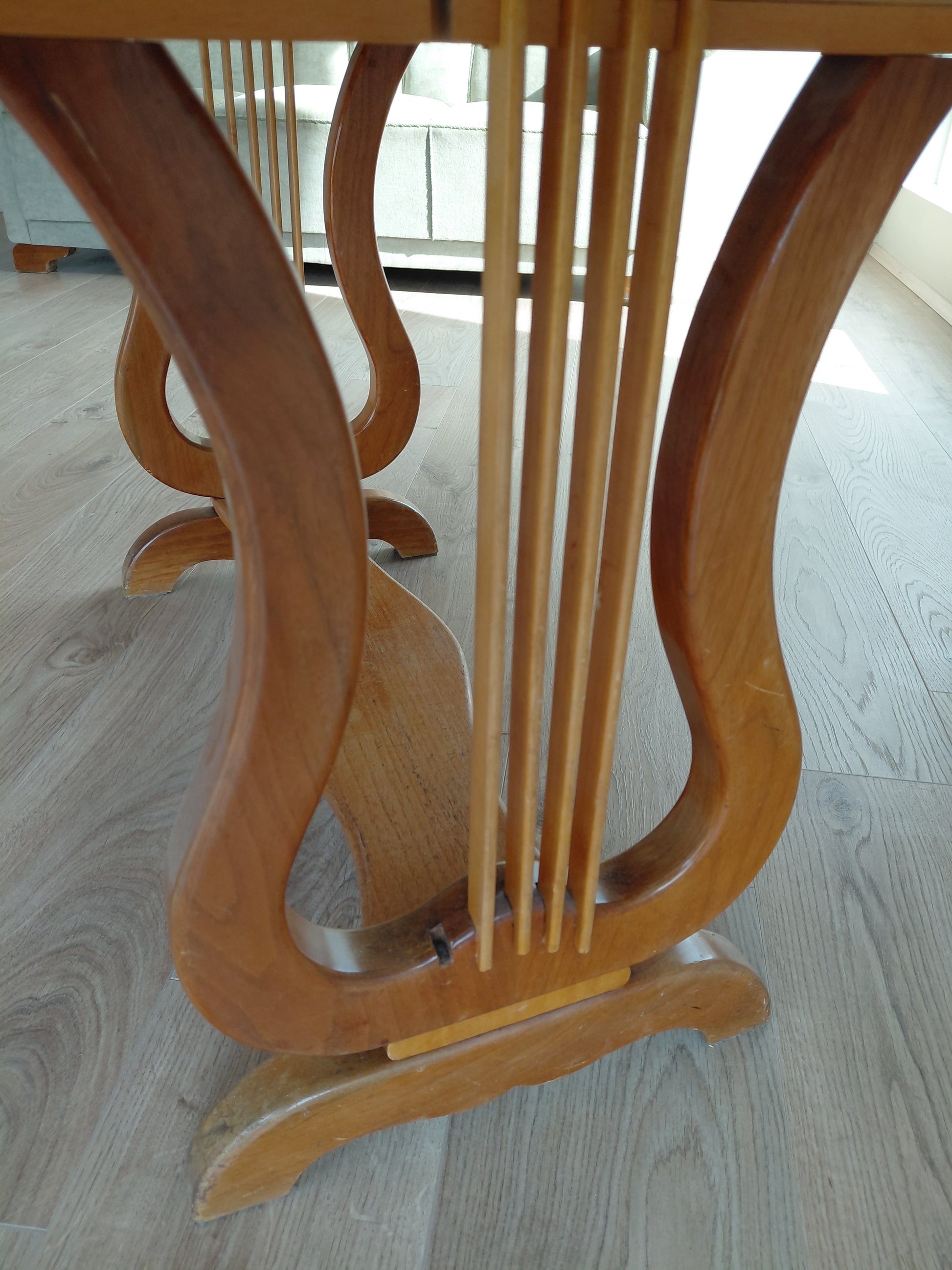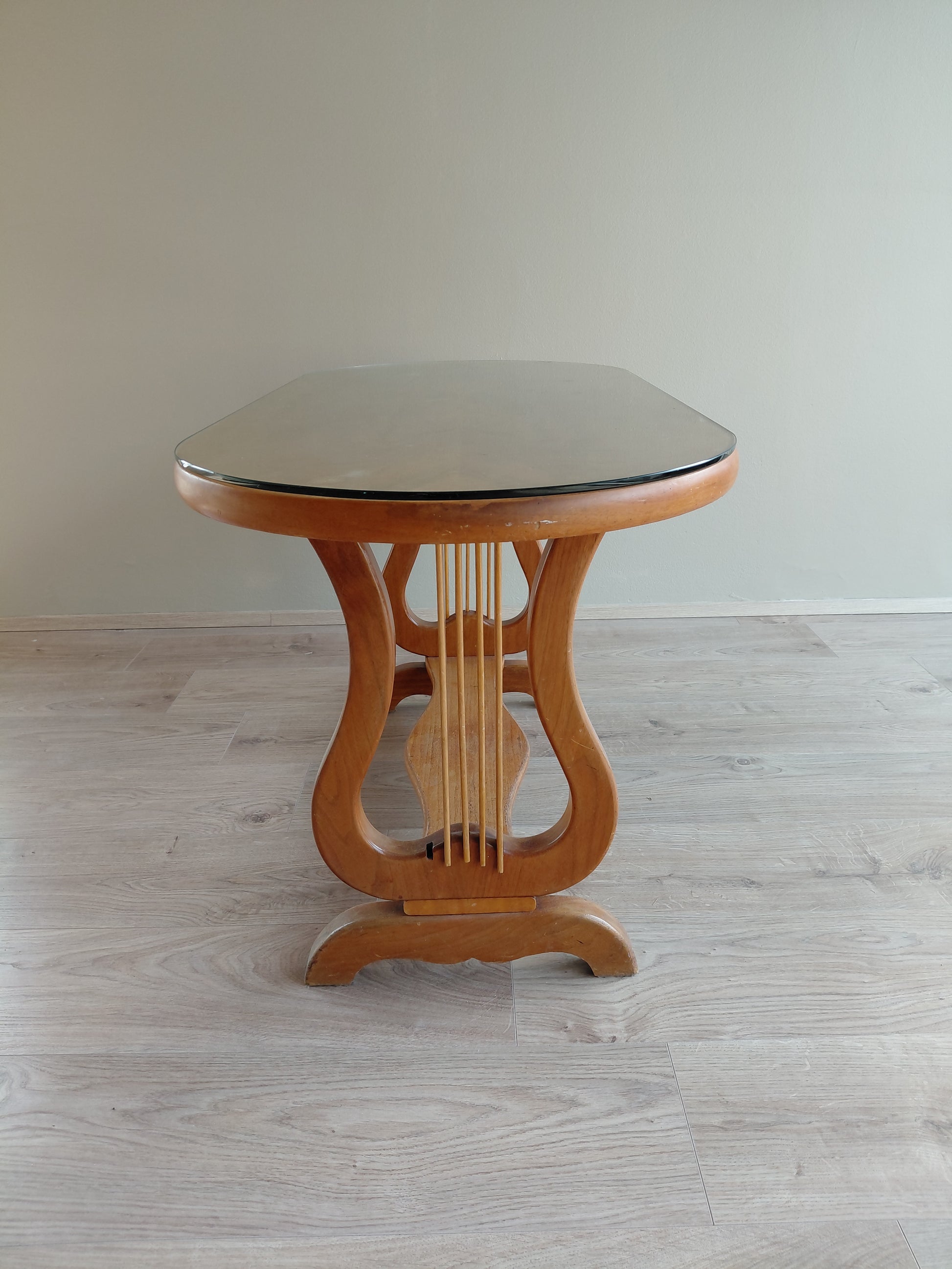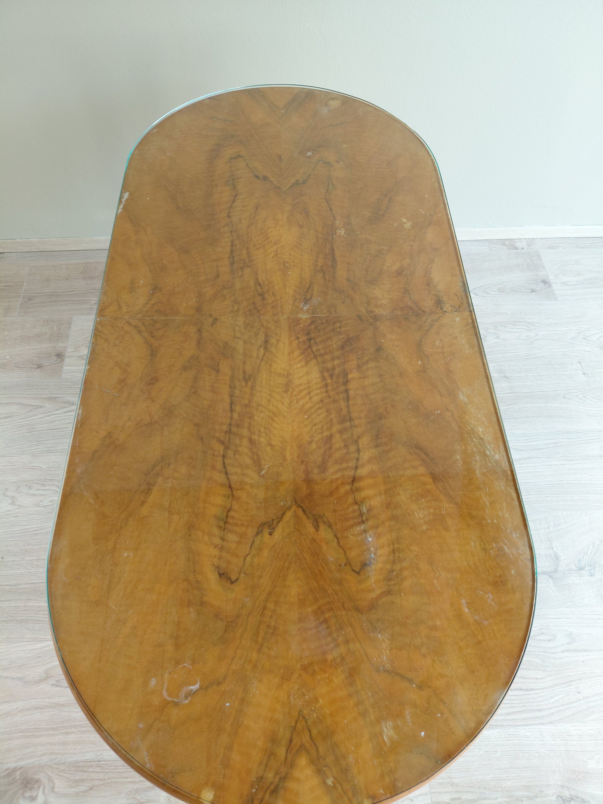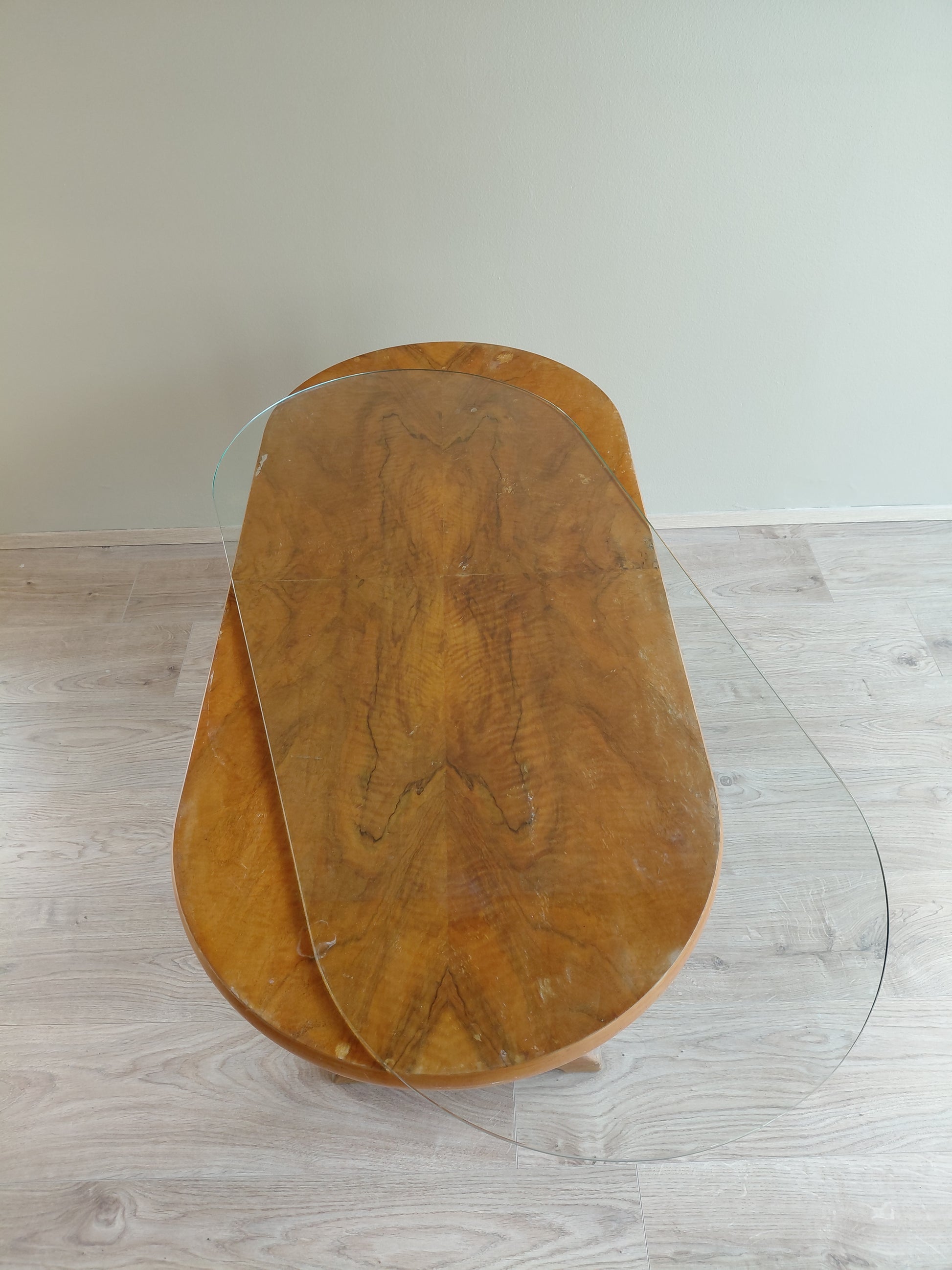 Þetta er fágað og tímalaust stofuborð í Art Deco stíl úr valhnetu við, líklega frá miðri 20. öld (u.þ.b. 1940–1950). Borðið ber einkenni ítalskar hönnunar þess tíma, þar sem lögð var áhersla á mjúkar línur og vandað handverk. Borðið er með glerplötu sem fylgir lögun þess og er hægt að taka af og hafa borðið án hennar. Örlítið sést á borðplötunni sem gefur borðinu mikinn sjarma og sál.